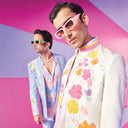 Cream Bandhgala Sets with Embroidered Floral Work Bomber Jacket and Pants.