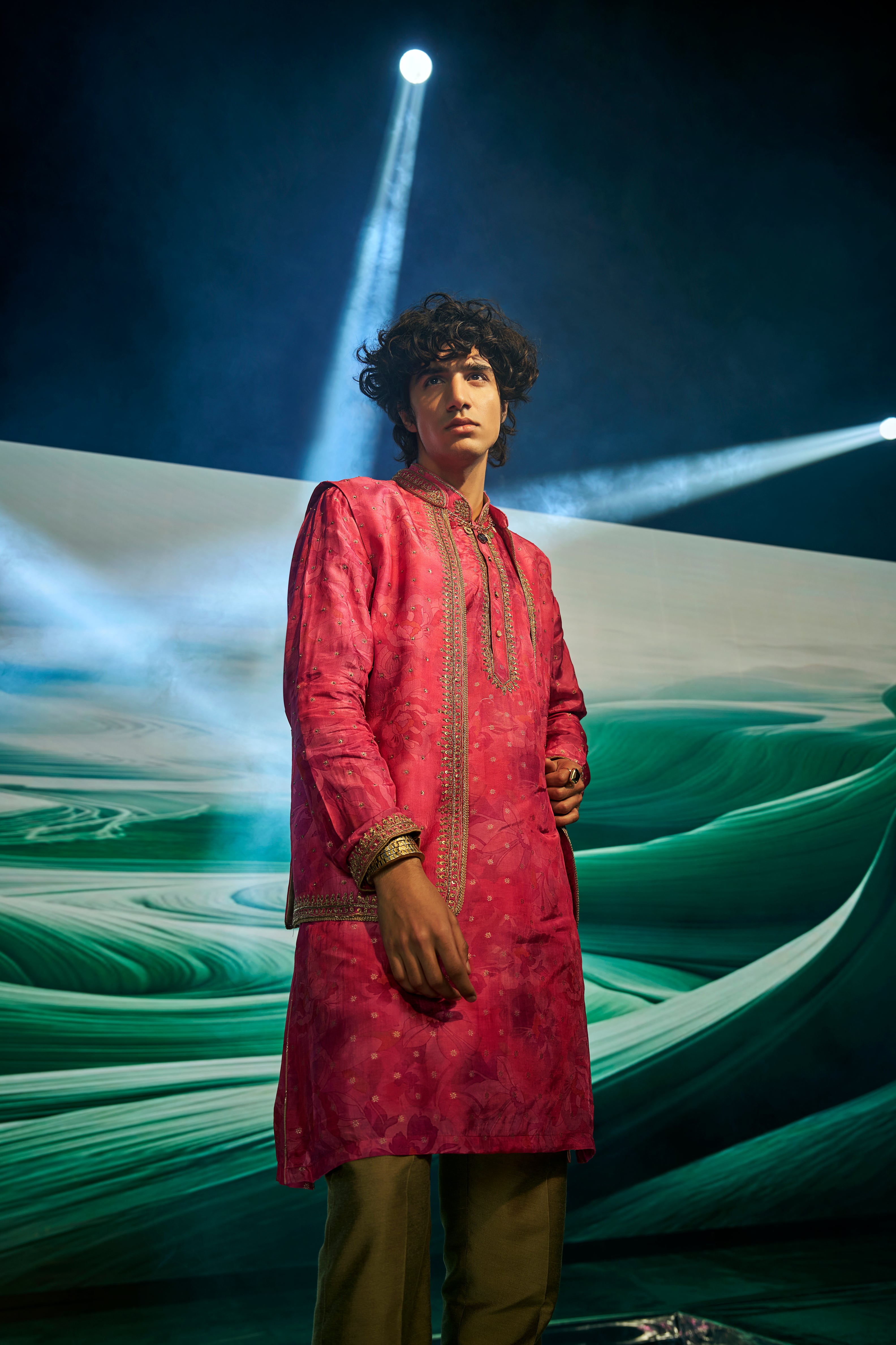 Pink symbolises love, compassion, and harmony, making it the perfect colour to close the 9 days of Navratri. This pink kurta jacket set for men with floral print and gold highlights is festive, stylish, and celebratory.