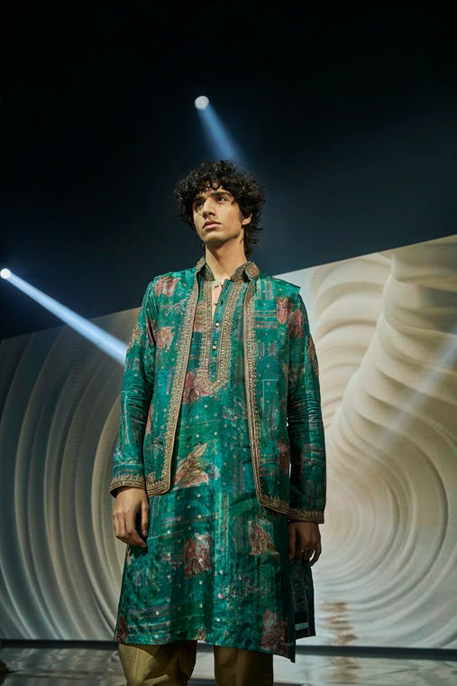 Peacock Green reflects uniqueness and vibrancy. This peacock green kurta set for men with floral print and gold highlight embroidery is designed for those who want to make a statement during Navratri.