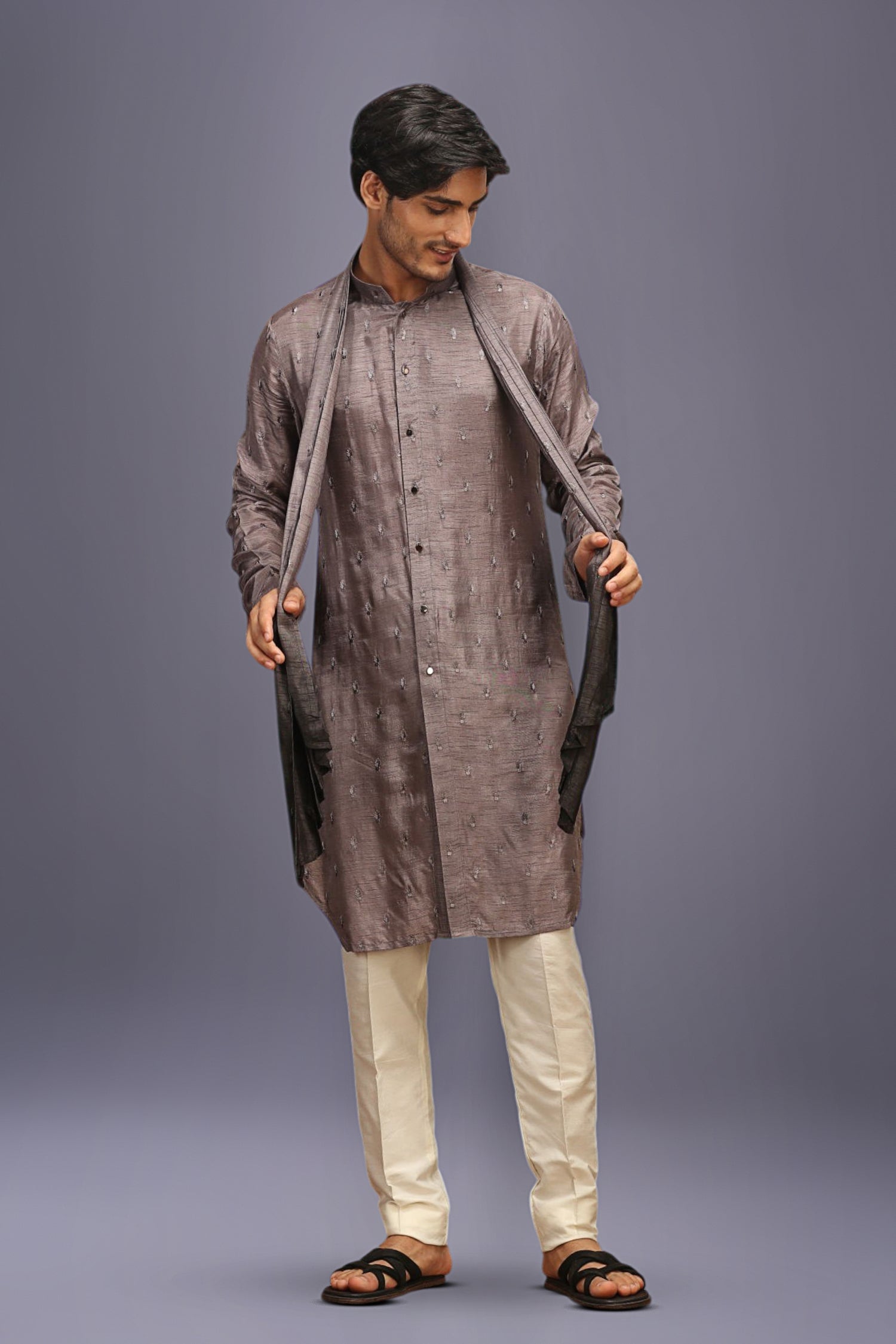 Grey is associated with balance and neutrality, and this grey kurta set for men with an embroidered ombre dupatta is the perfect way to celebrate Navratri in understated style.