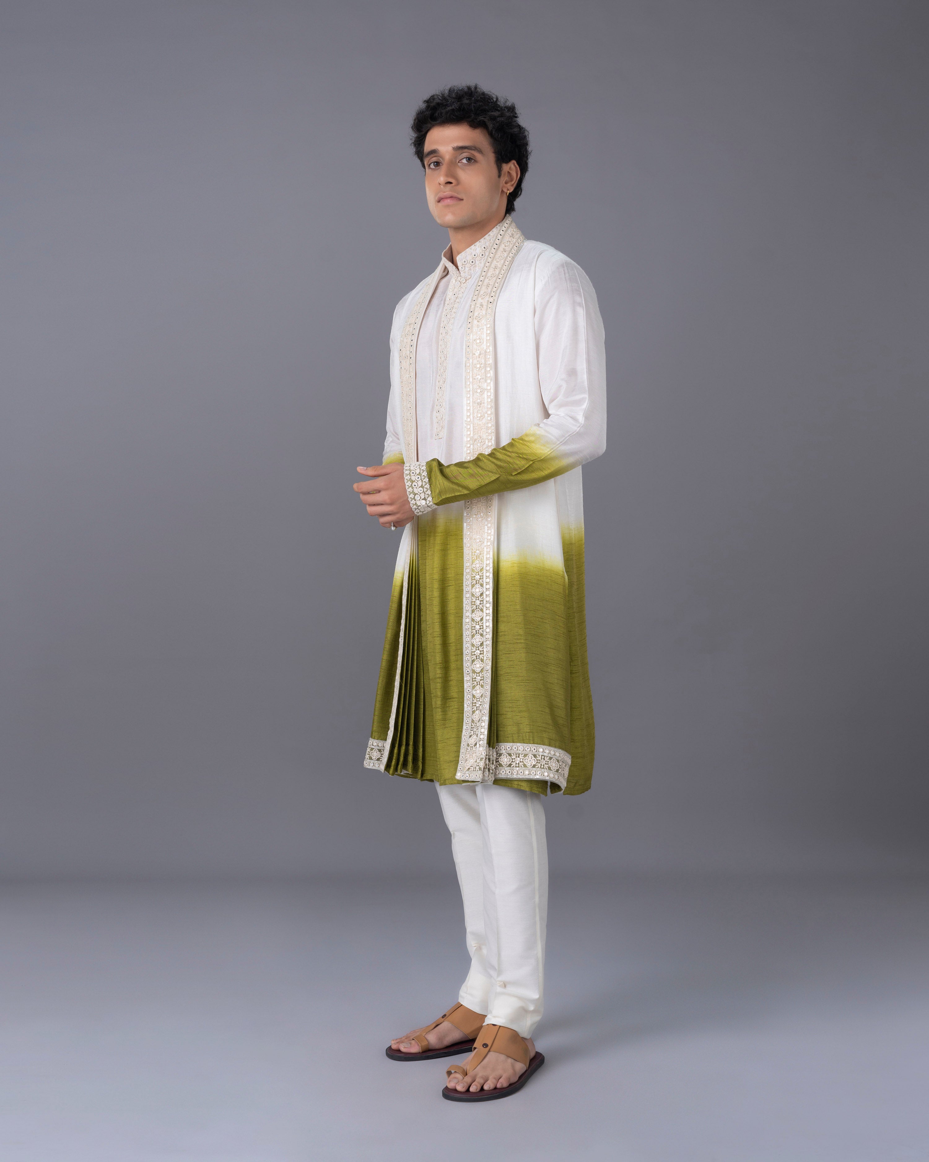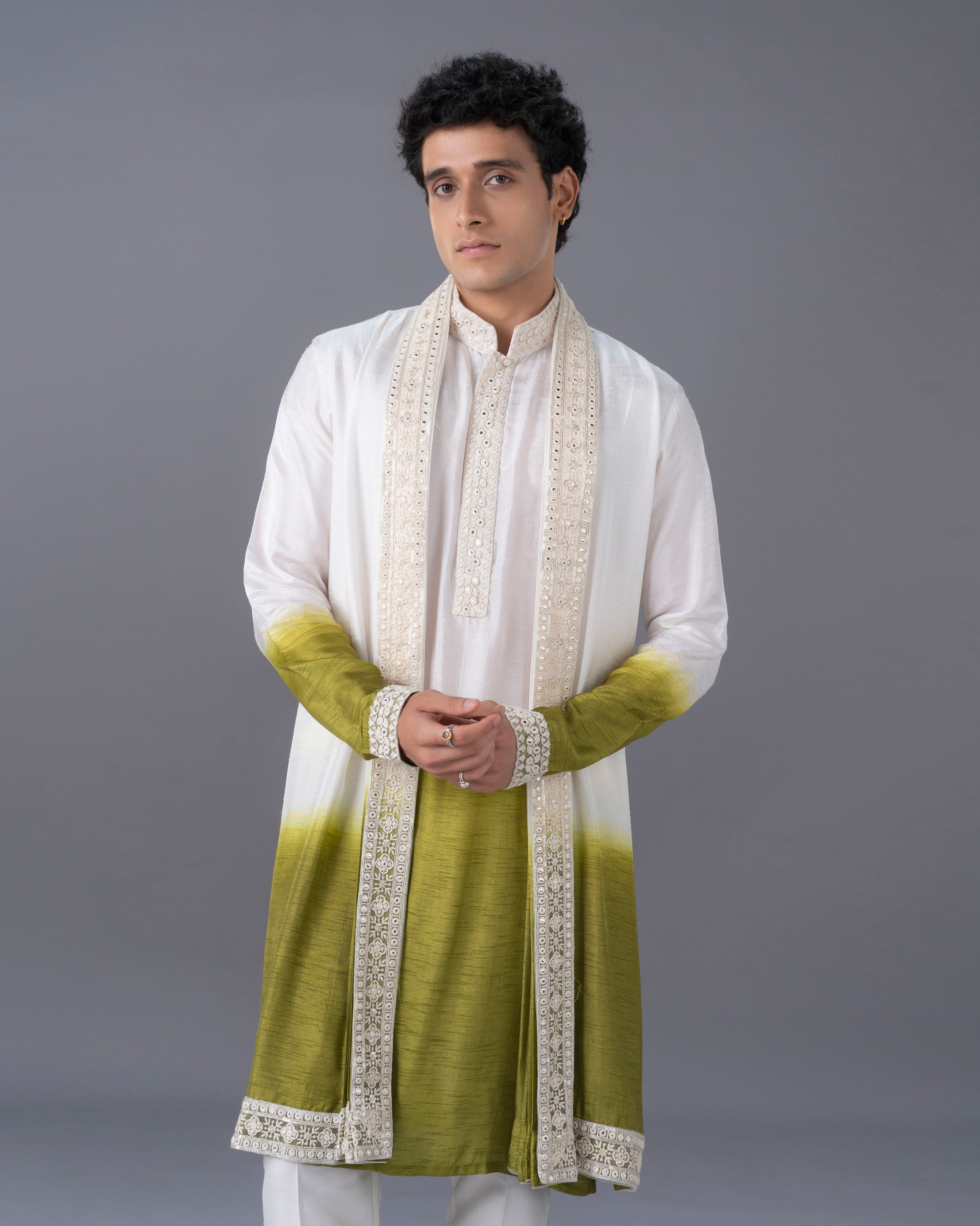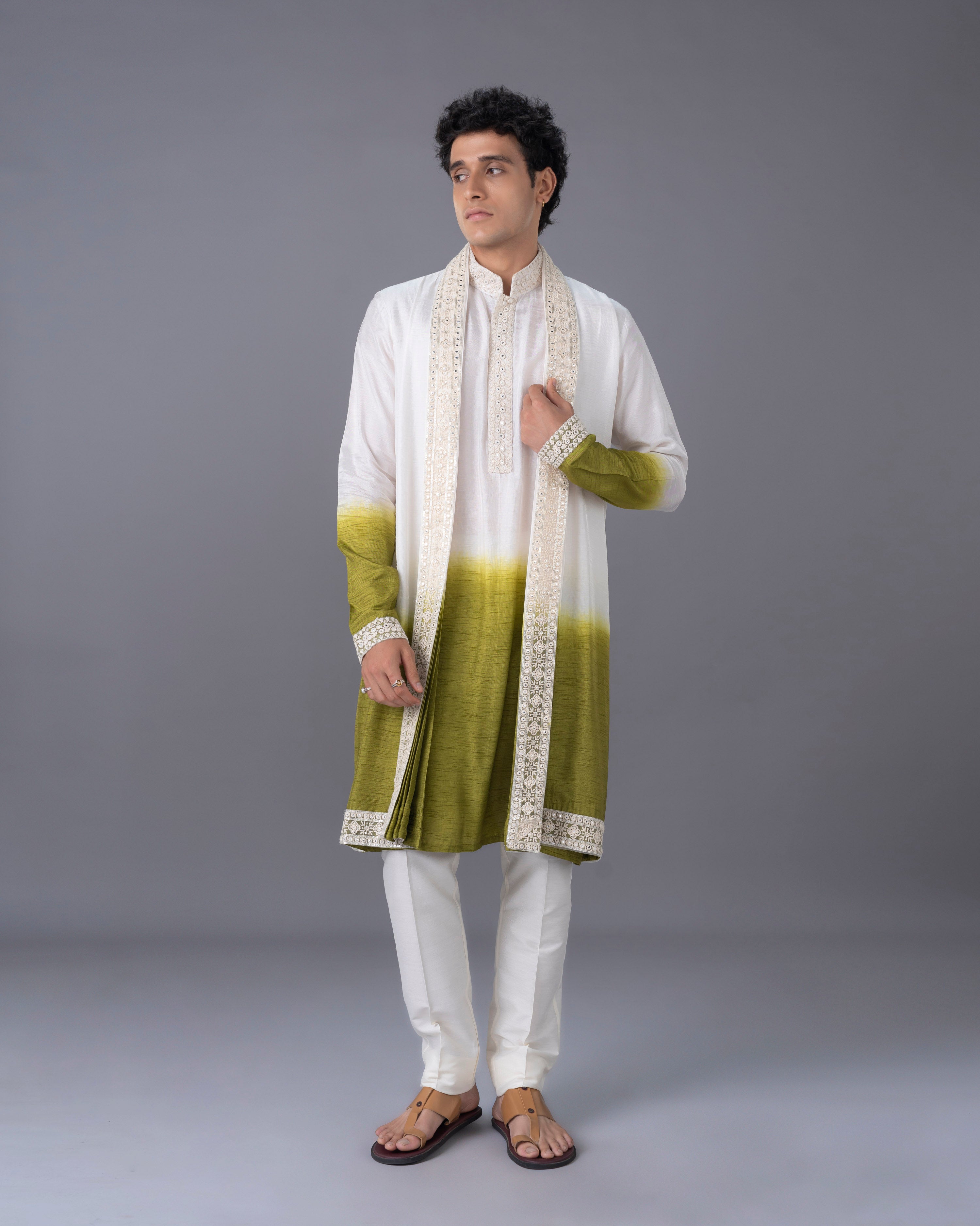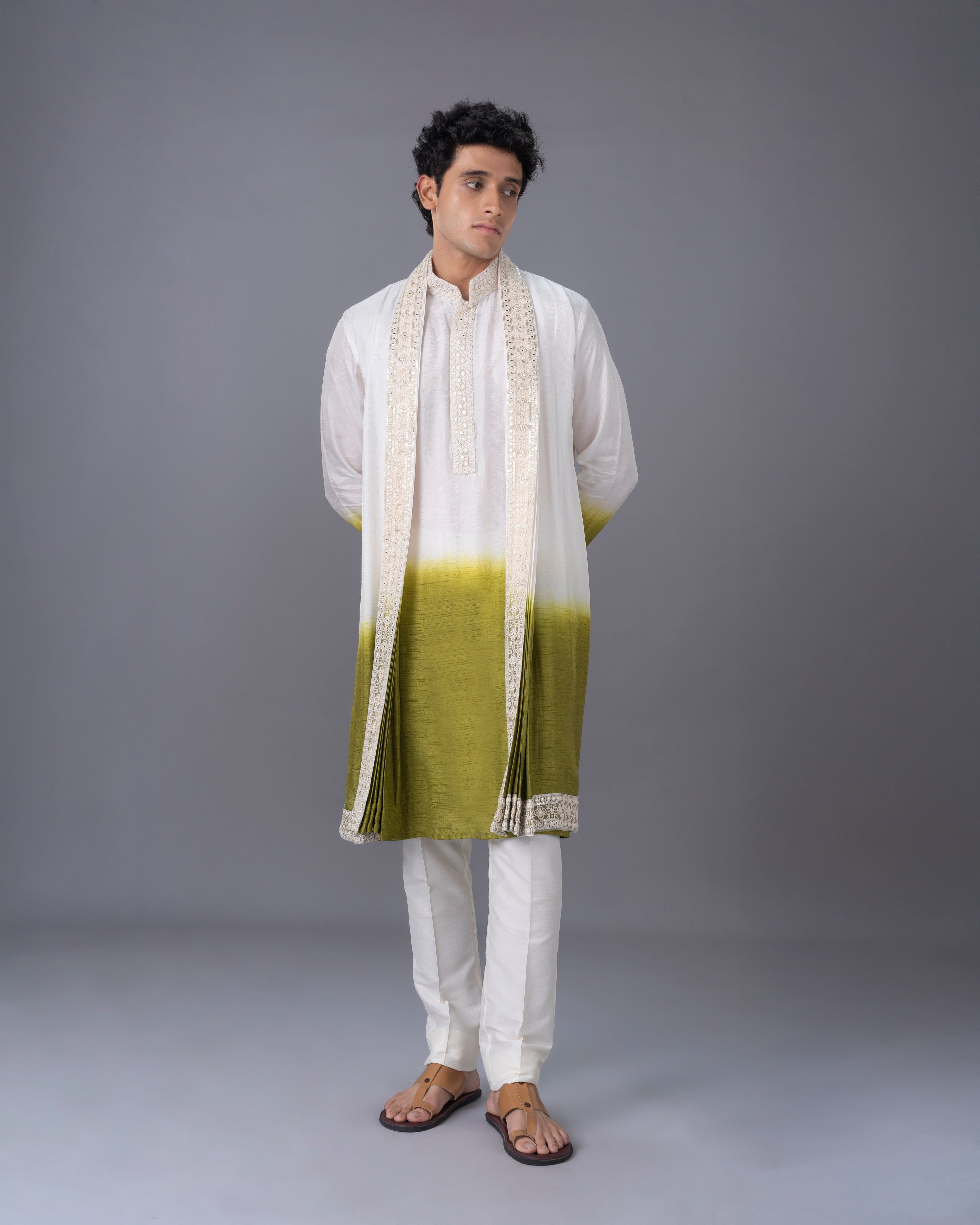 This luxurious ensemble features a stunning kurta that gracefully transitions from cream to a rich green in a captivating ombre effect, crafted from premium Prabal Silk. The kurta is beautifully adorned with intricate gota patti border embroidery, adding a touch of traditional opulence. This exquisite set includes a perfectly matched Alighari bottom for a refined silhouette and a coordinating dupatta that completes the look with sophisticated flair. Designed for those who appreciate distinctive luxury and impeccable craftsmanship, this kurta set is ideal for festive occasions, pre-wedding festivities, or any grand event where you want to make a memorable statement.