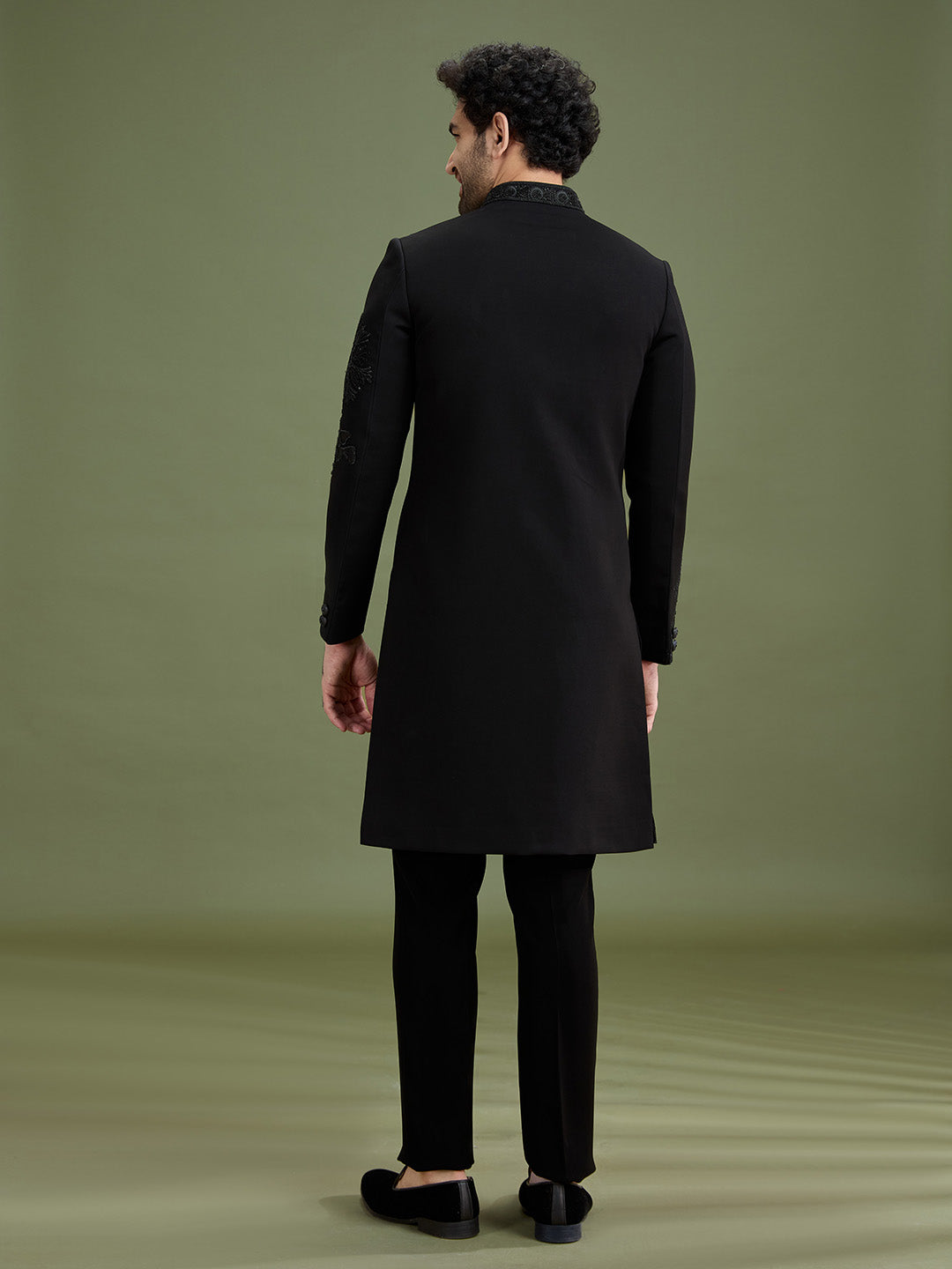 Back view of black bomario silk indo-western set for men