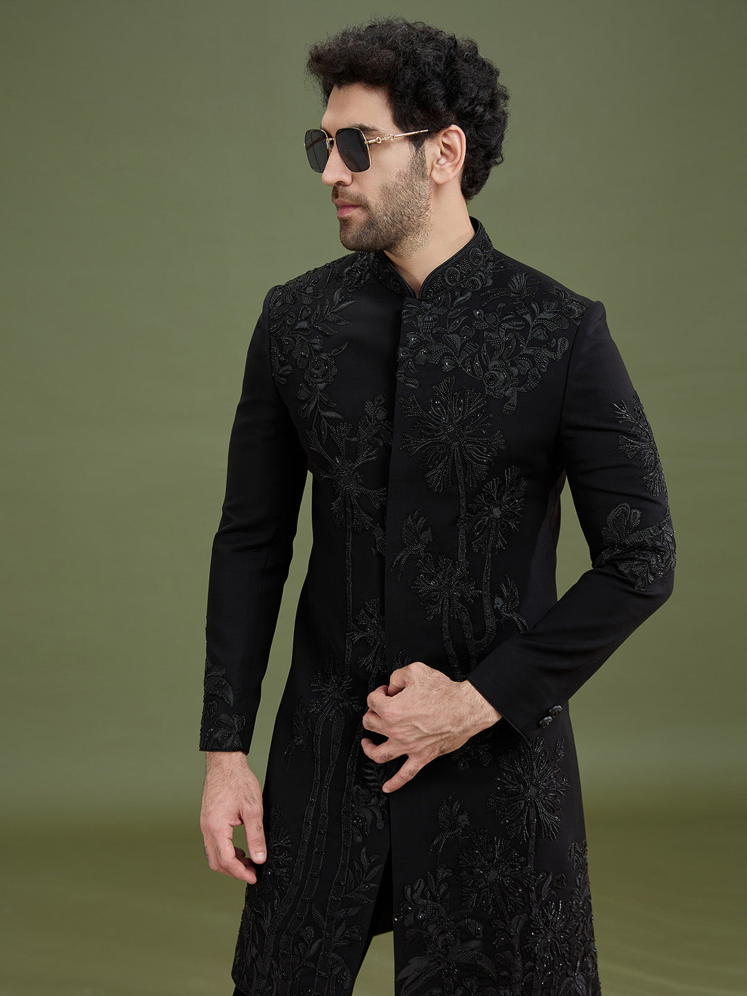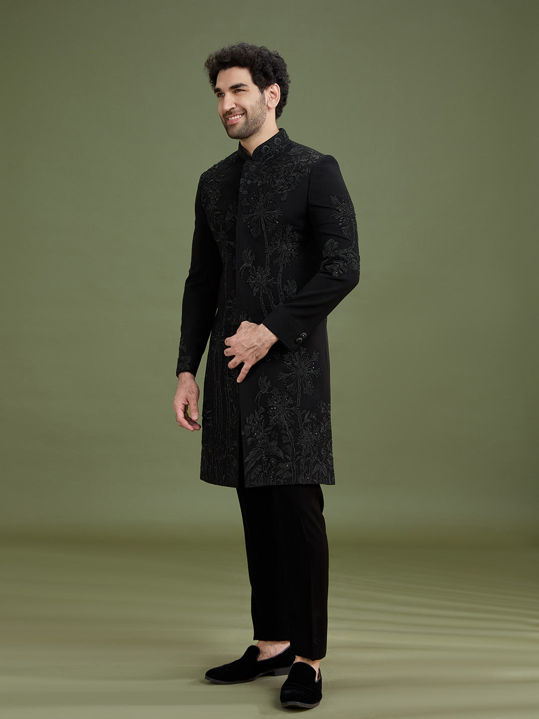 Paired with a matching black trouser, this Indo-Western set creates a sleek and well-balanced silhouette, perfectly suited for contemporary ethnic styling.