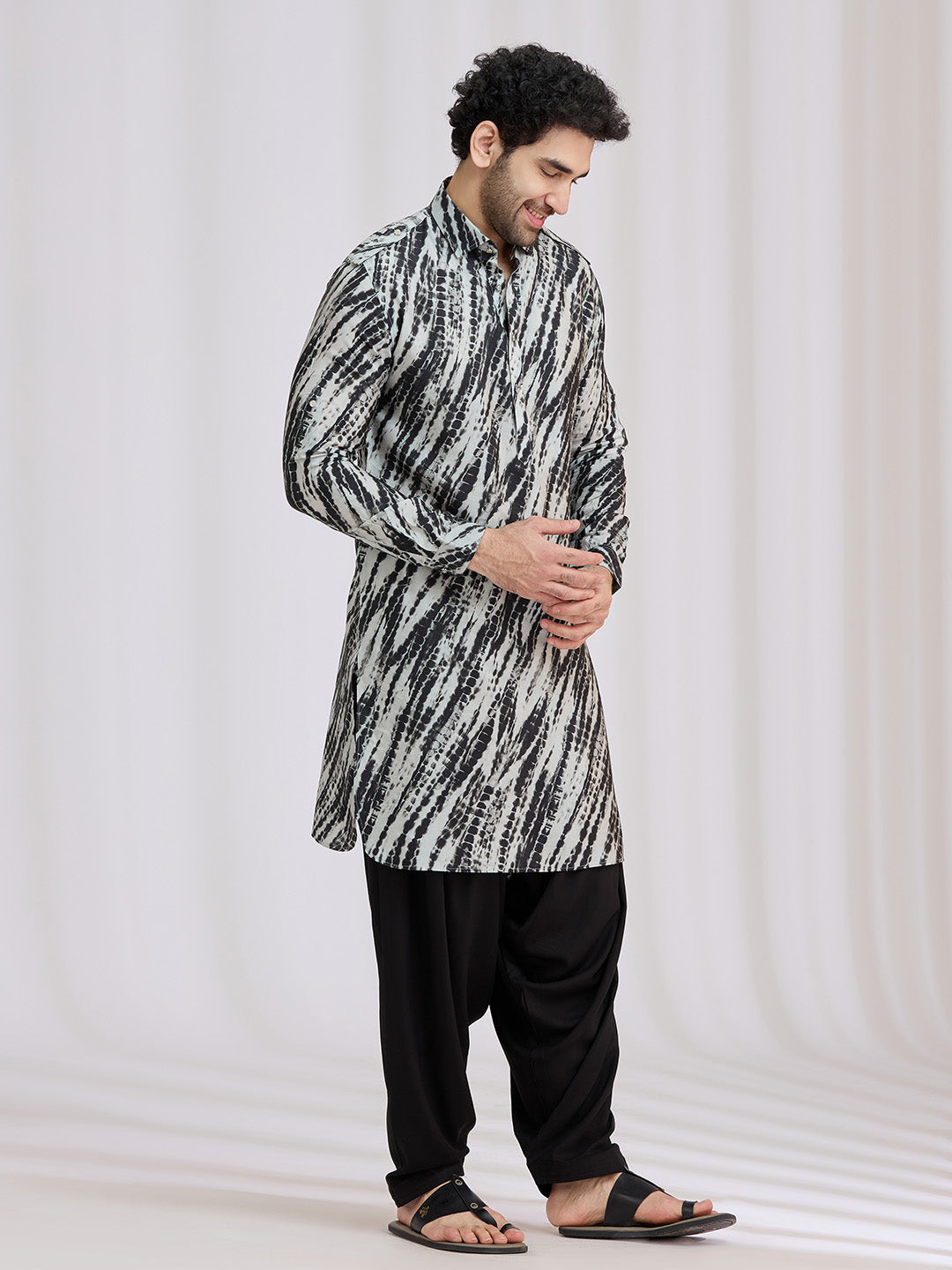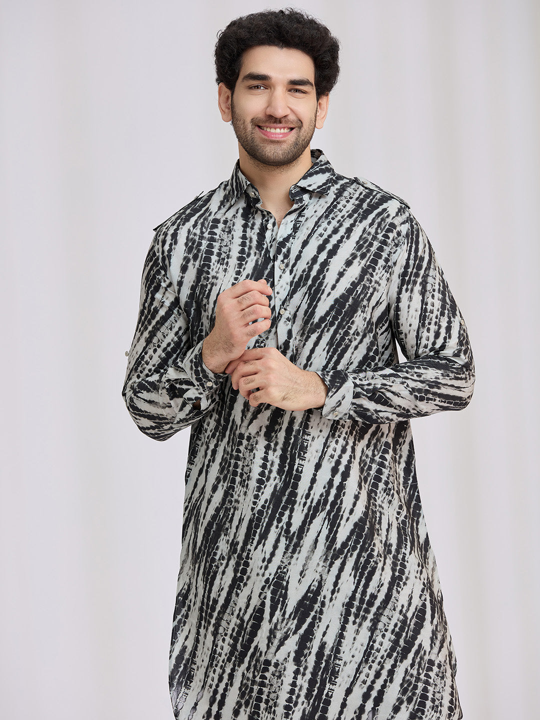 The Pathani-style kurta features a traditional leheriya printed pattern in elegant grey and black tones, adding a distinctive Rajasthani character to the design. Styled with a button closure and an above-knee length, the kurta maintains a clean and classic silhouette.