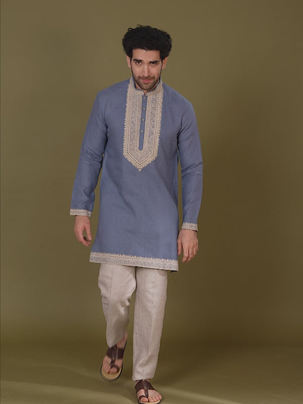 This Blue Linen Short Kurta Set for Men by Kora is designed for casual and festive occasions. The short kurta is crafted from linen fabric, offering a breathable feel and comfortable wear.