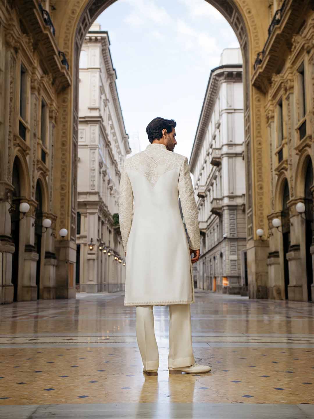 This Cream Silk Sherwani Set for Men by Kora is designed for weddings and traditional ceremonies. Made from silk fabric, the sherwani offers a rich look with a comfortable and structured fit.