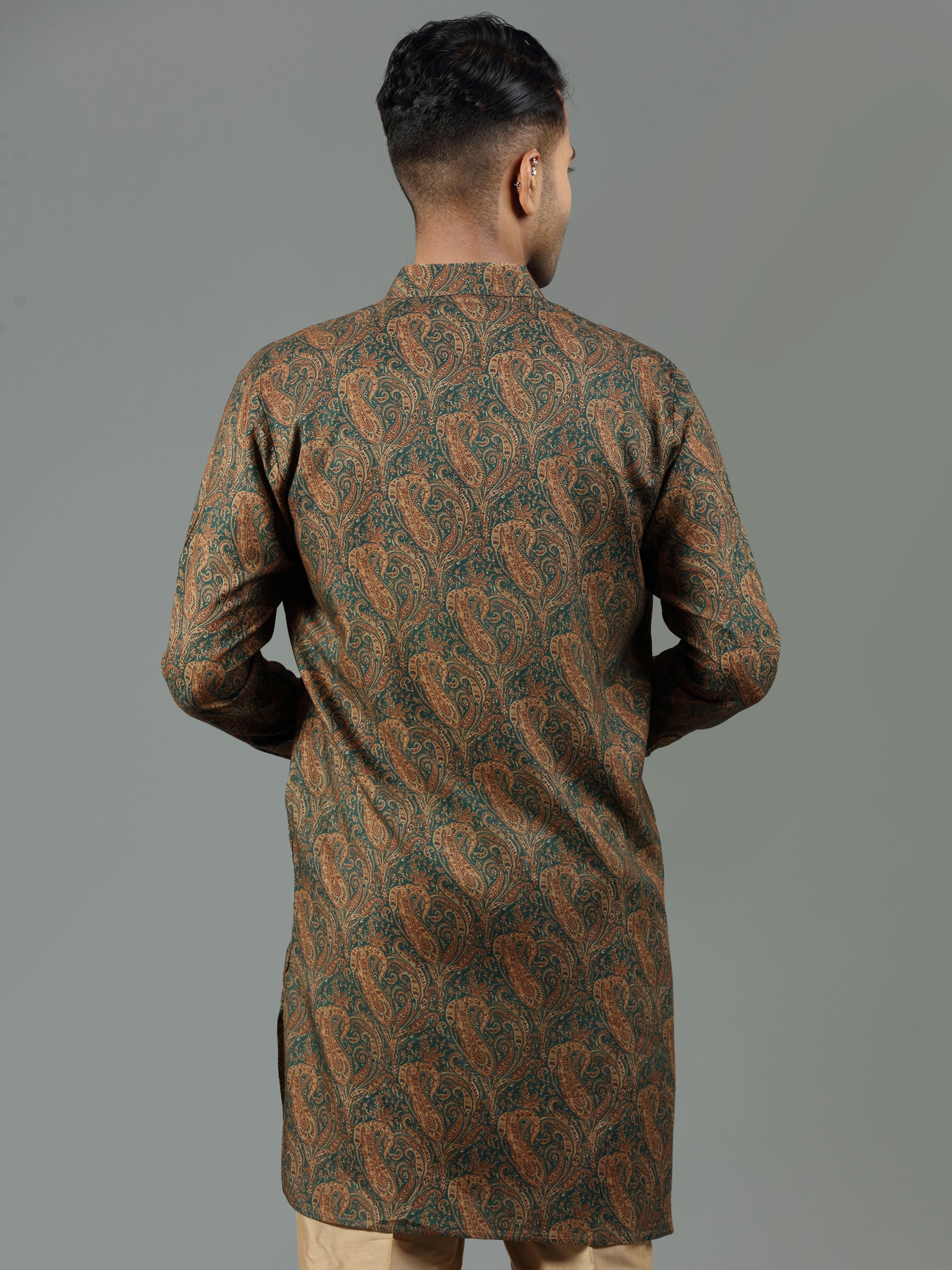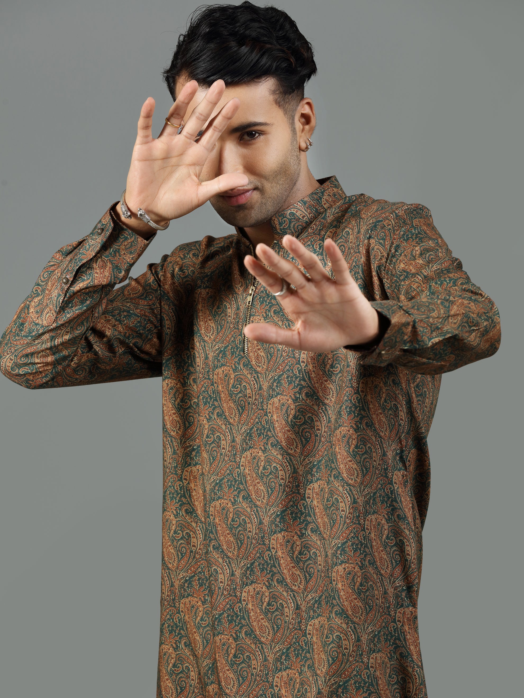 Dark Green Ethnic Print Blended Silk Kurta Set
