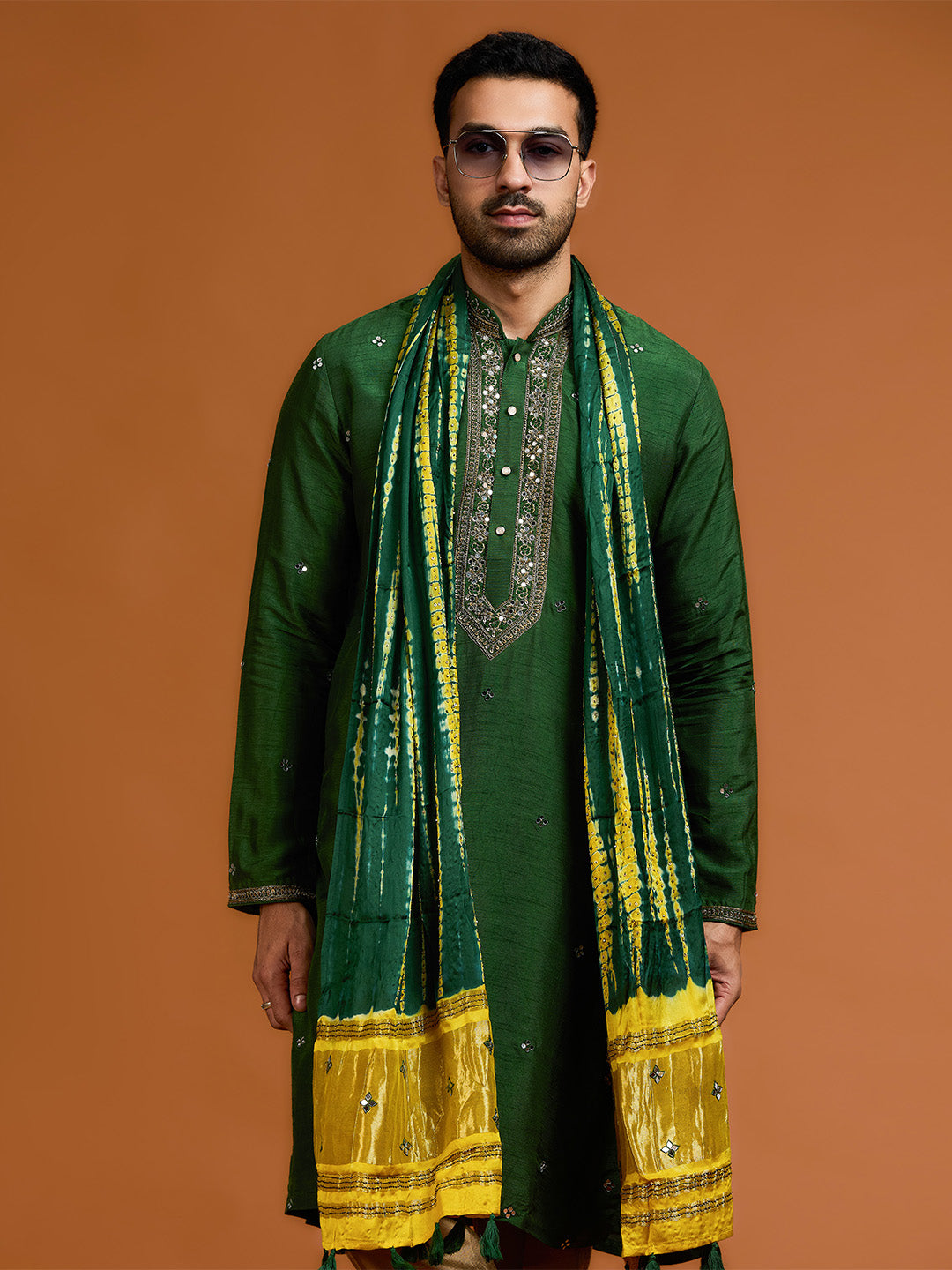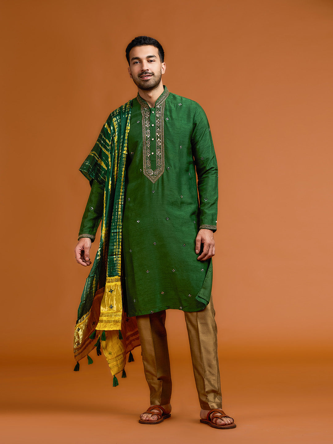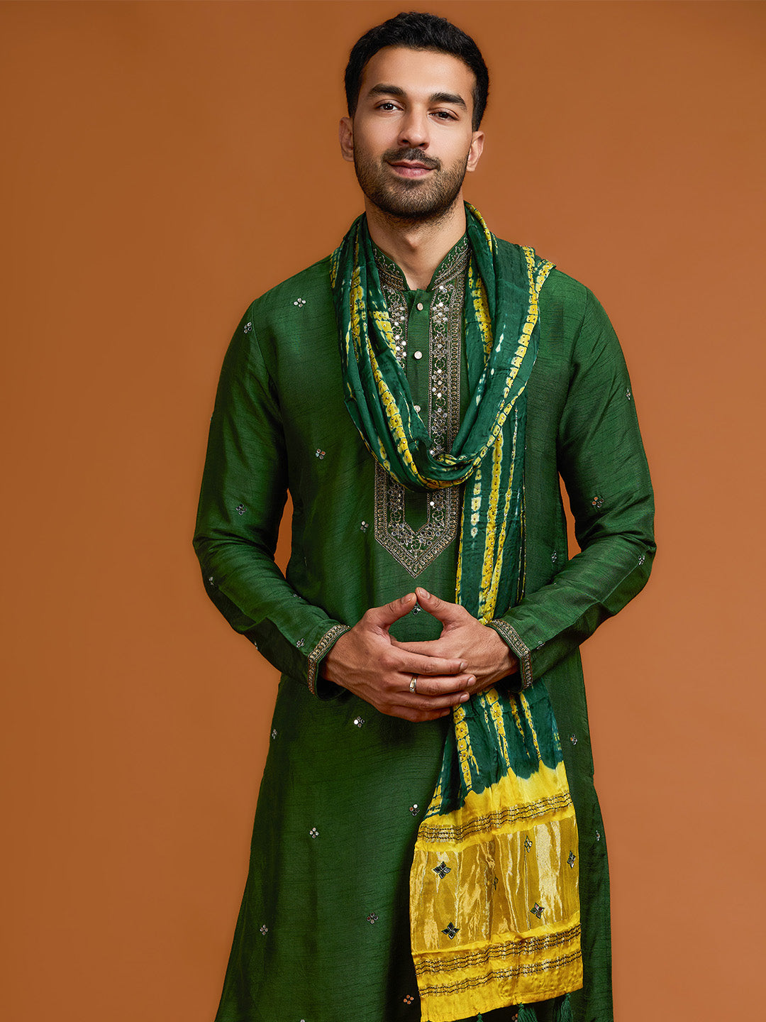 Green Silk Kurta Set with Dupatta and Highlight Embroidery