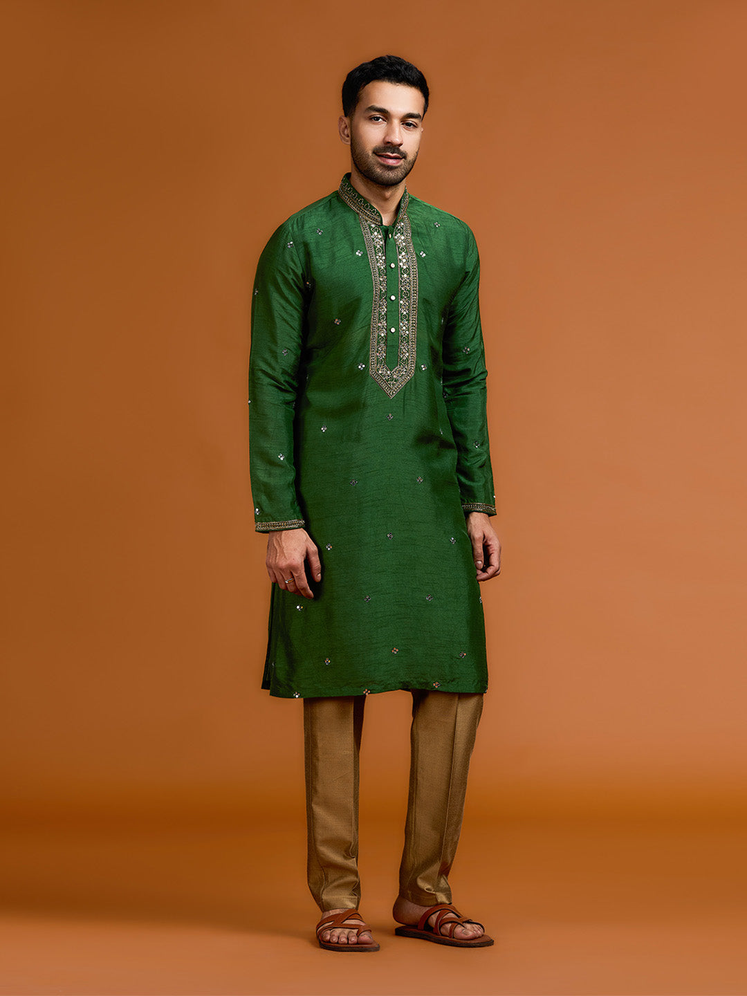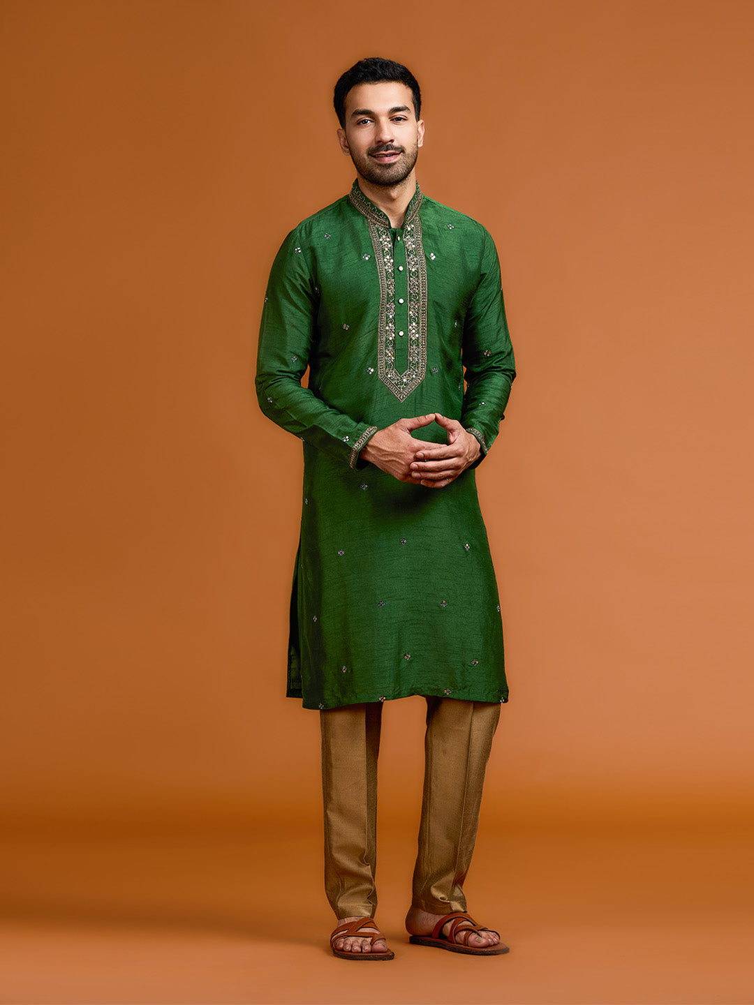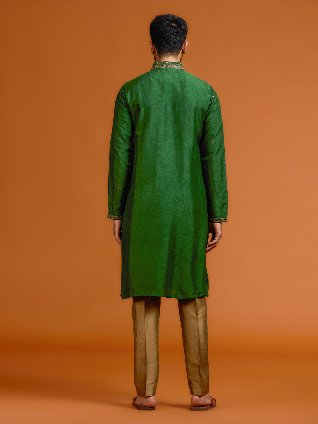 Green Silk Kurta Set with Dupatta and Highlight Embroidery