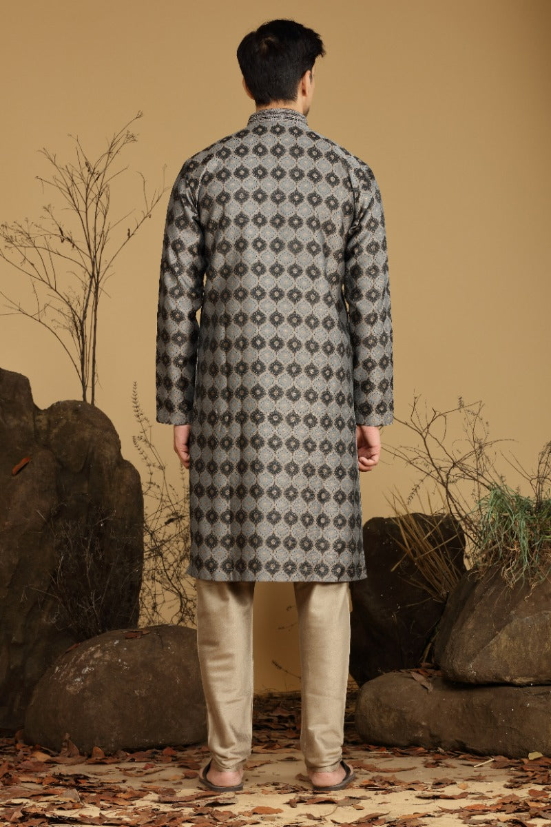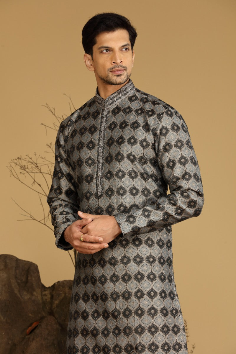 Grey And Black Printed Blended Silk Kurta Set