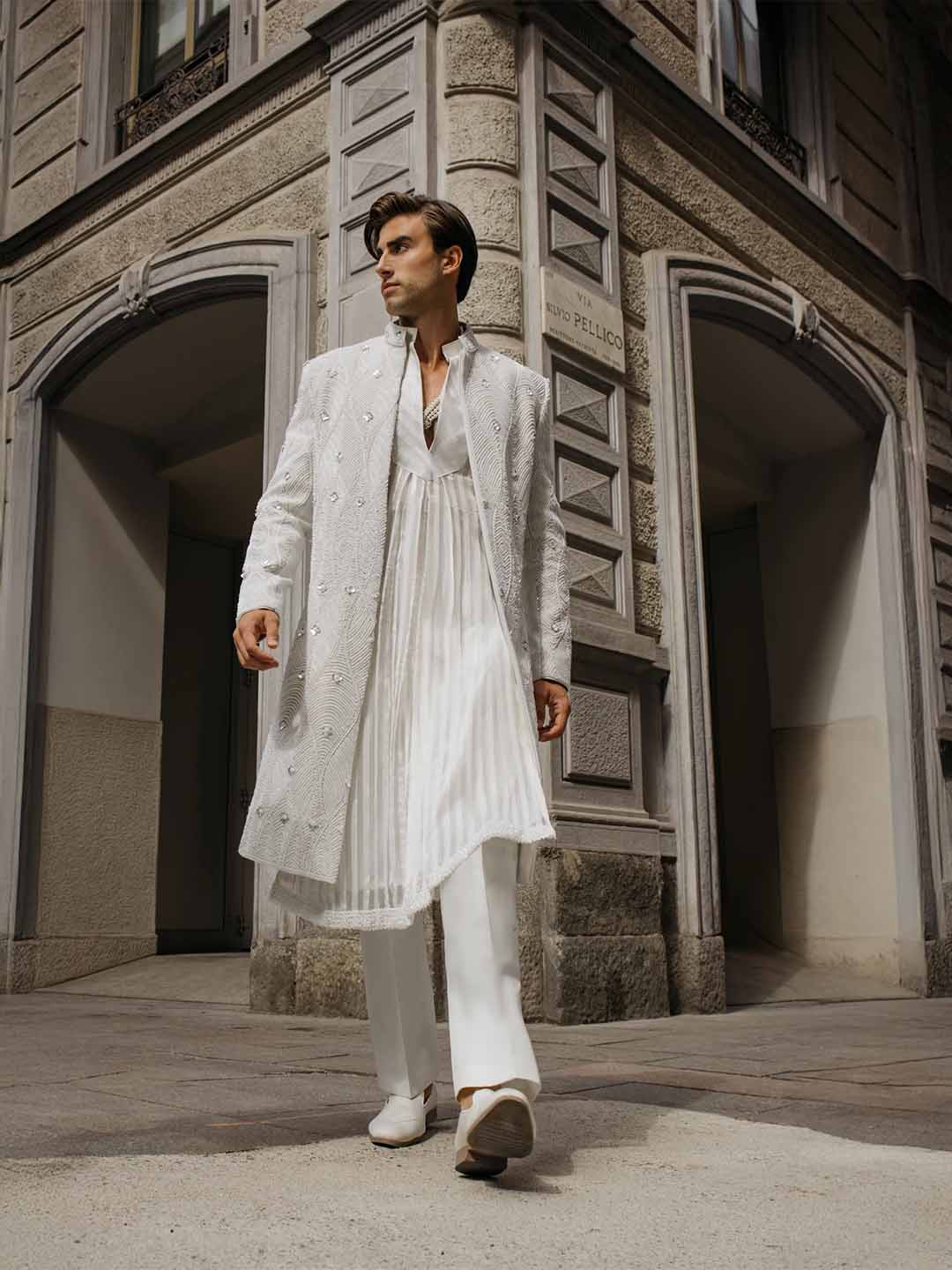 The ivory colour gives the outfit a timeless appeal, making it suitable for grooms and ceremonial events across day and evening functions.