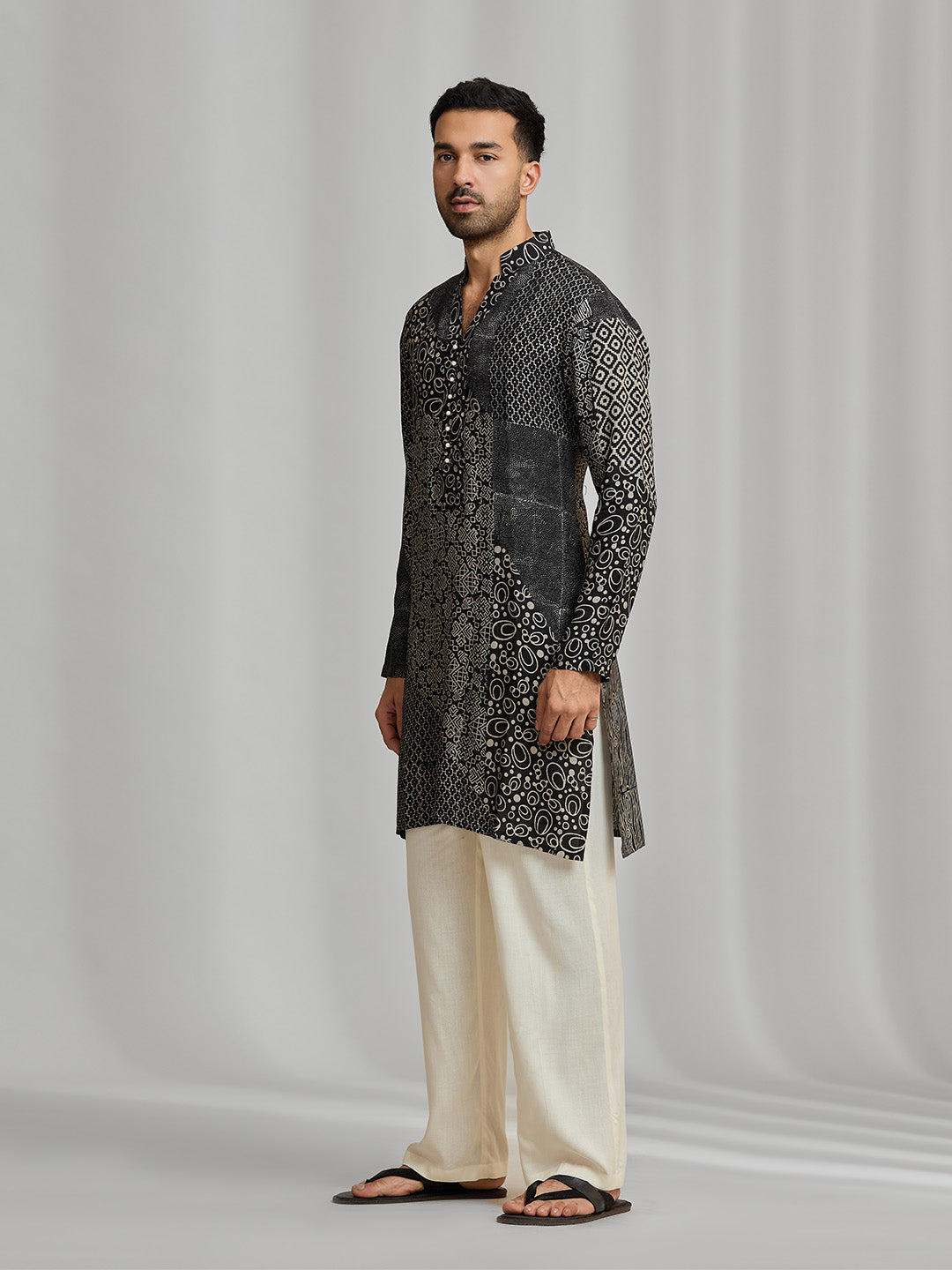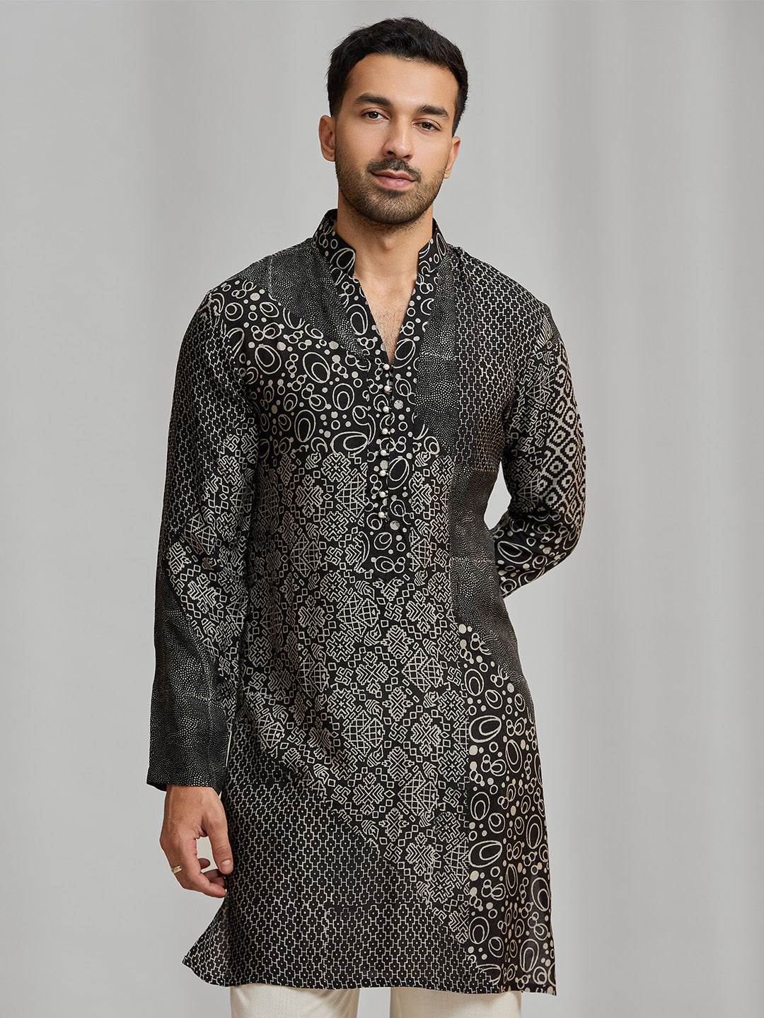 Black and cream silk-blend kurta featuring a multi-patterned geometric design with white bottom.