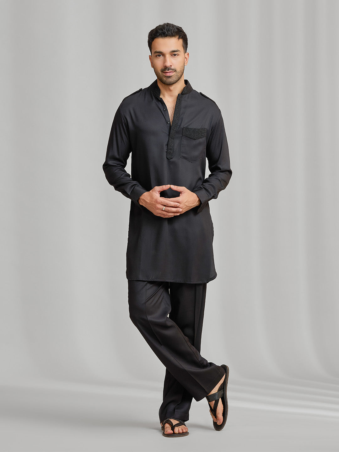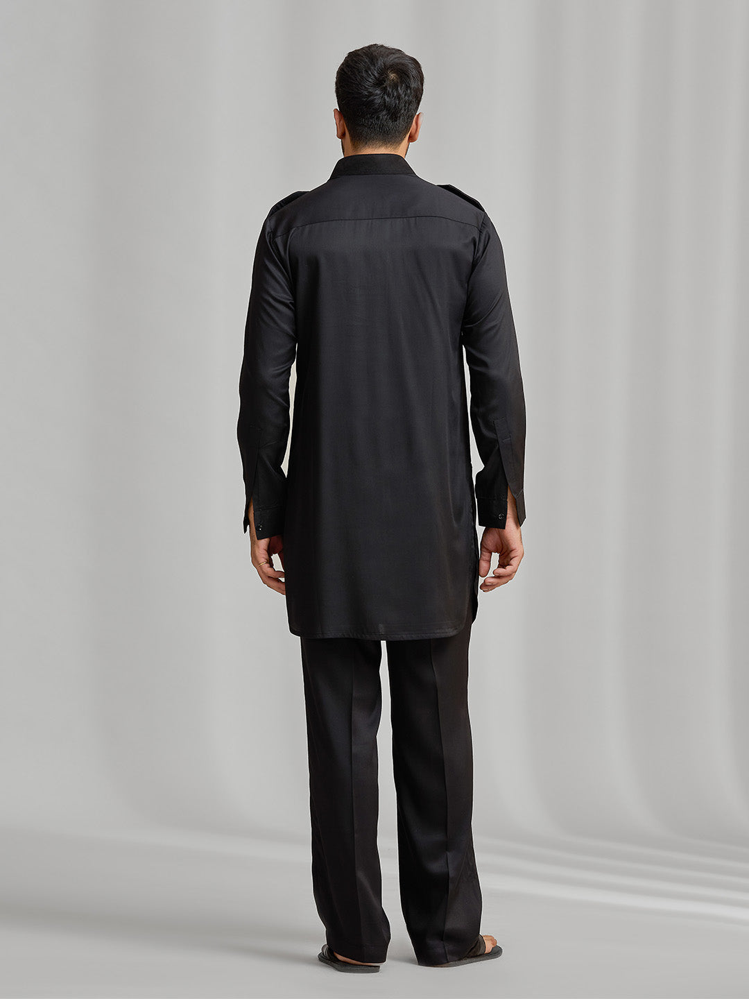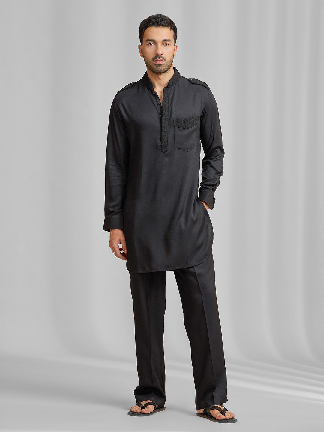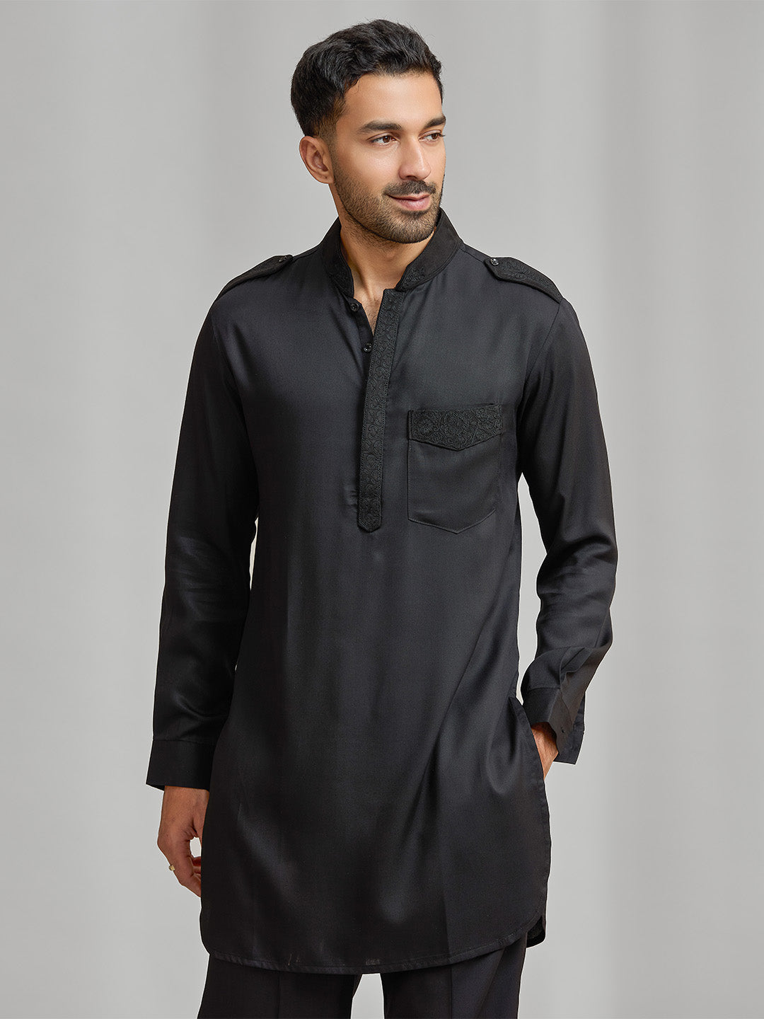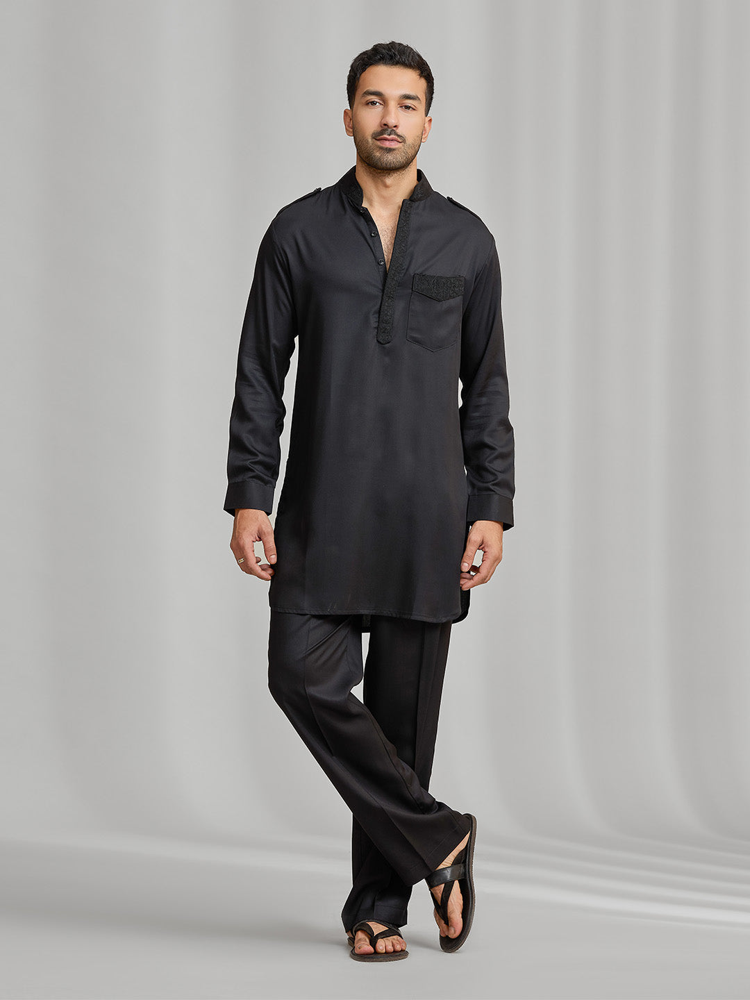 Black silk kurta set with subtle matching embroidery, paired with black bottom.