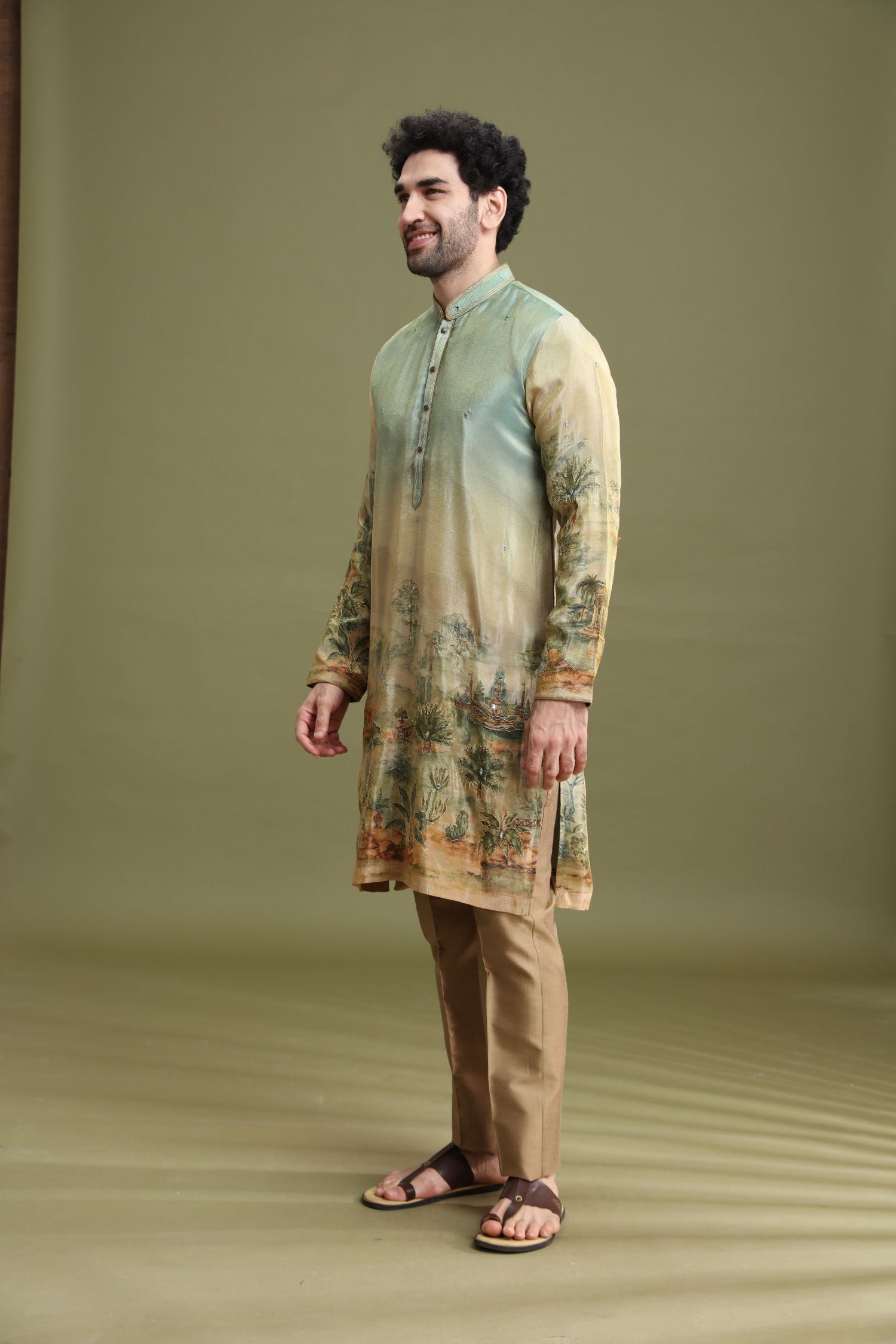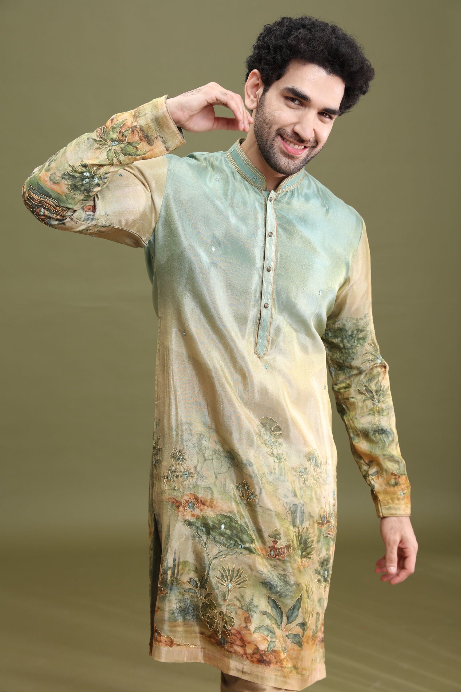 Multicolor Tissue Silk Floral Kurta Set for Men with Aligarhi & Zari Work