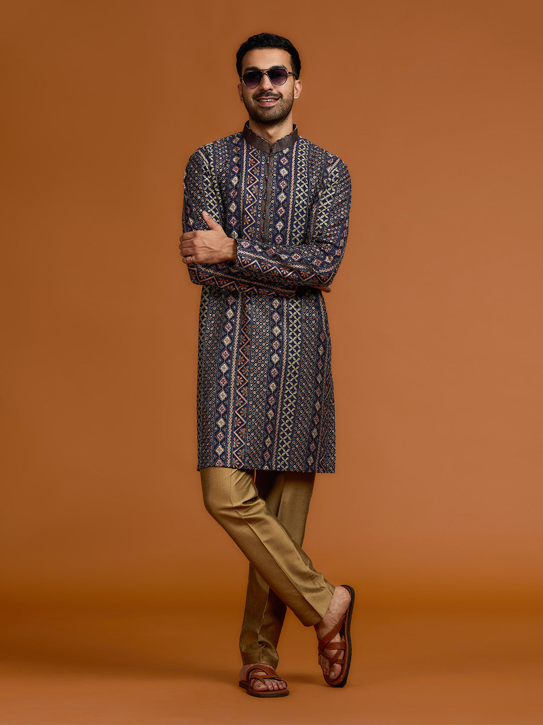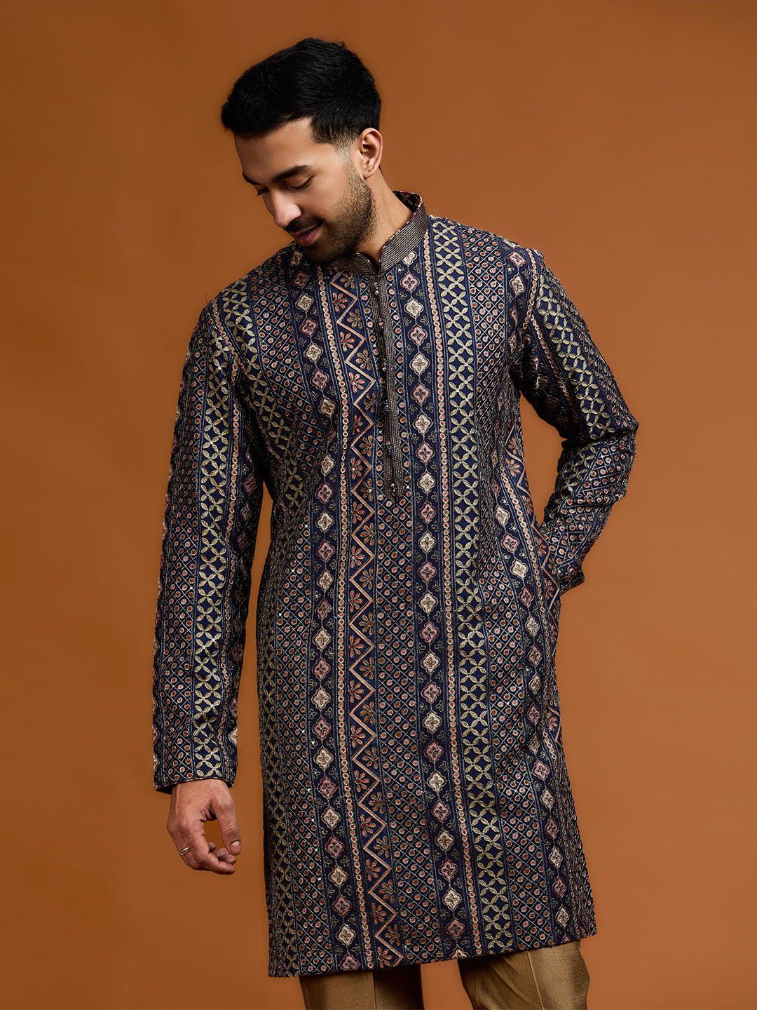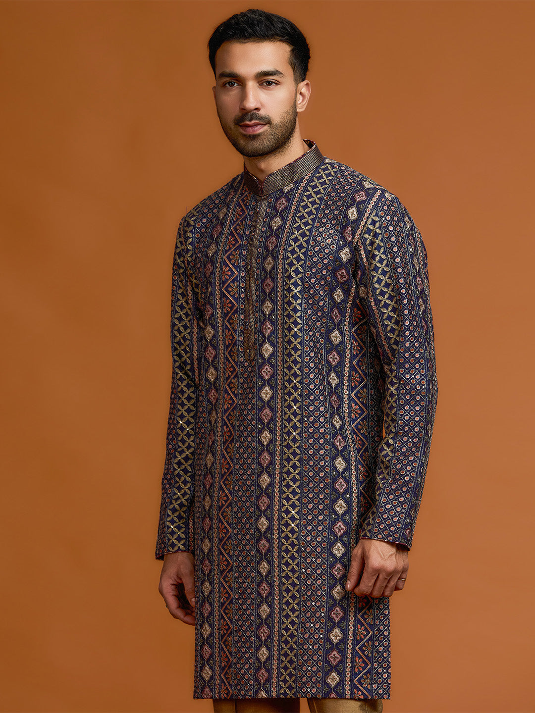 Navy blue kurta with architectural print, dense tonal threadwork, and subtle shimmer, paired with antique gold Aligarh pants.