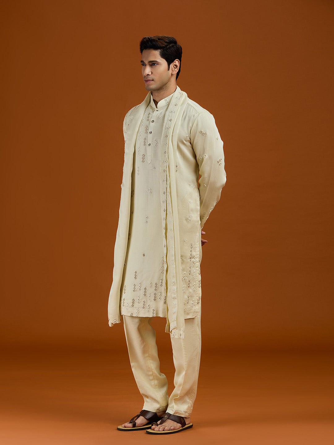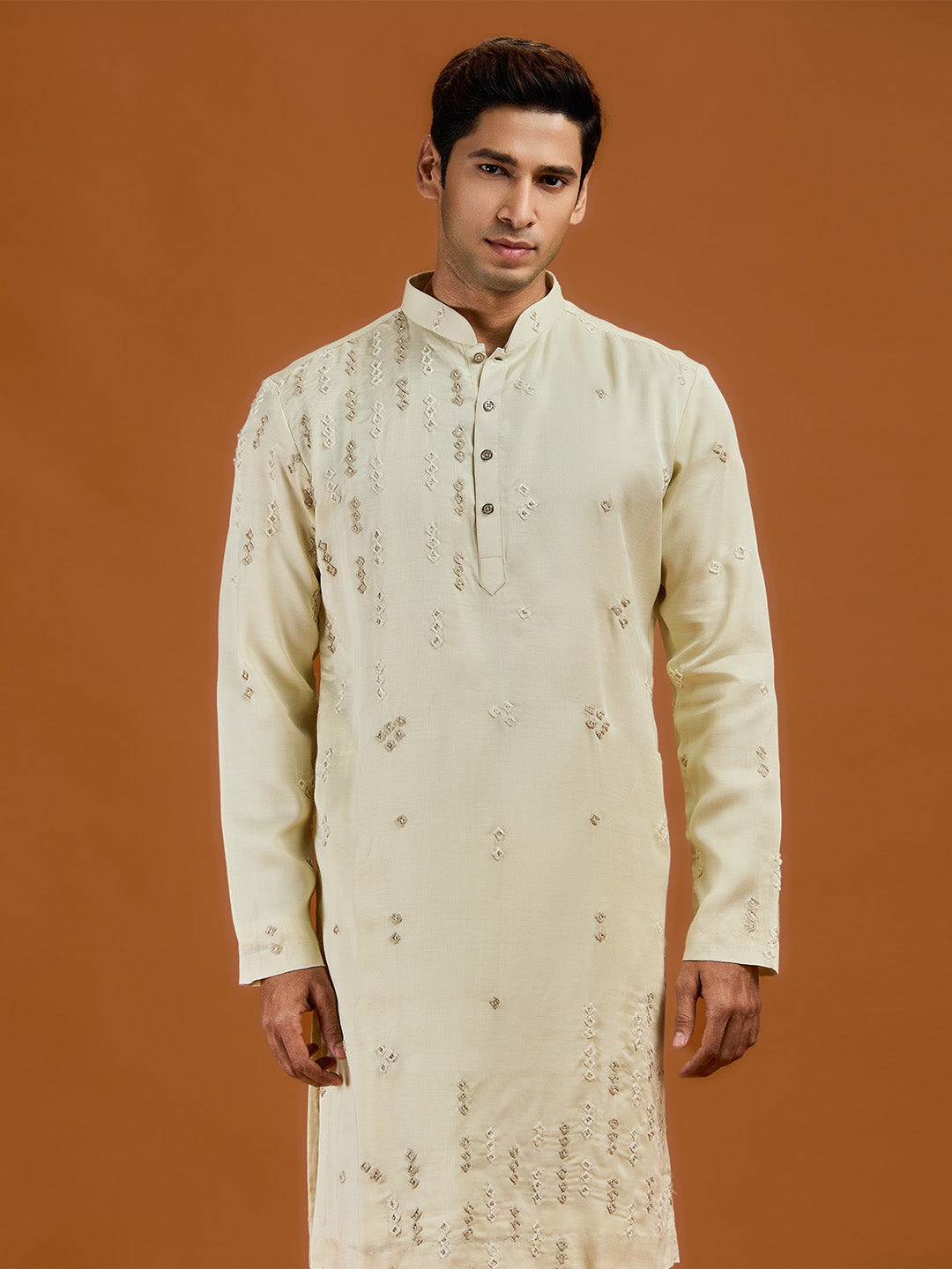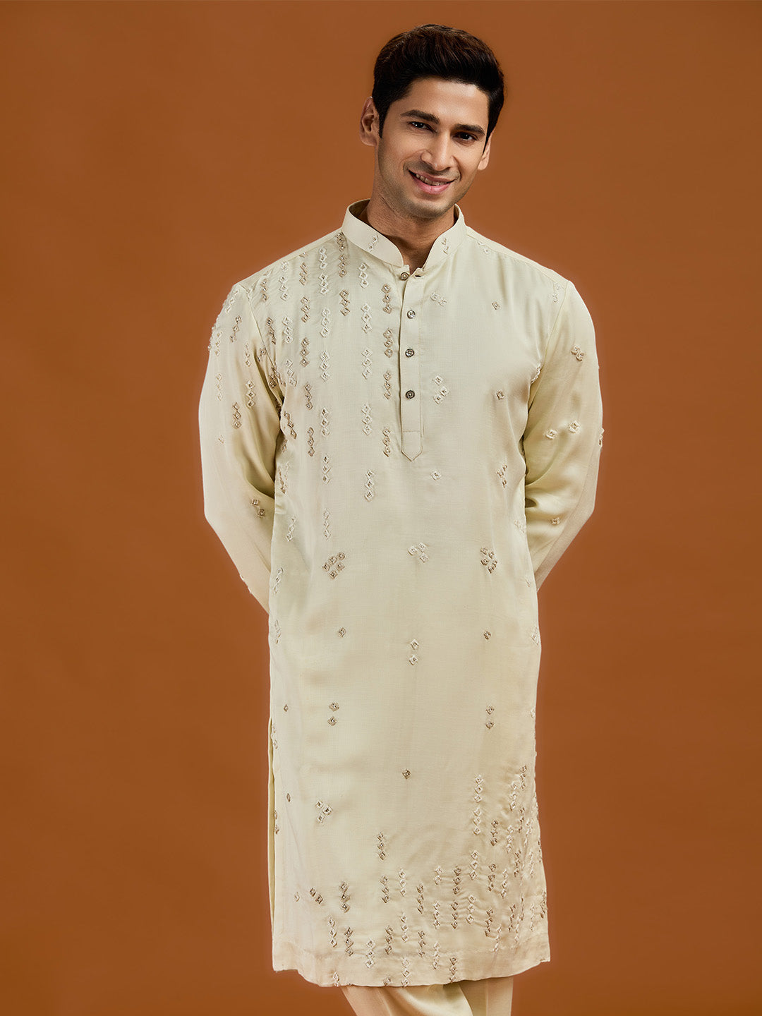 Pista satin linen blend kurta set featuring delicate thread embroidery and a coordinated pista bottom.