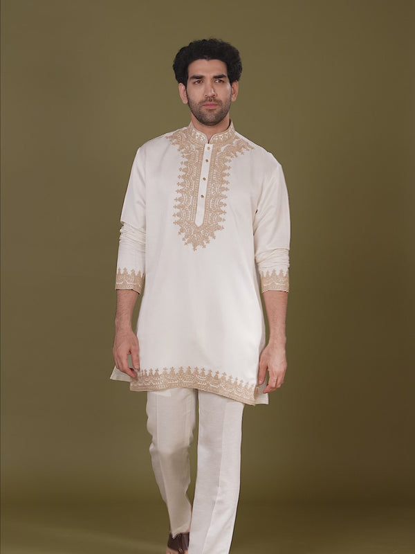 White Short Kurta Pant Set for Men with Dori Embroidery