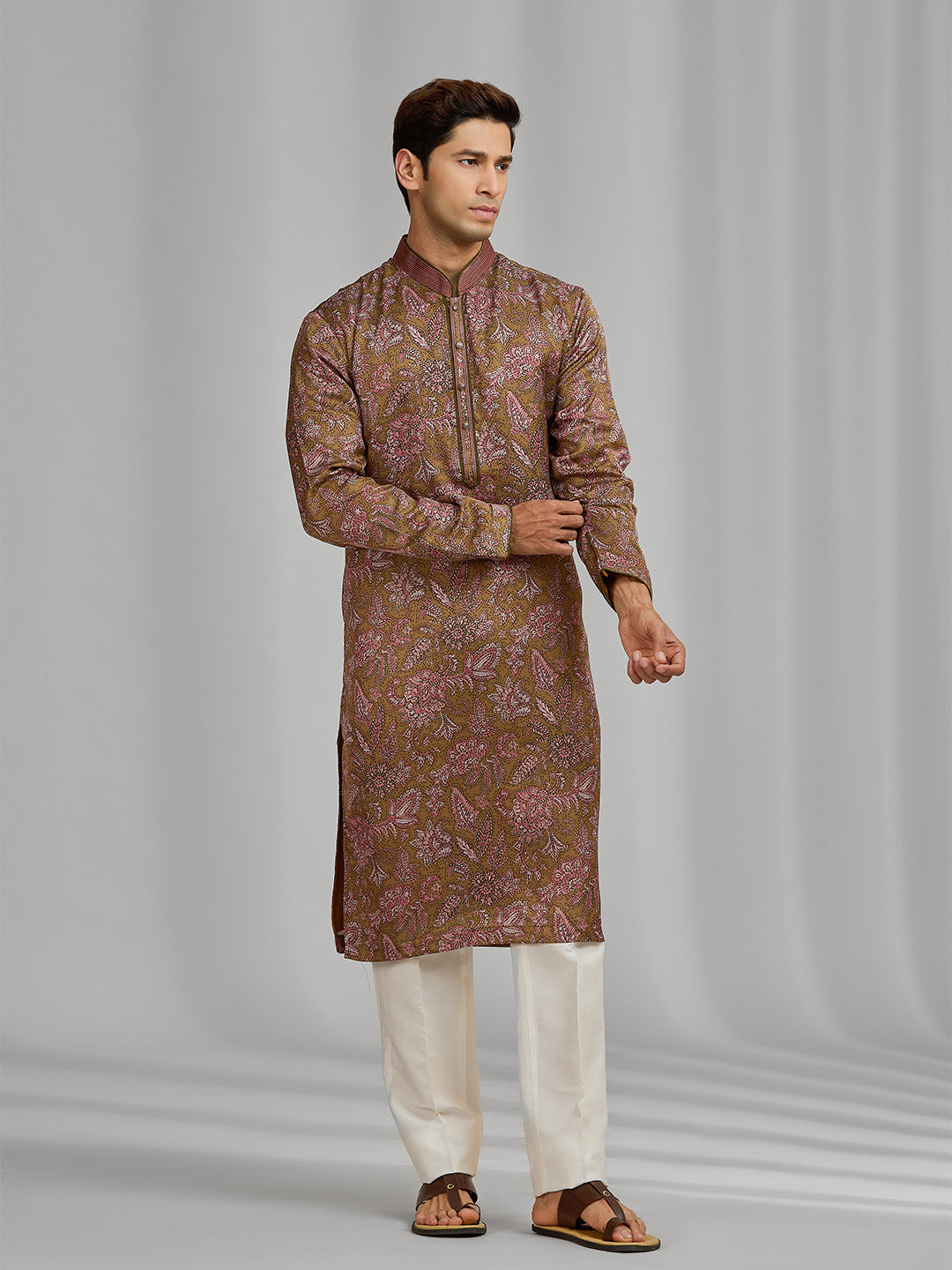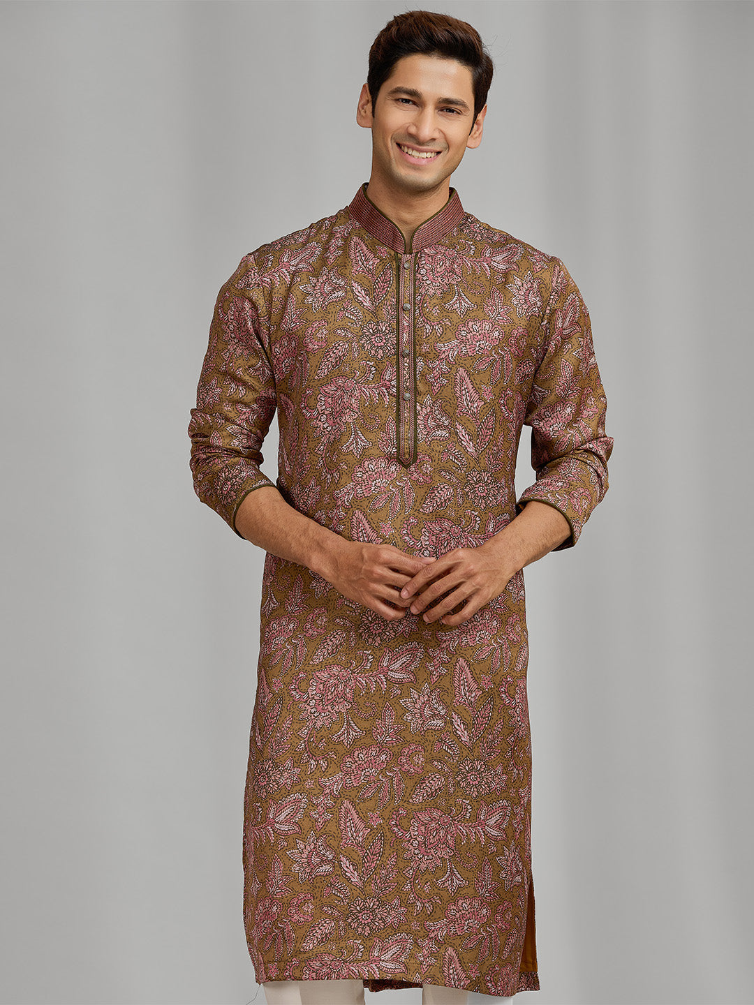 Olive Silk Paisley & Rose Printed Kurta Ensemble