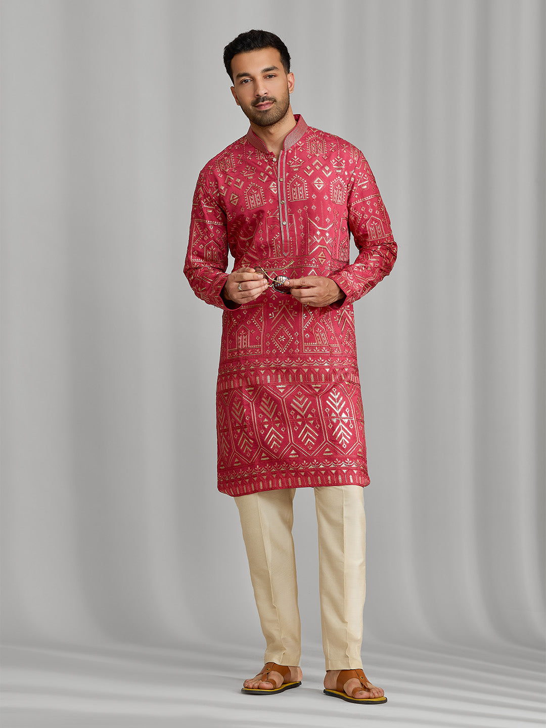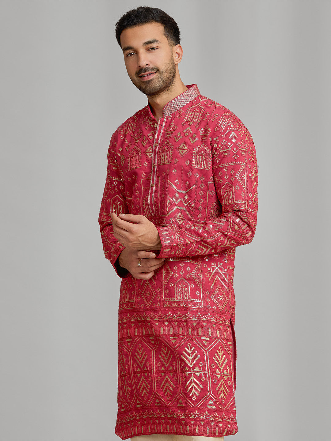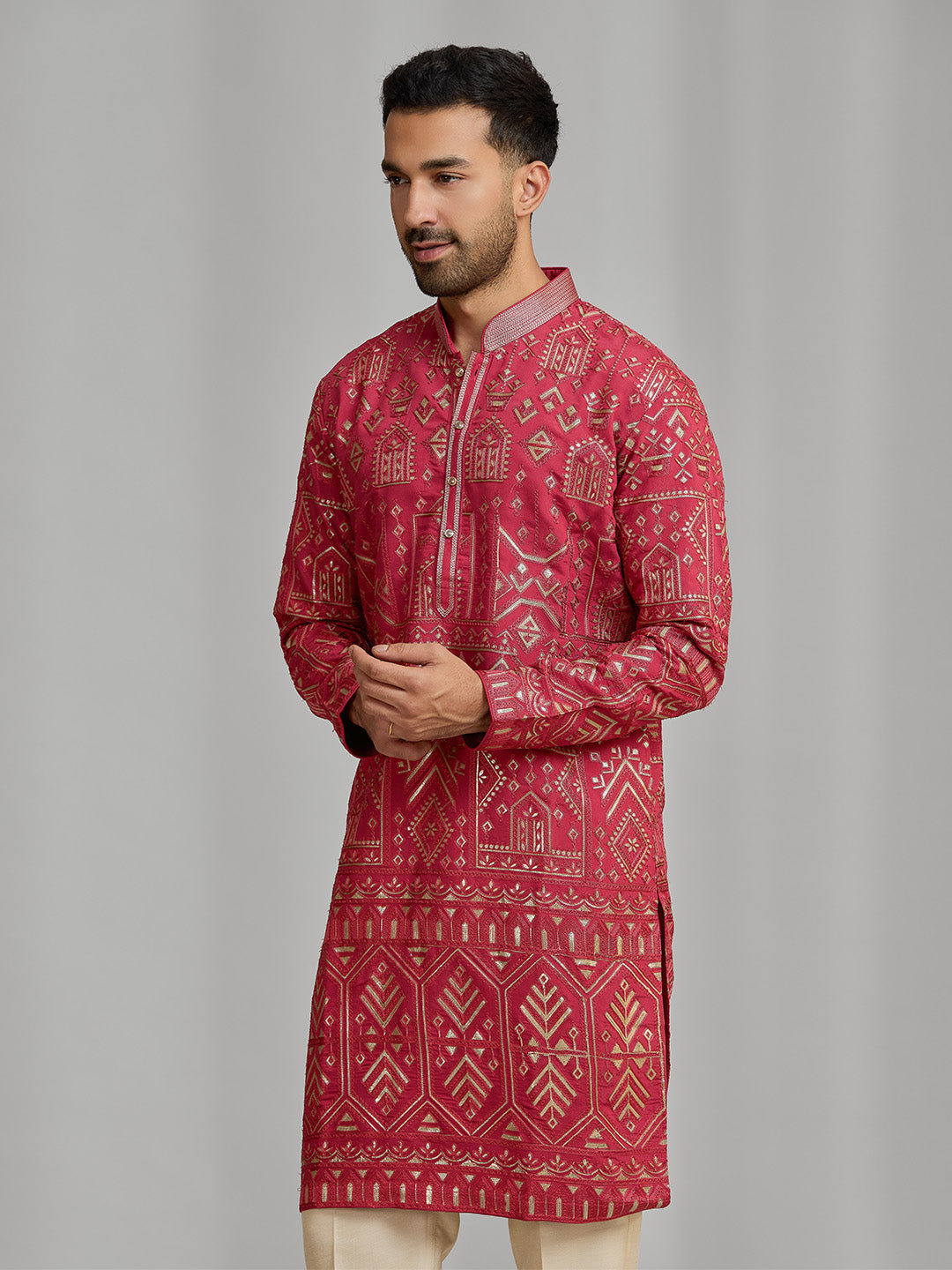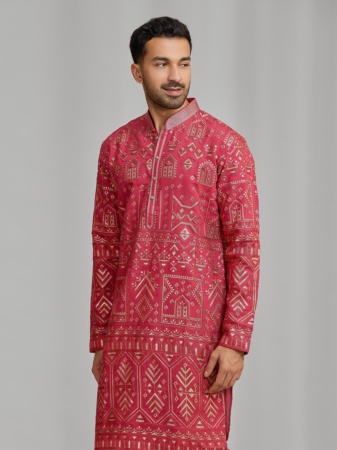 Bold, sharp, and undeniably festive, this premium magenta silk kurta showcases elaborate gold-toned embroidery with intricate border detailing inspired by heritage architectural motifs. The rich jewel tone is enhanced by a structured Chinese collar and a matching embroidered placket, adding a touch of regal sophistication. Paired with classic cream Aligarhi bottoms, this longline, above-knee silhouette comes together as the ultimate ensemble for the true luxury seeker.