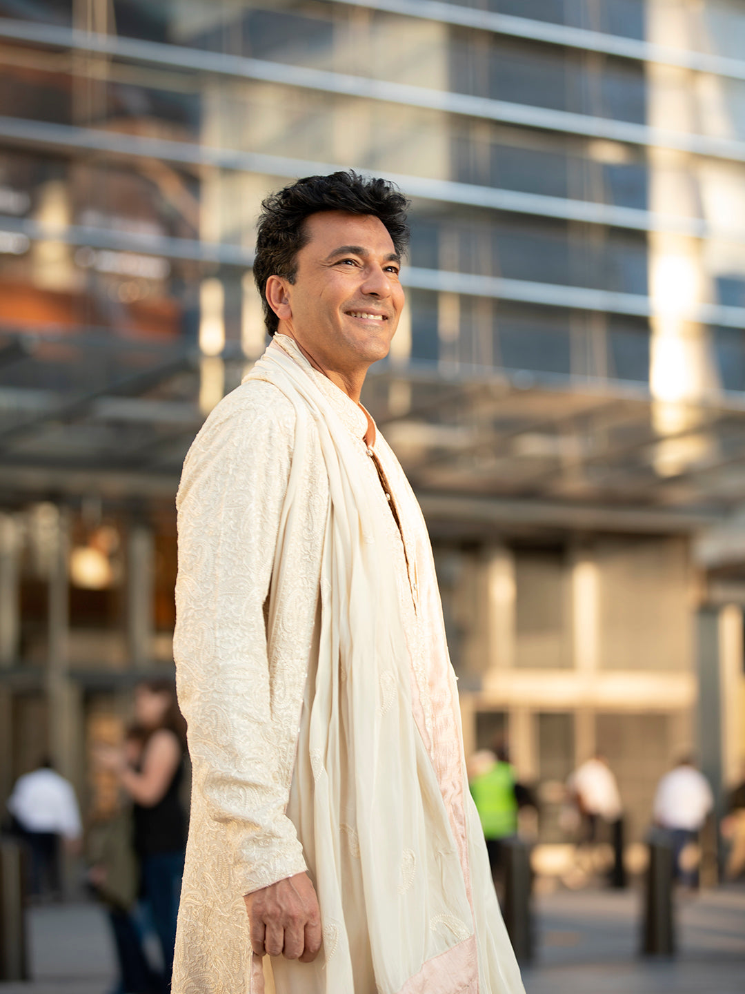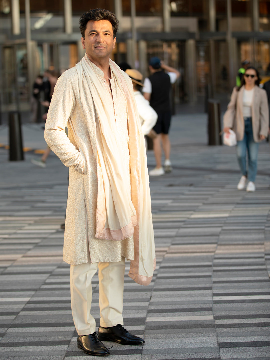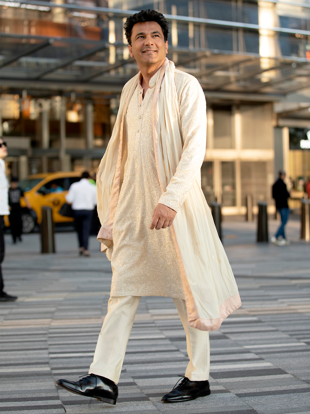 Celebrity chef Vikas Khanna wears this refined beige Lucknowi silk kurta set, adorned with subtle embroidery that elevates its understated charm. Paired with a lightly embroidered dupatta, the ensemble exudes effortless elegance. The rich Lucknowi silk fabric lends a soft sheen and regal texture. Perfect for festive occasions, traditional celebrations, and evening gatherings.