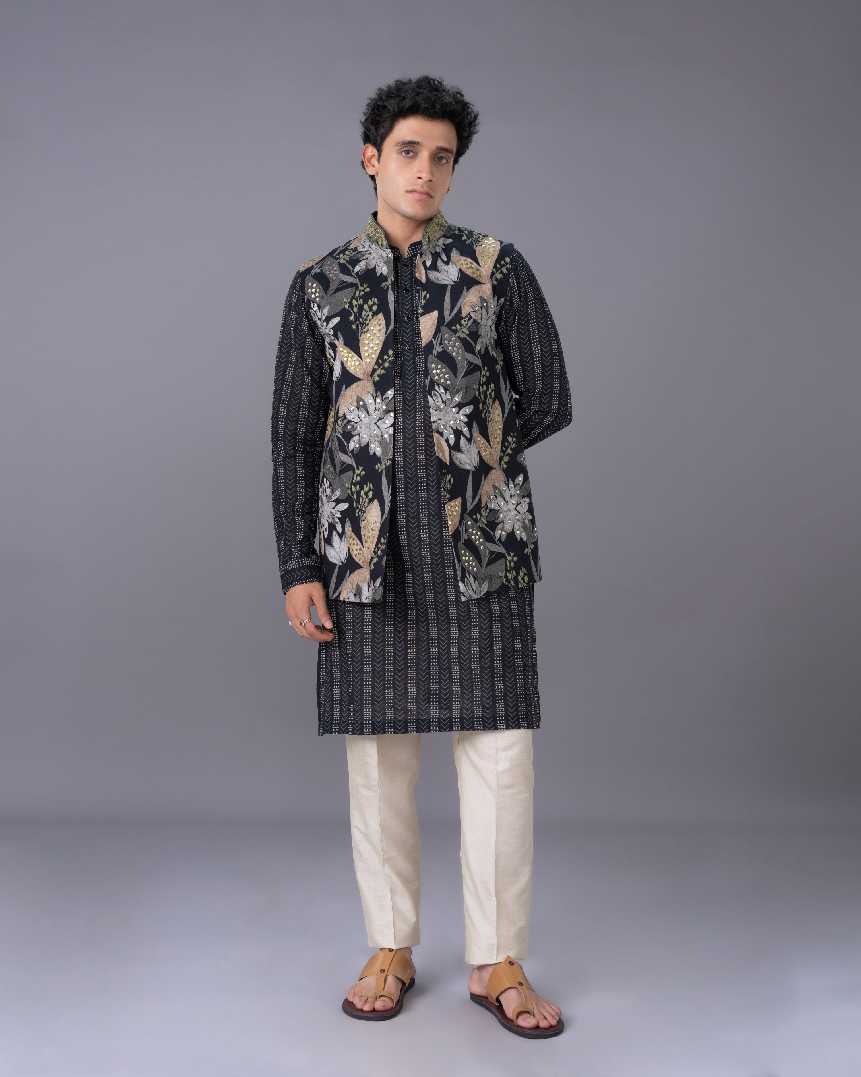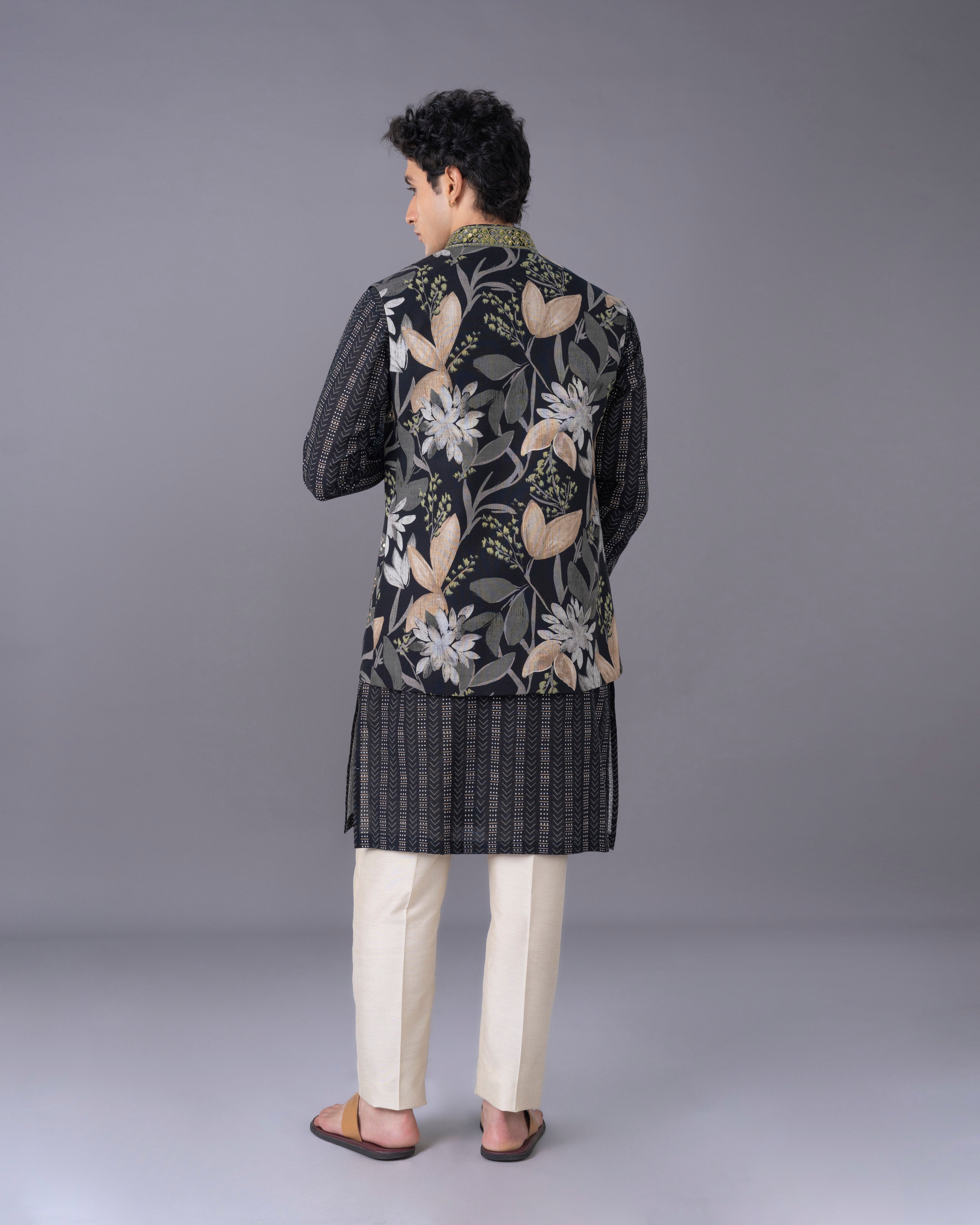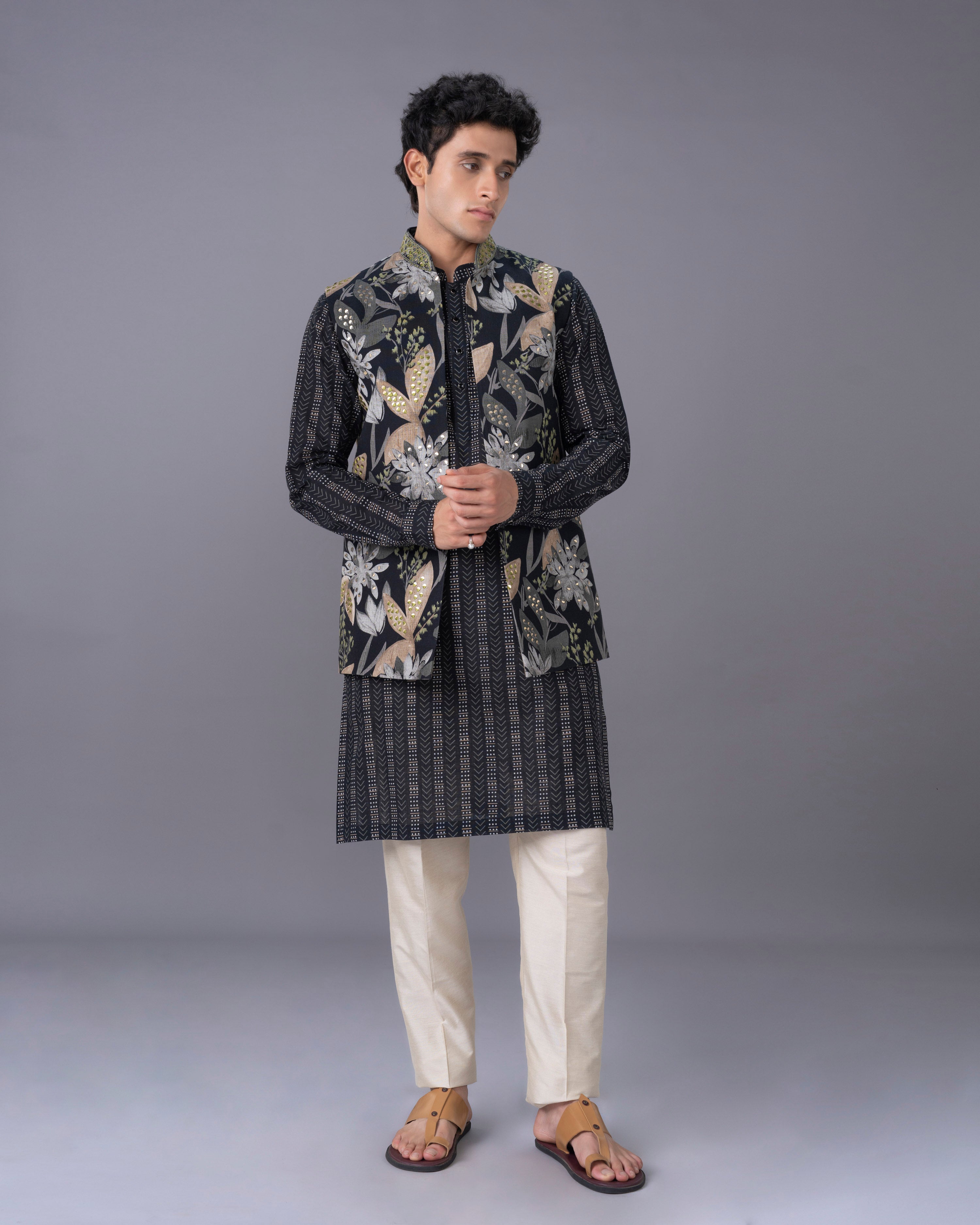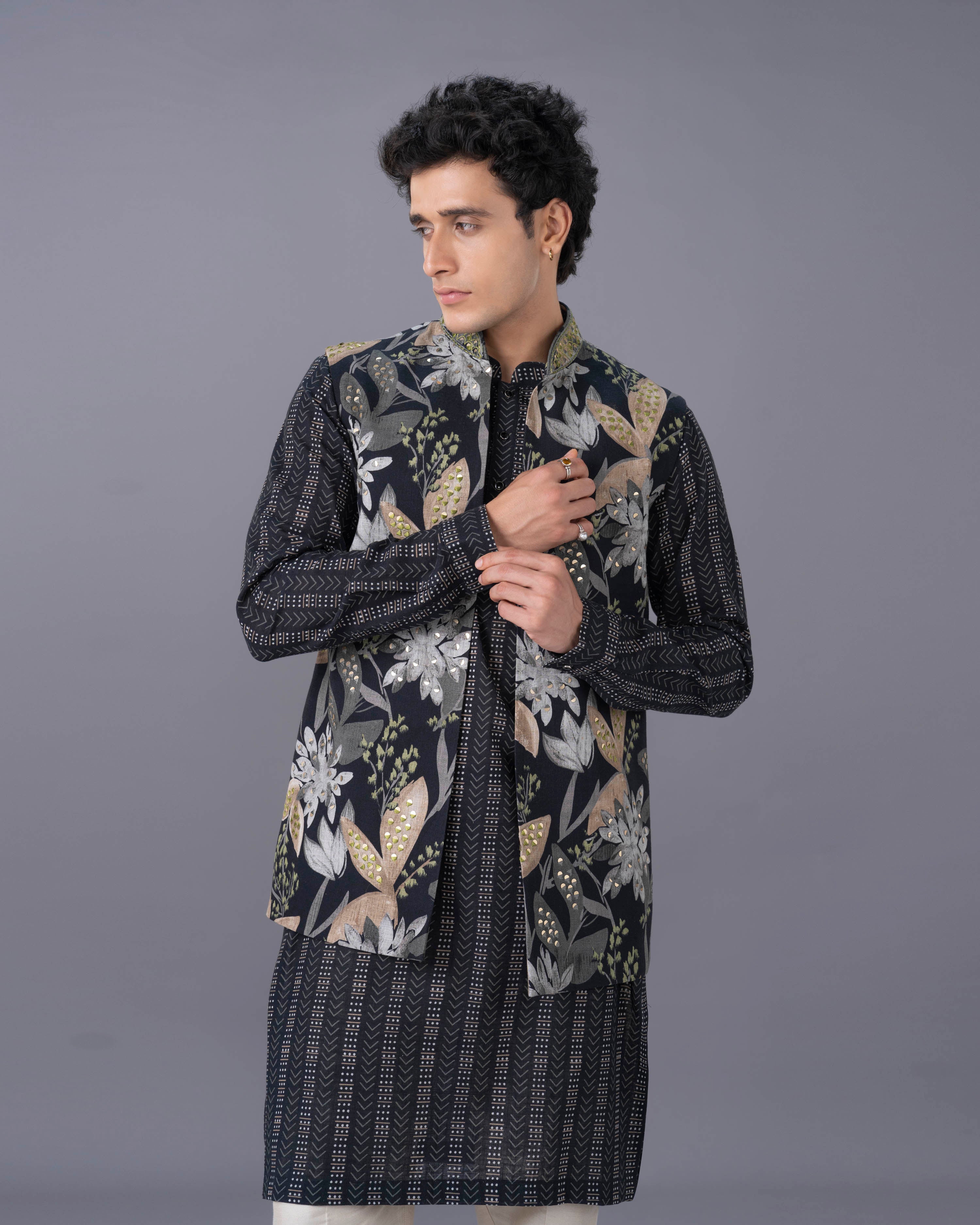 Black Silk Kurta Jacket Set with Printed & Embroidered Alighari