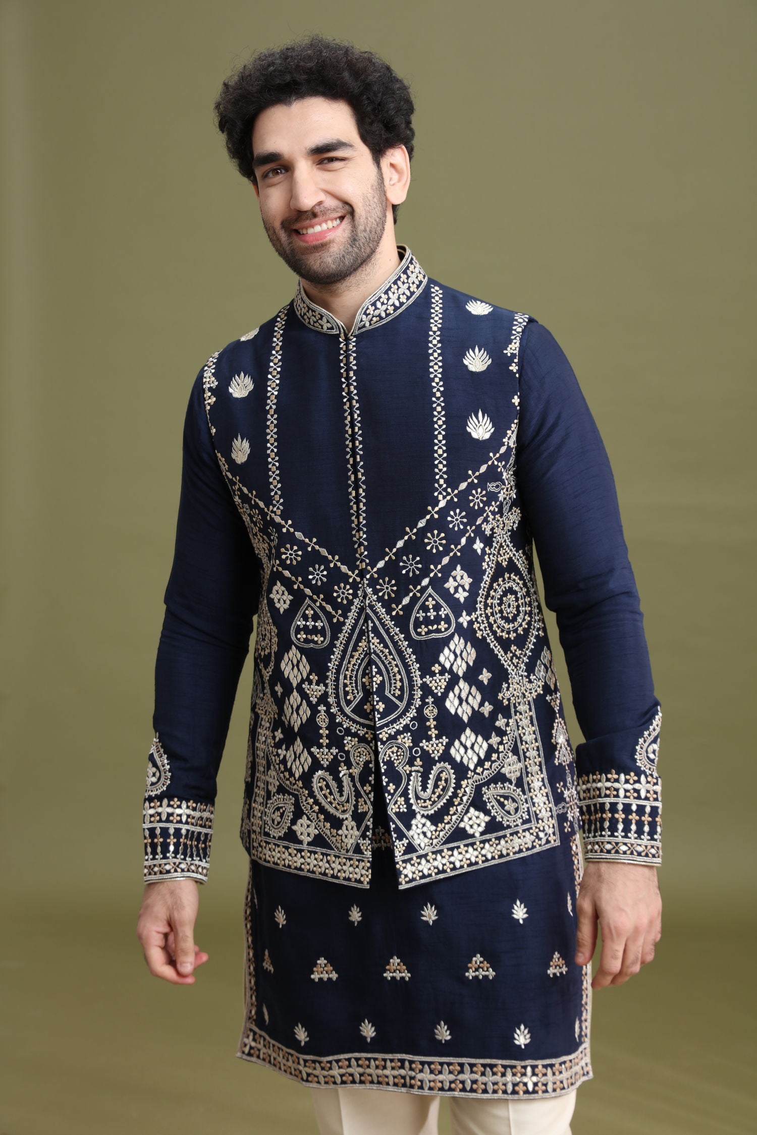 The jacket features a button closure and a geometric embroidered design, finished with elegant resham thread work that adds traditional detailing while keeping the look refined. It is layered over a matching kurta and paired with a cream Aligarhi, creating a clean and well-coordinated ethnic ensemble.