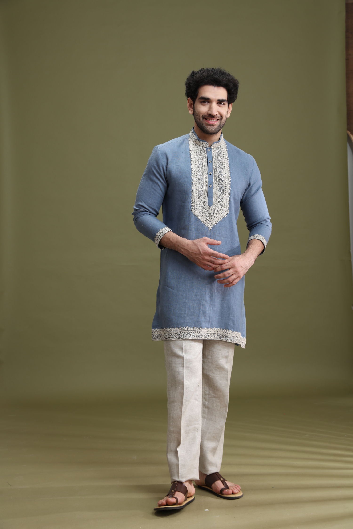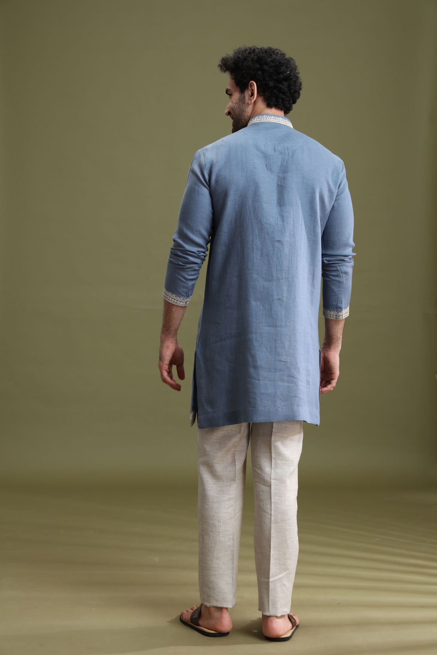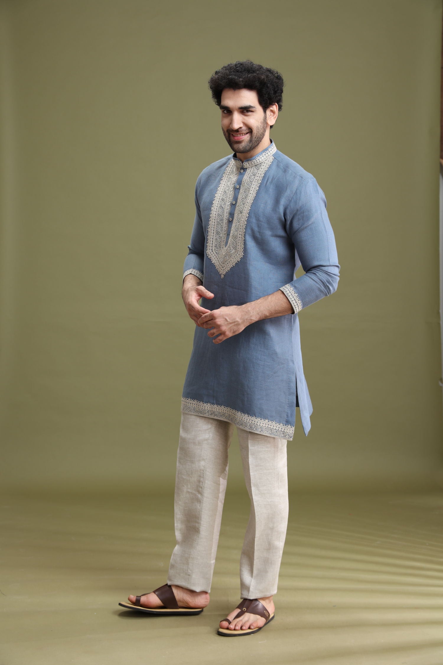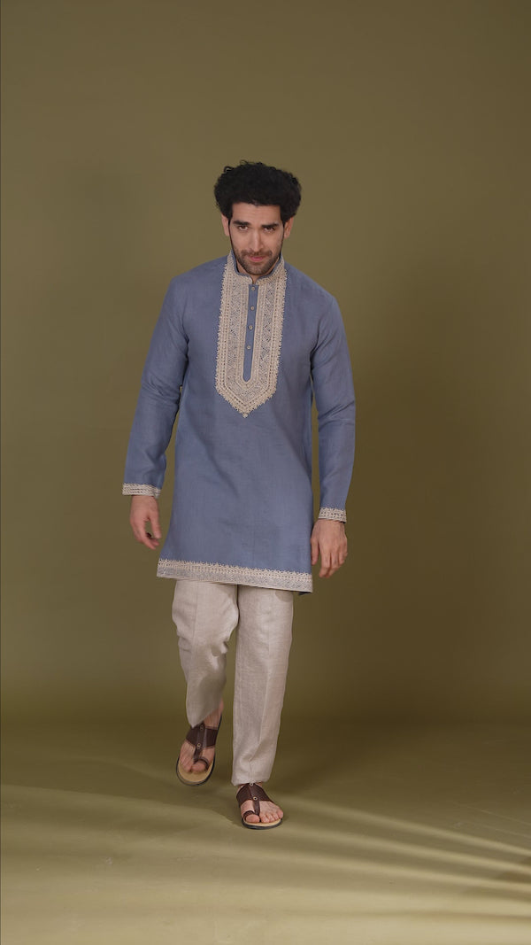 This Blue Linen Short Kurta Set for Men by Kora is designed for casual and festive occasions. The short kurta is crafted from linen fabric, offering a breathable feel and comfortable wear.