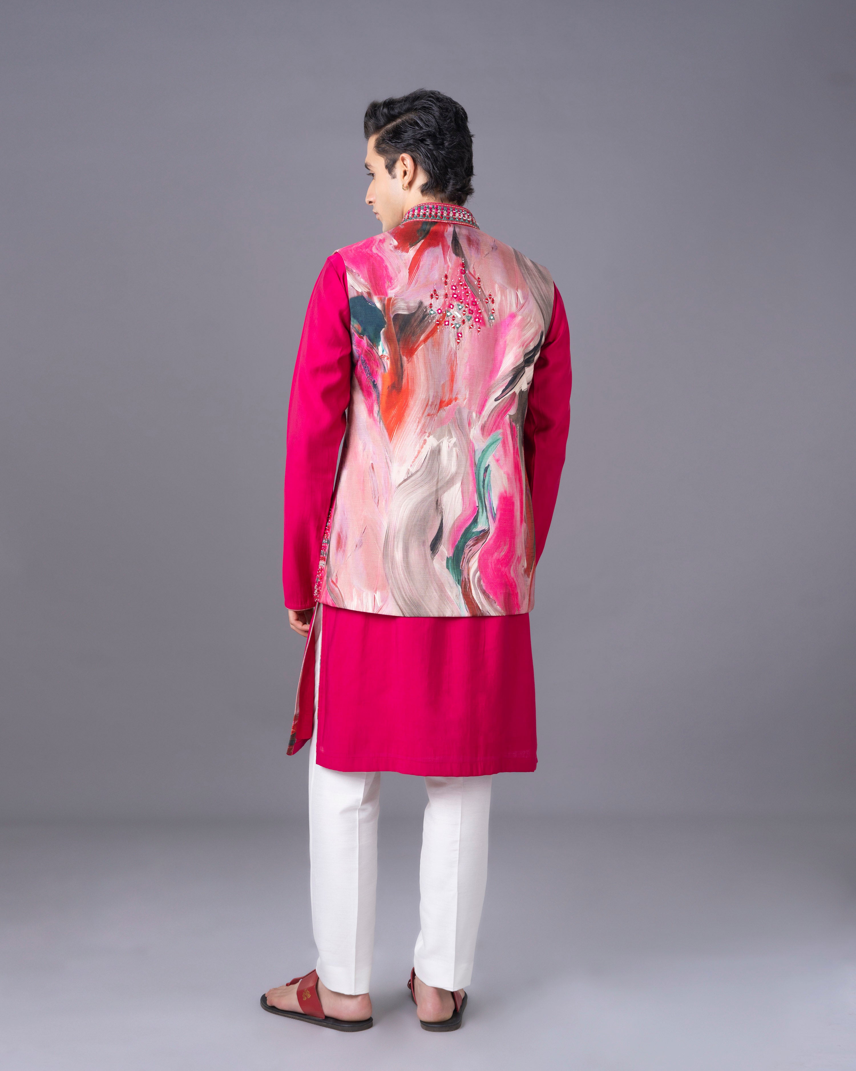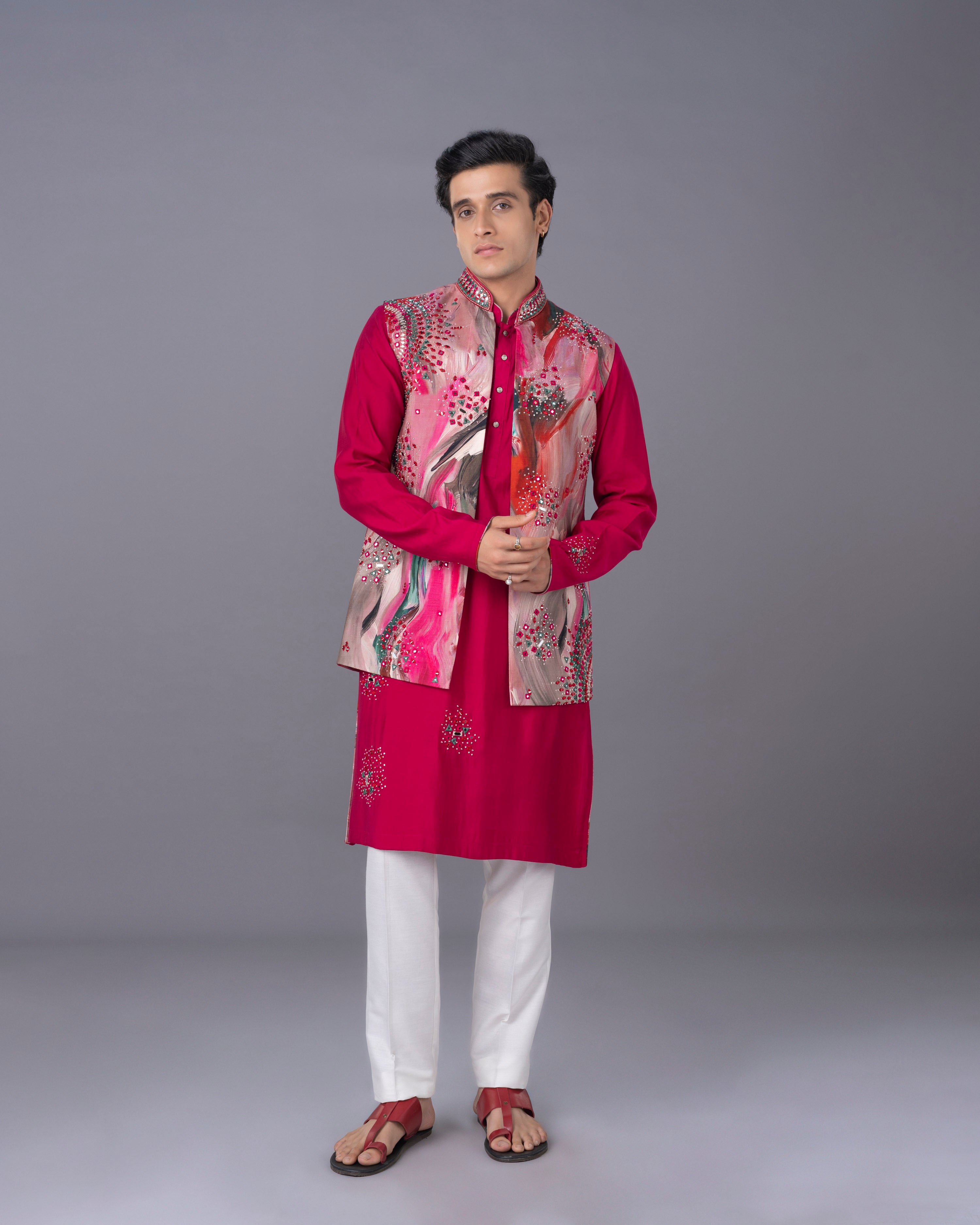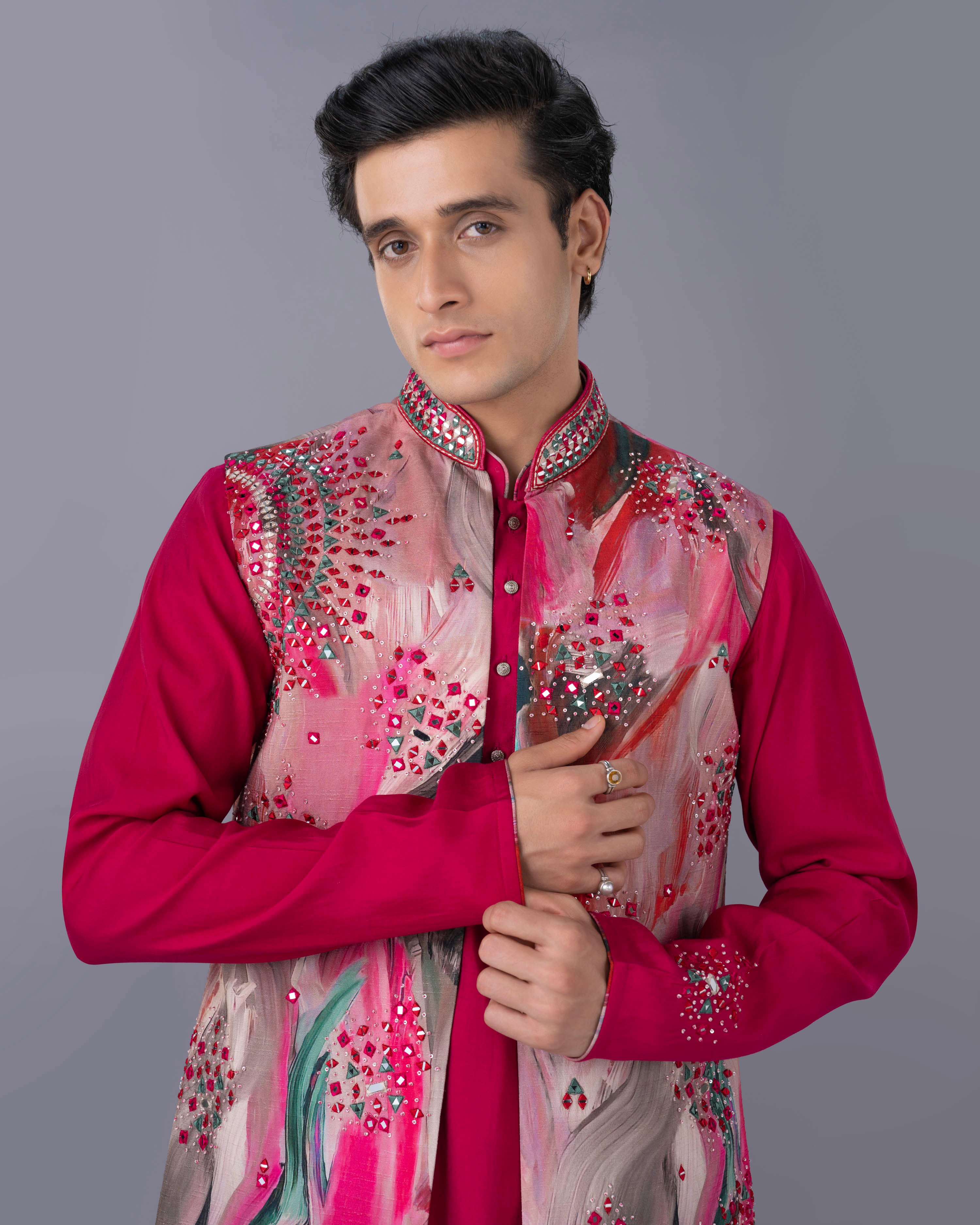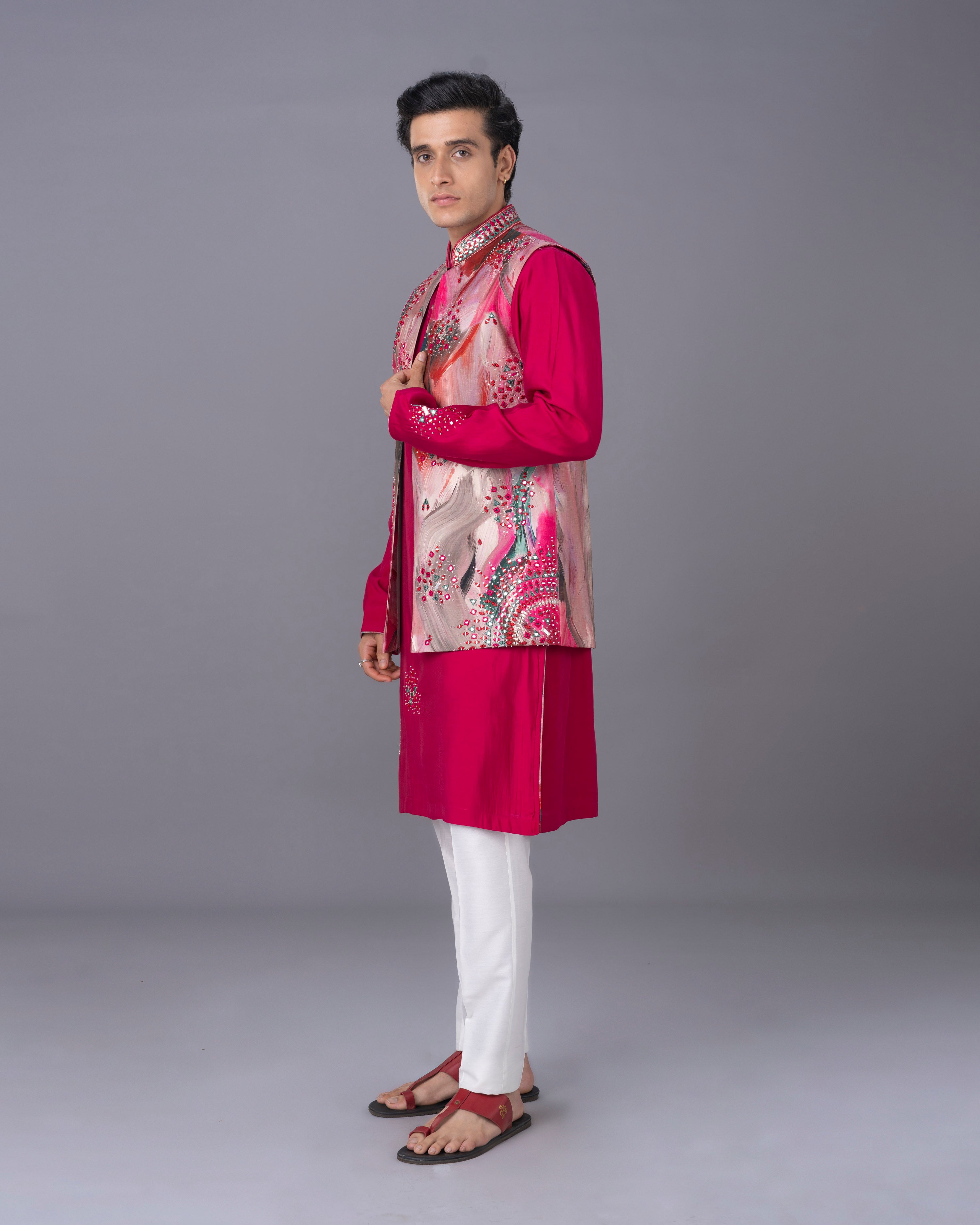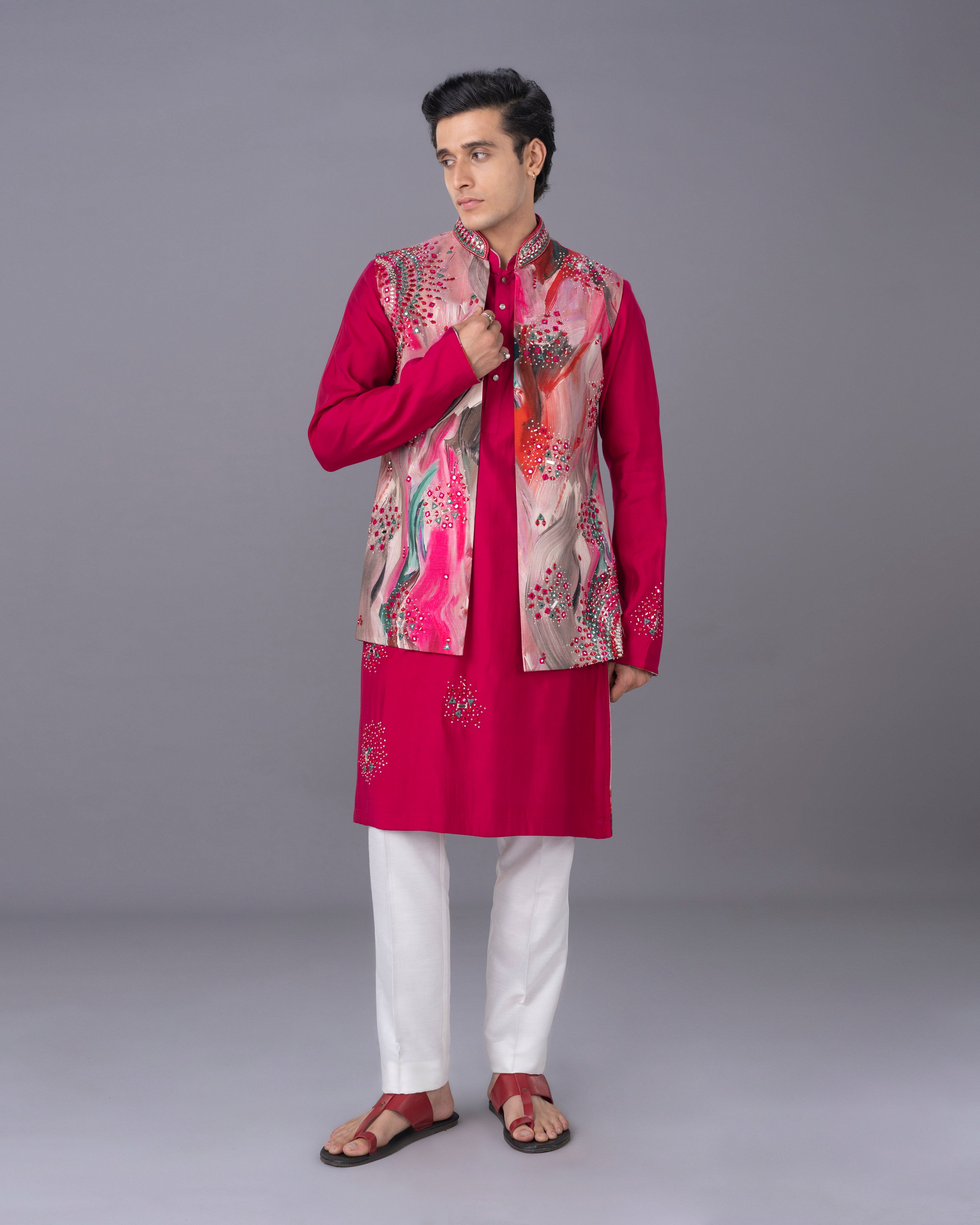 Radiate charm in our Pink Kurta Jacket Set, a perfect blend of tradition and contemporary style.The luxurious feel of tussar silk in a vibrant pink hue forms the foundation of this stunning outfit, which includes a chic kurta a jacket and a perfectly tailored alighari.Ideal for festive occasions, casual gatherings, or everyday elegance, this set promises both comfort and a captivating look.