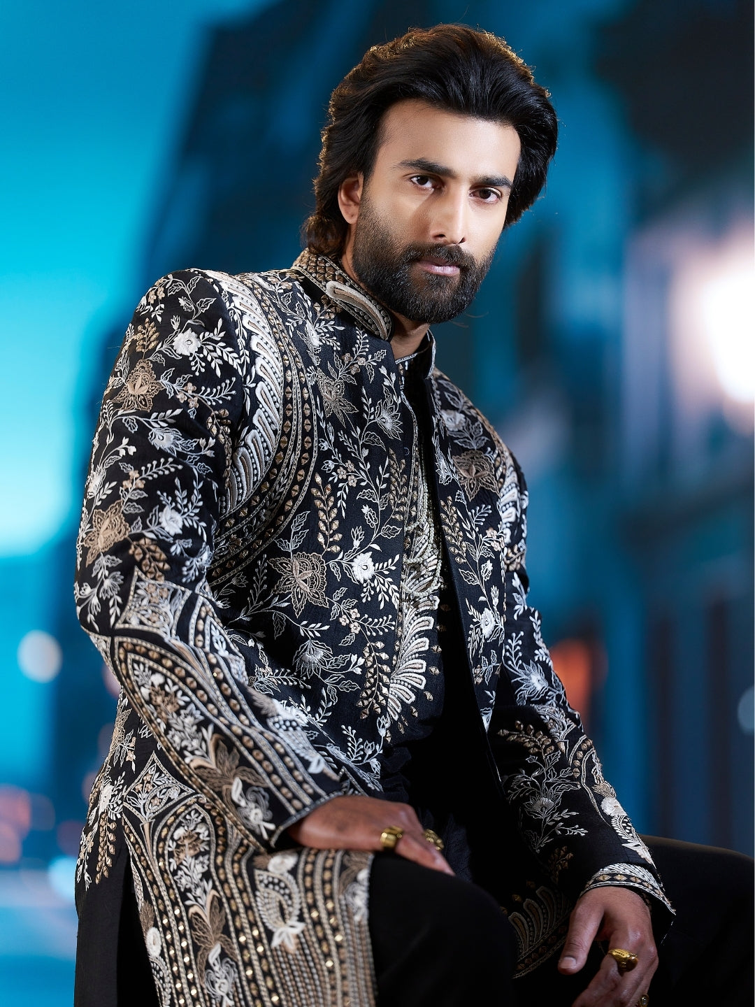 The all-black palette, complemented by subtle embroidery highlights, makes it a versatile statement piece suited for both day and evening functions. Pair it with mojaris or patent-finish shoes to complete the look.