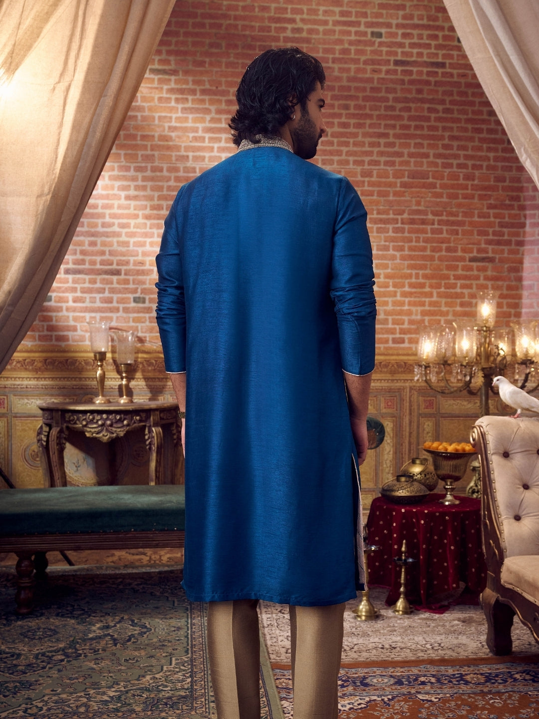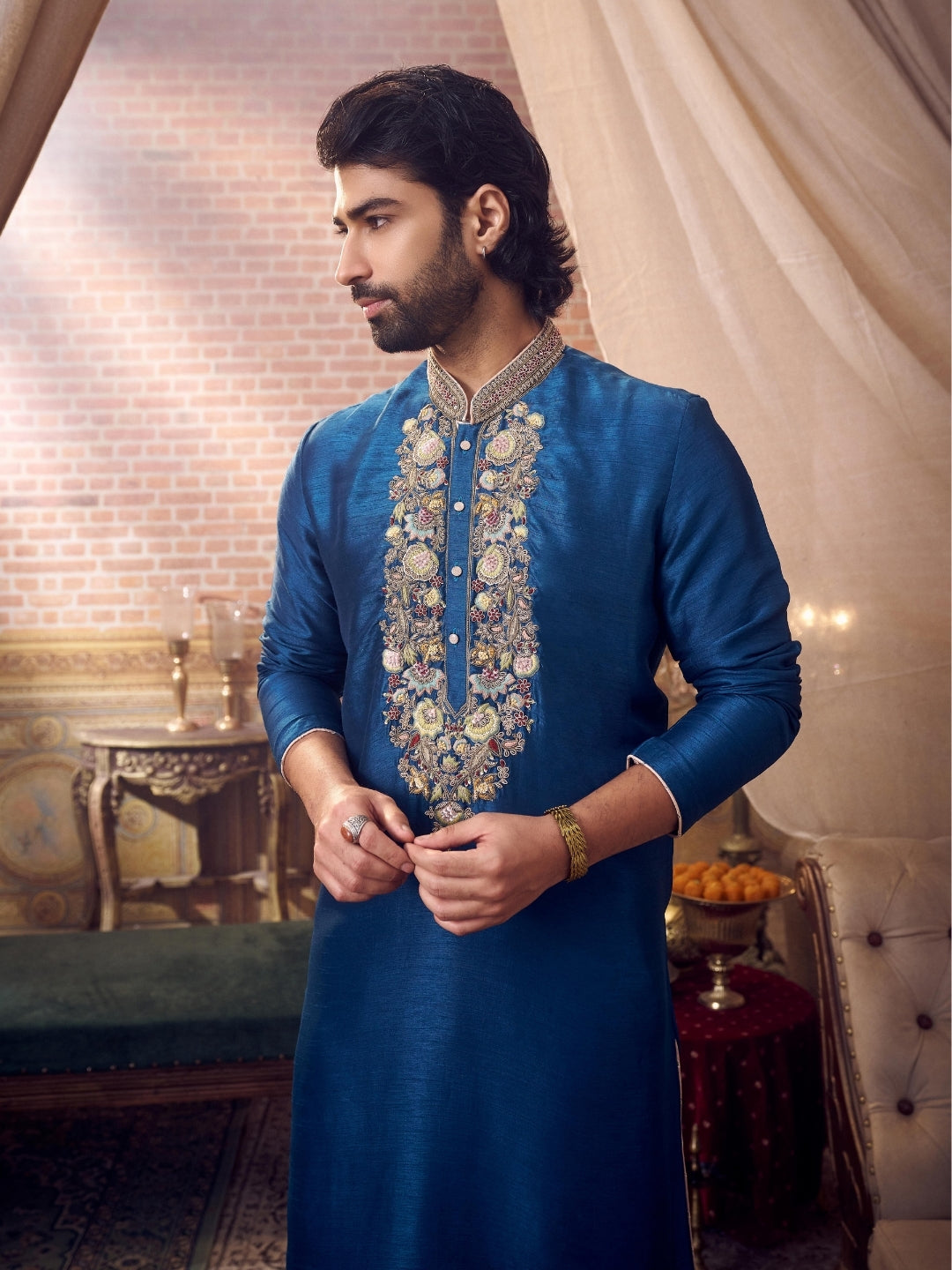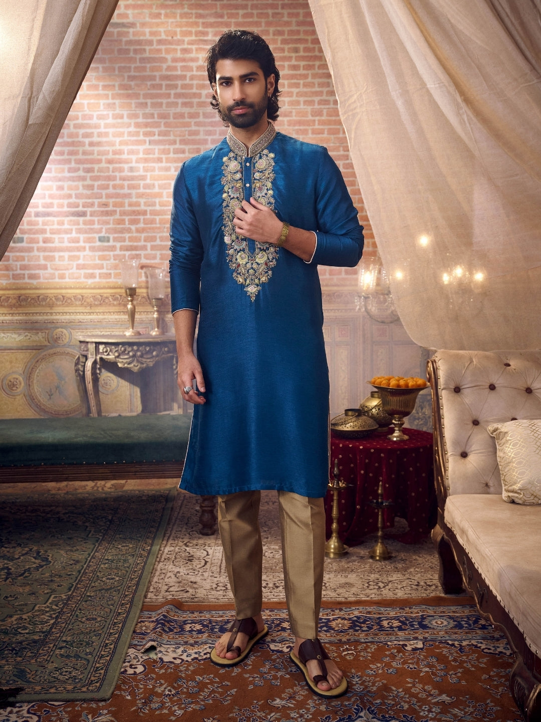 This Rama Mysore Silk Kurta Set showcases intricate embroidery paired with antique gold aligarhi bottoms. Perfect for festive occasions and traditional celebrations, it exudes sophistication and timeless elegance.