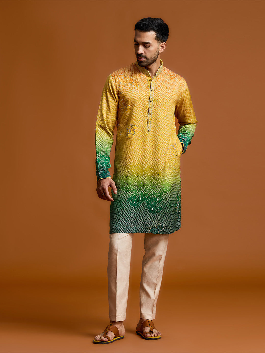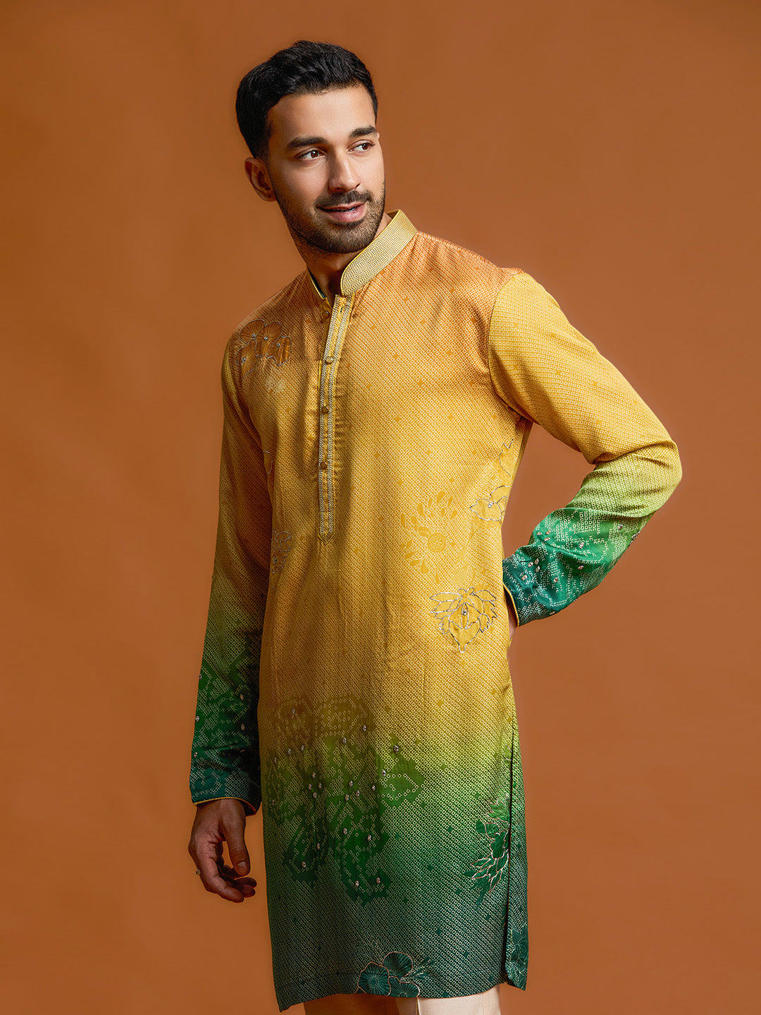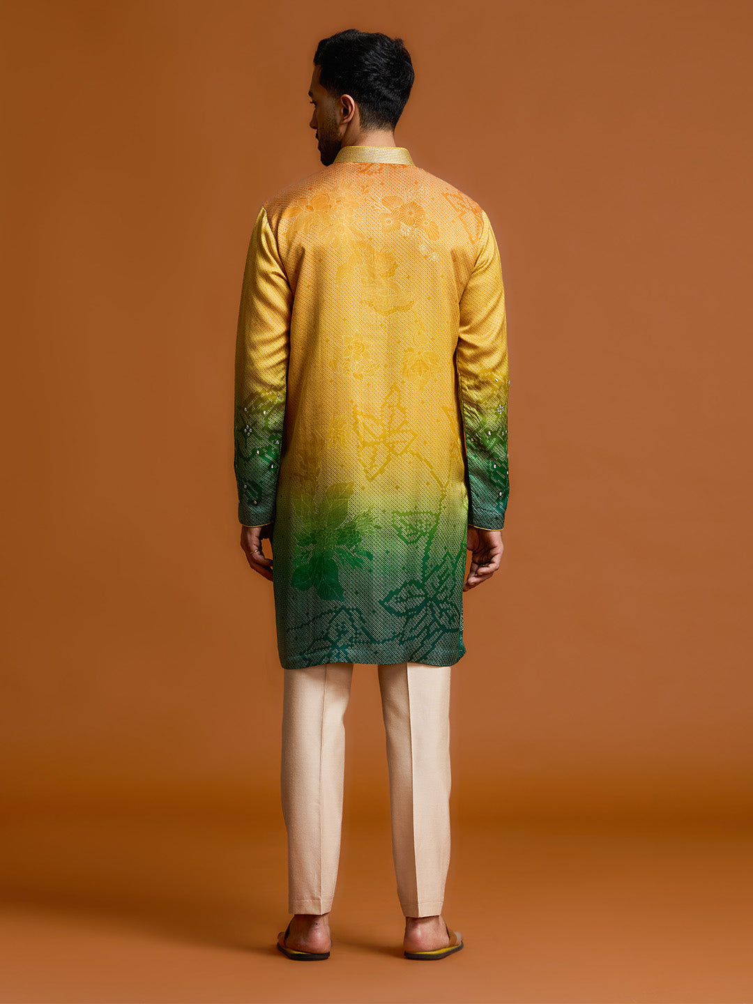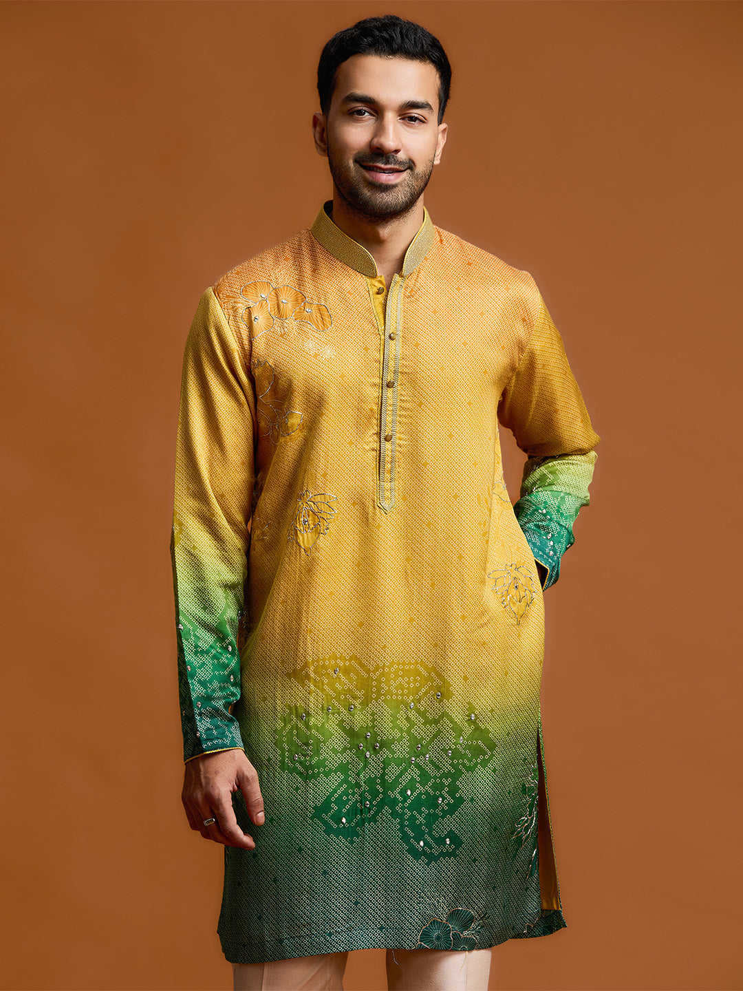 Illuminate any festive occasion with this mustard-to-green ombre kurta set, crafted from a premium silk-satin linen blend. This piece masterfully combines a vibrant marigold upper with a deep emerald gradient, adorned with intricate floral embroidery motifs that celebrate rich cultural heritage with a contemporary edge.