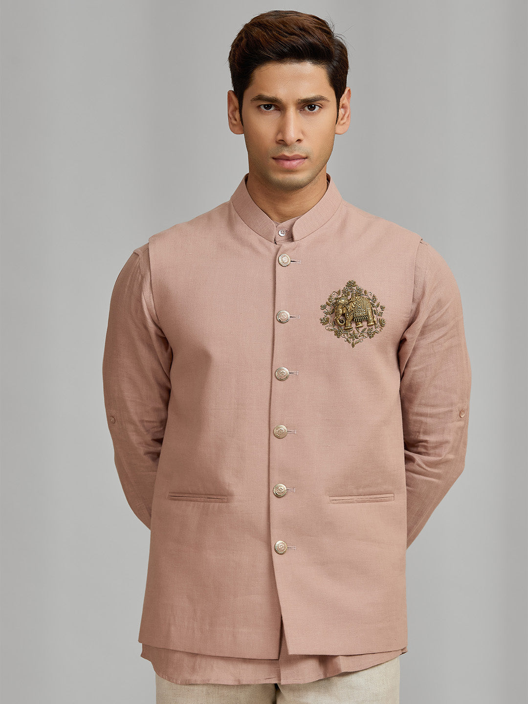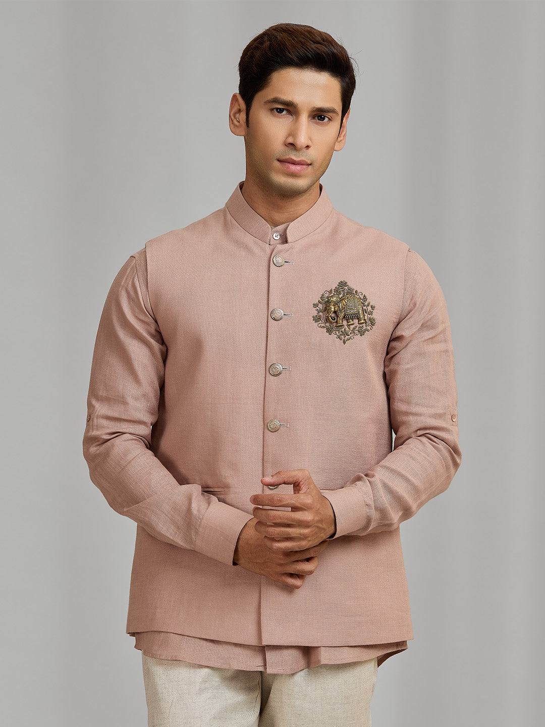 Men’s Dark Peach Linen Bandi Shirt in Regular Fit