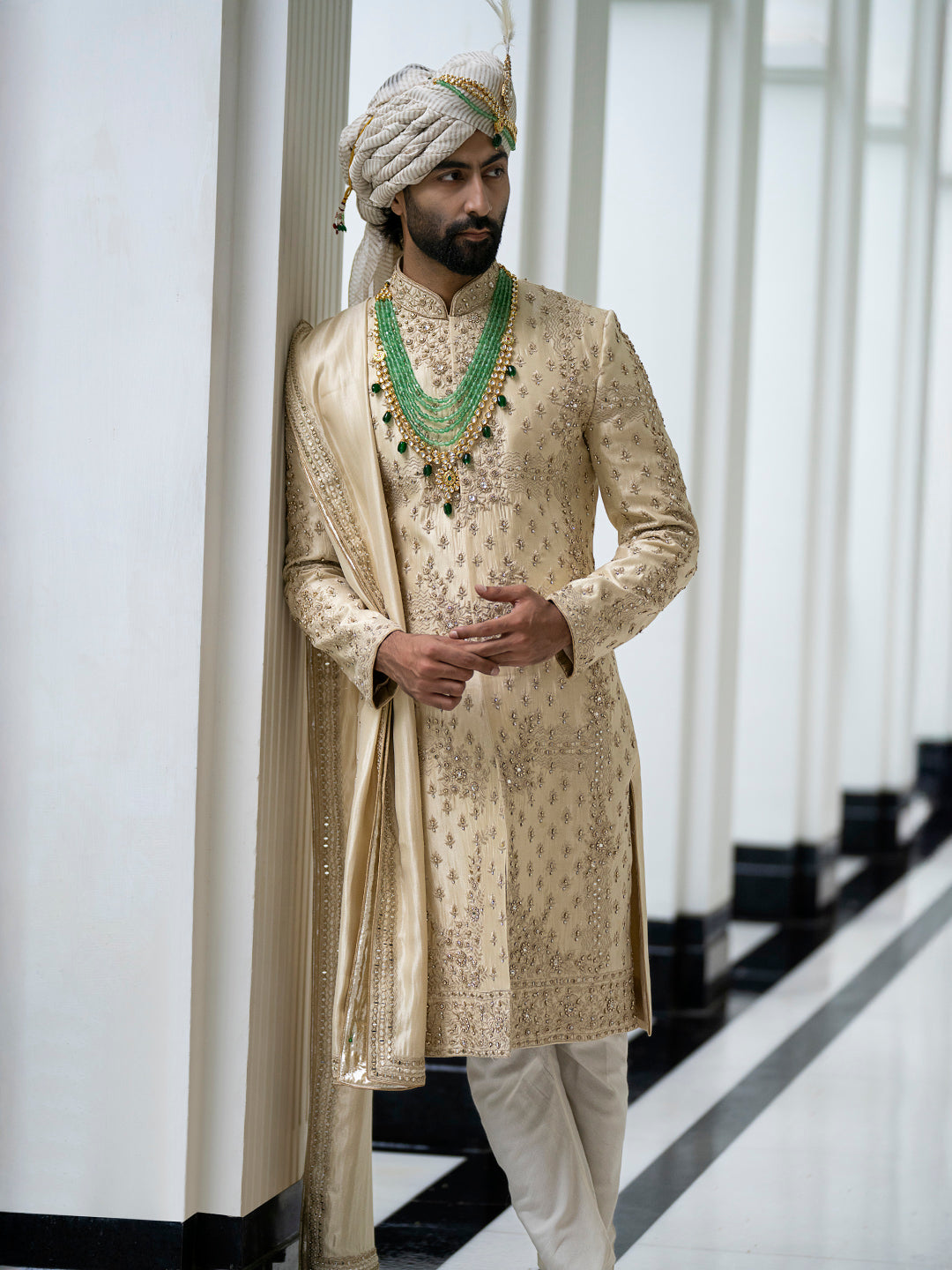 Grace every celebration with timeless elegance in this light gold Sherwani from Kora by Nilesh Mitesh, designed for the groom who values subtle luxury and classic tradition. Crafted from lustrous Tissue Silk, the ensemble is elevated with fine embroidery work that enhances its richness without overpowering its grace. Complete with an embroidered dupatta and crisp white churidar, this look is ideal for weddings, engagements, and festive ceremonies.