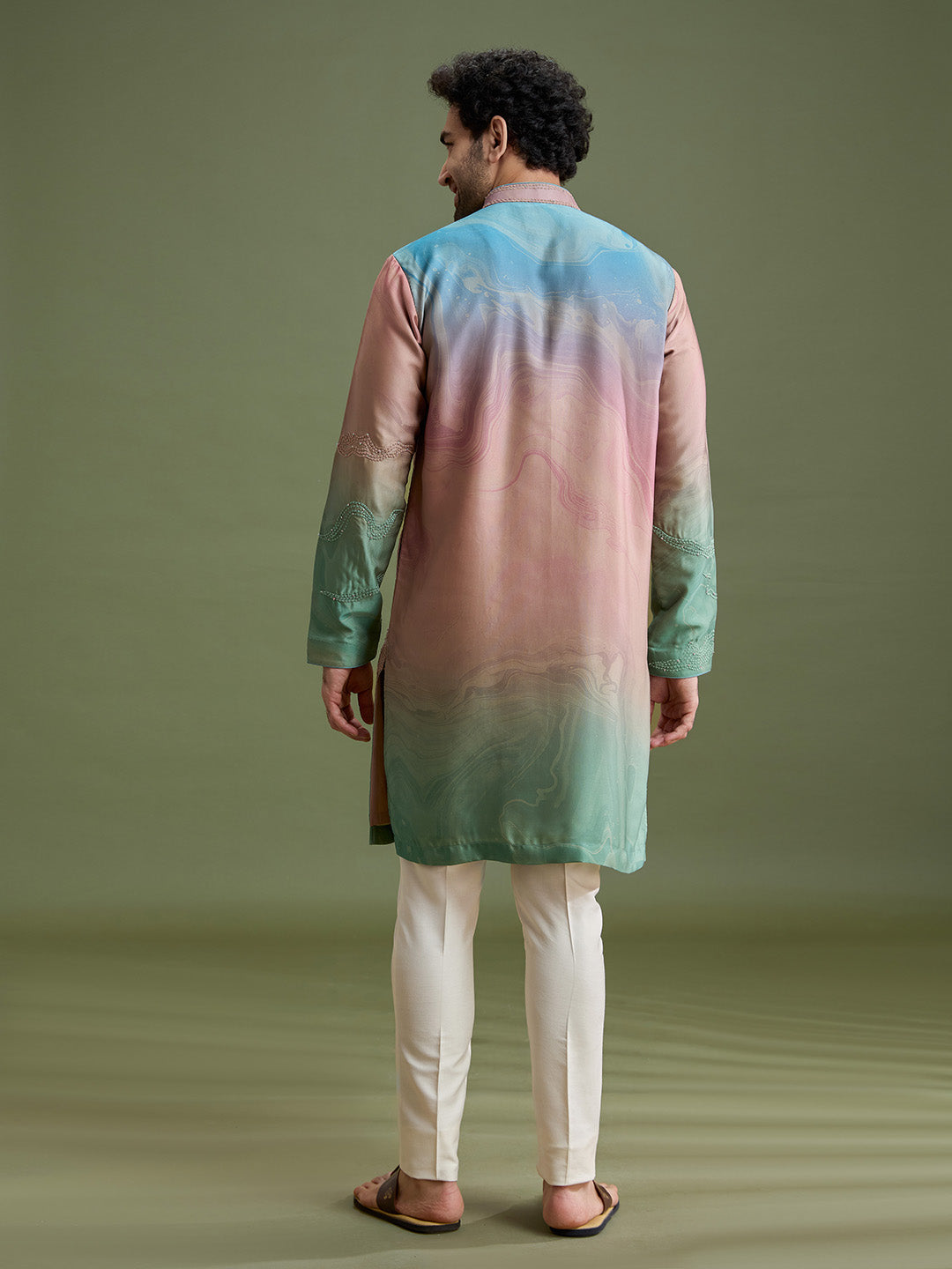 Back view of multicolor blended silk kurta set for men
