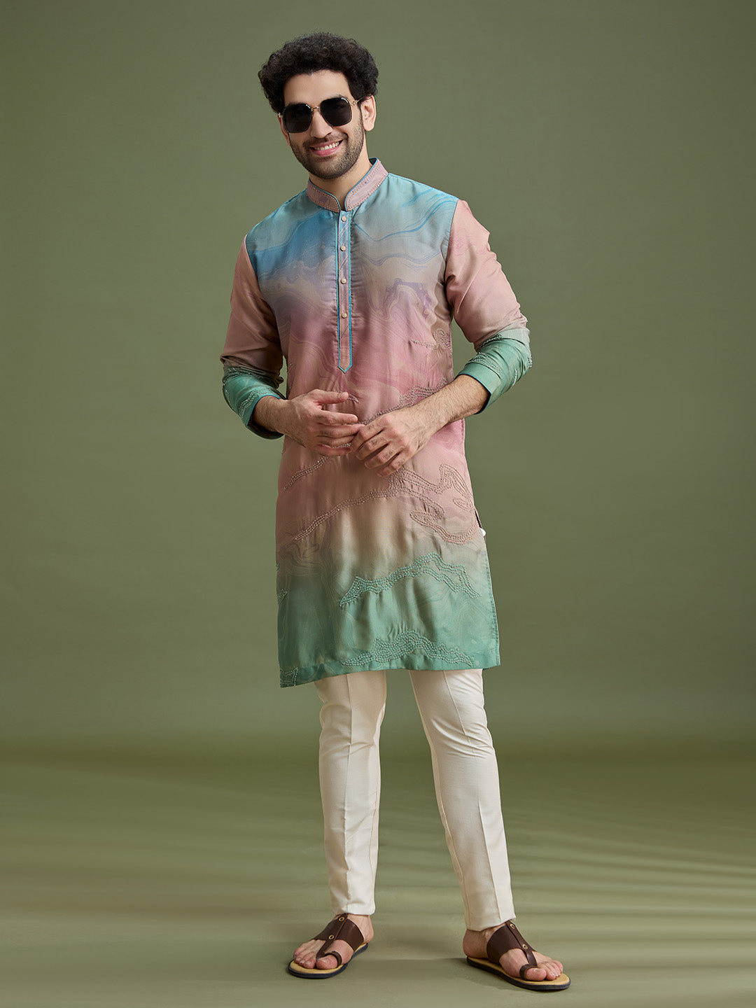 Styled ceremonial look of multicolor blended silk abstract kurta set for men with cream aligarhi