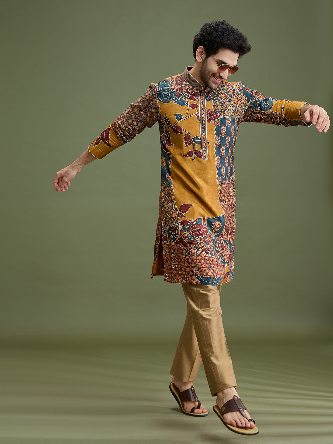 Paired with an antique gold Aligarhi bottom, this kurta set creates a visually striking and well-coordinated ethnic ensemble ideal for celebratory occasions.