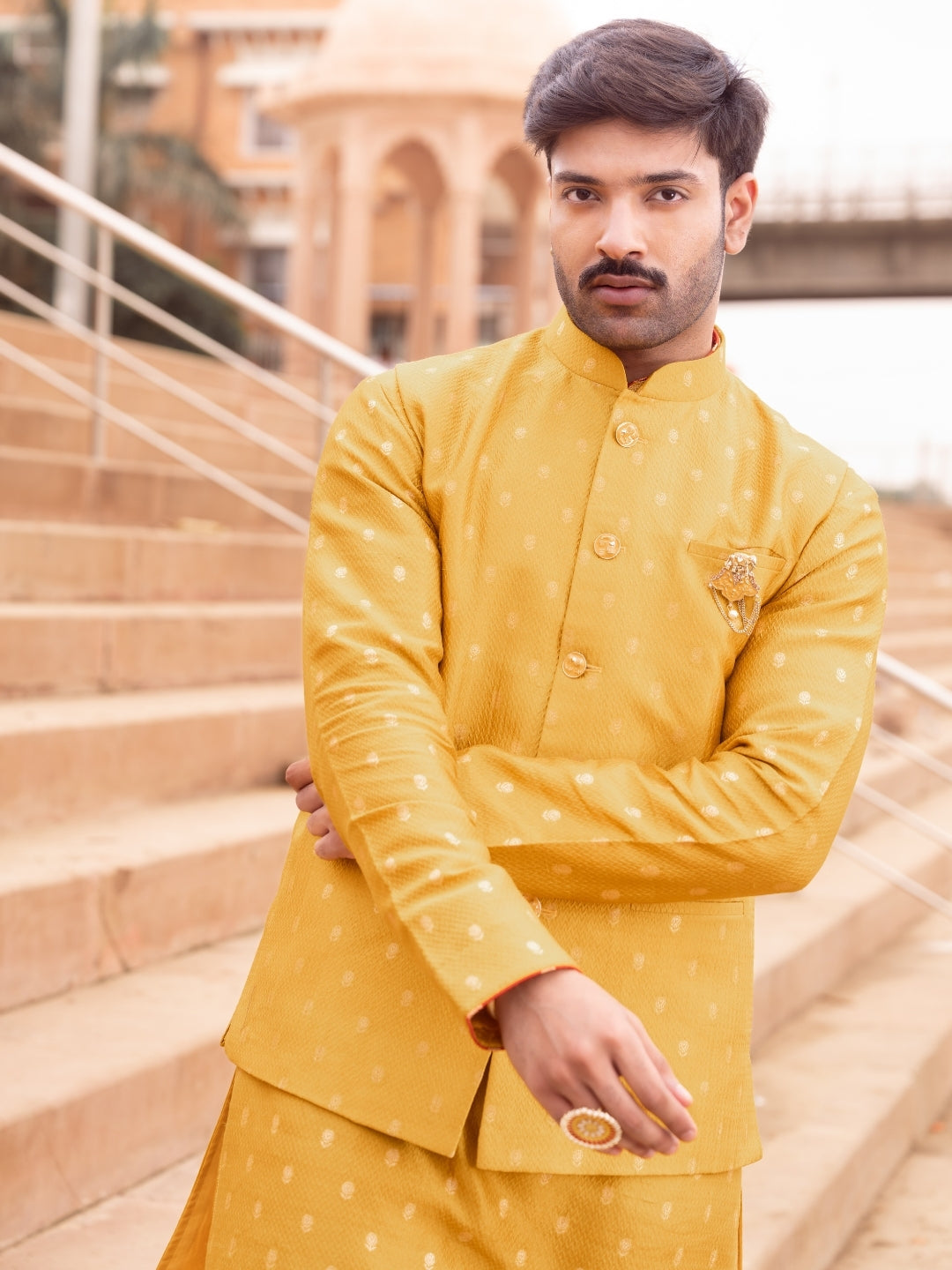 Mustard Brocade Silk Bandi Set for Men – Kurta & Aligarhi