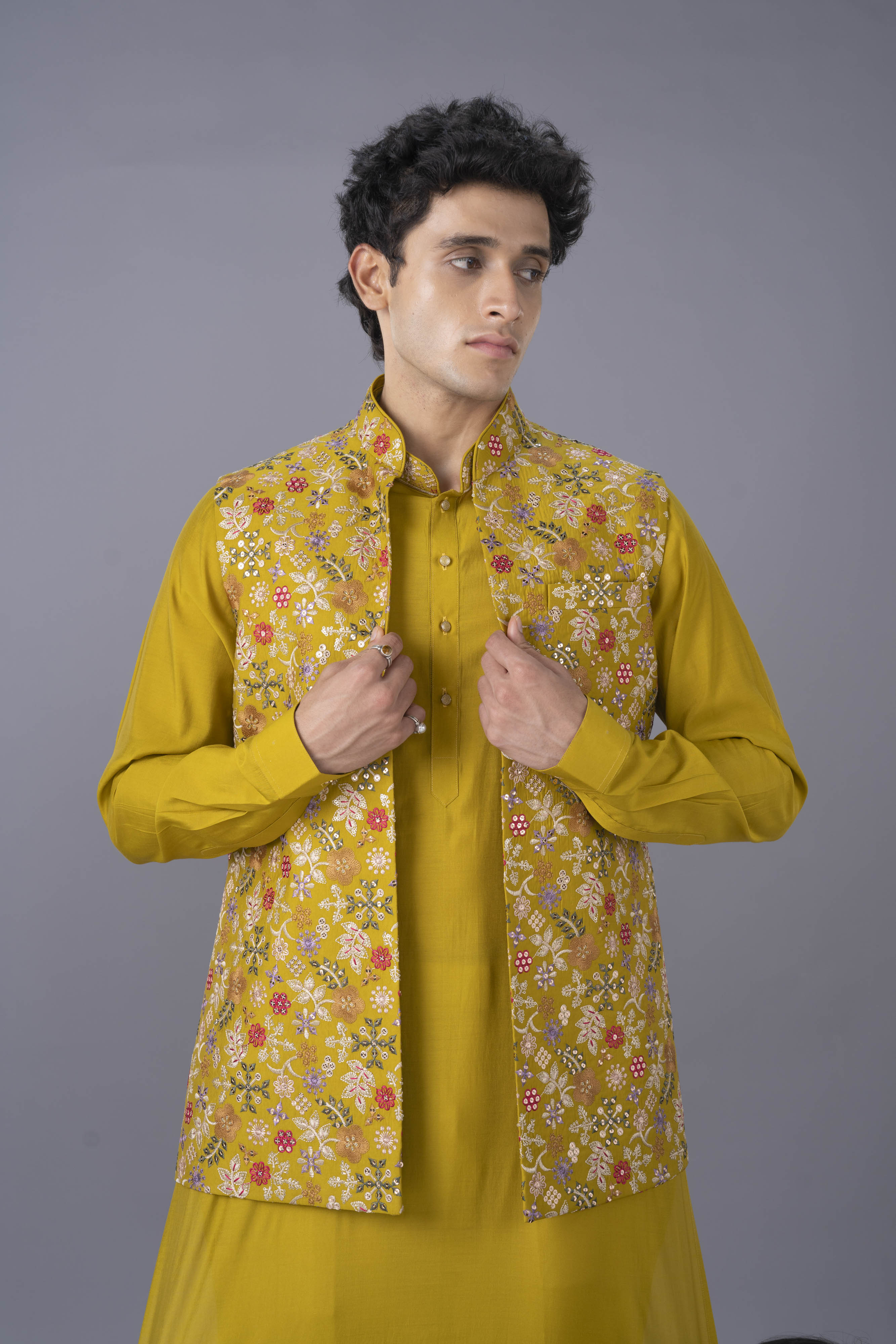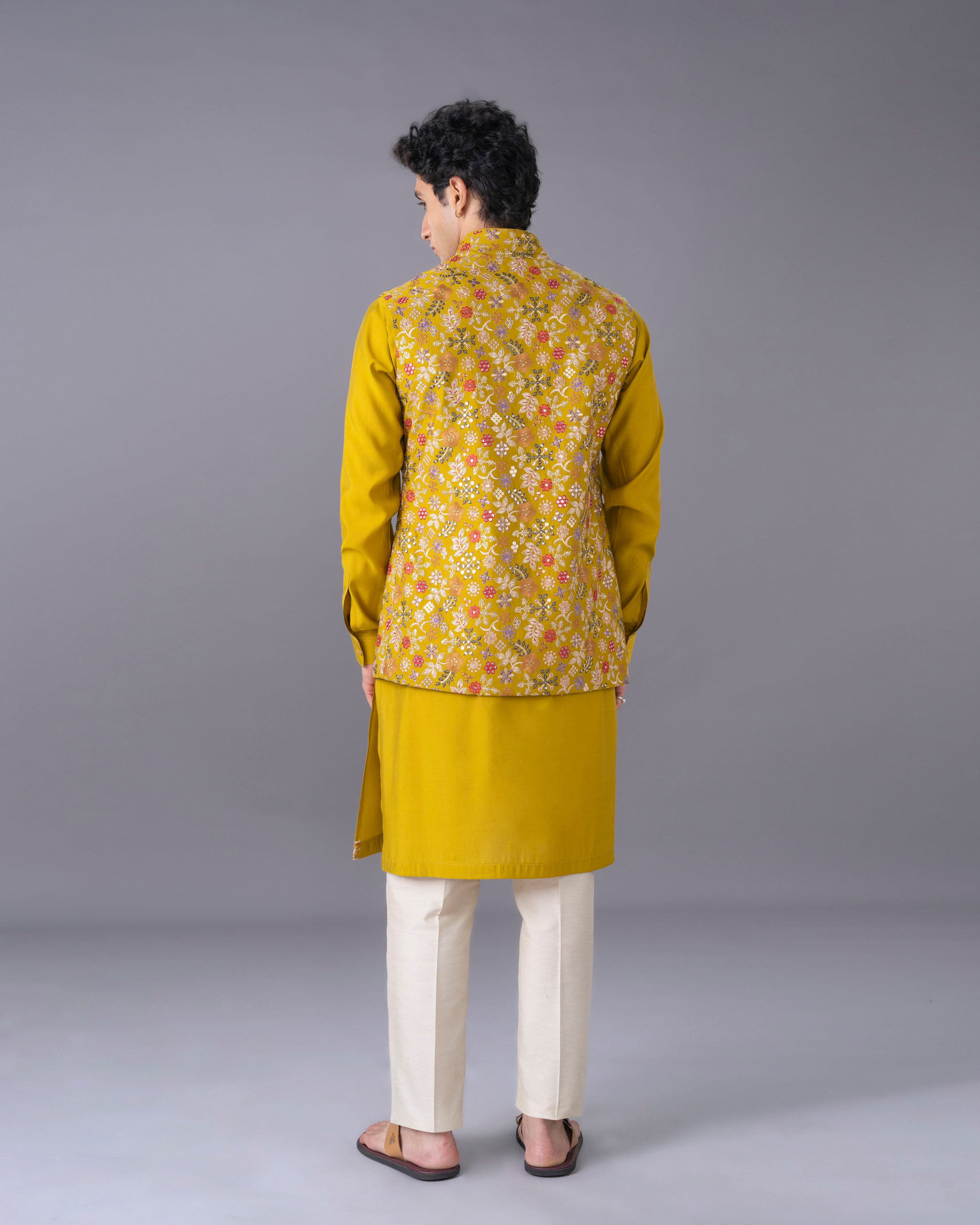 Mustard Silk Kurta Jacket Set with Alighari Bottom