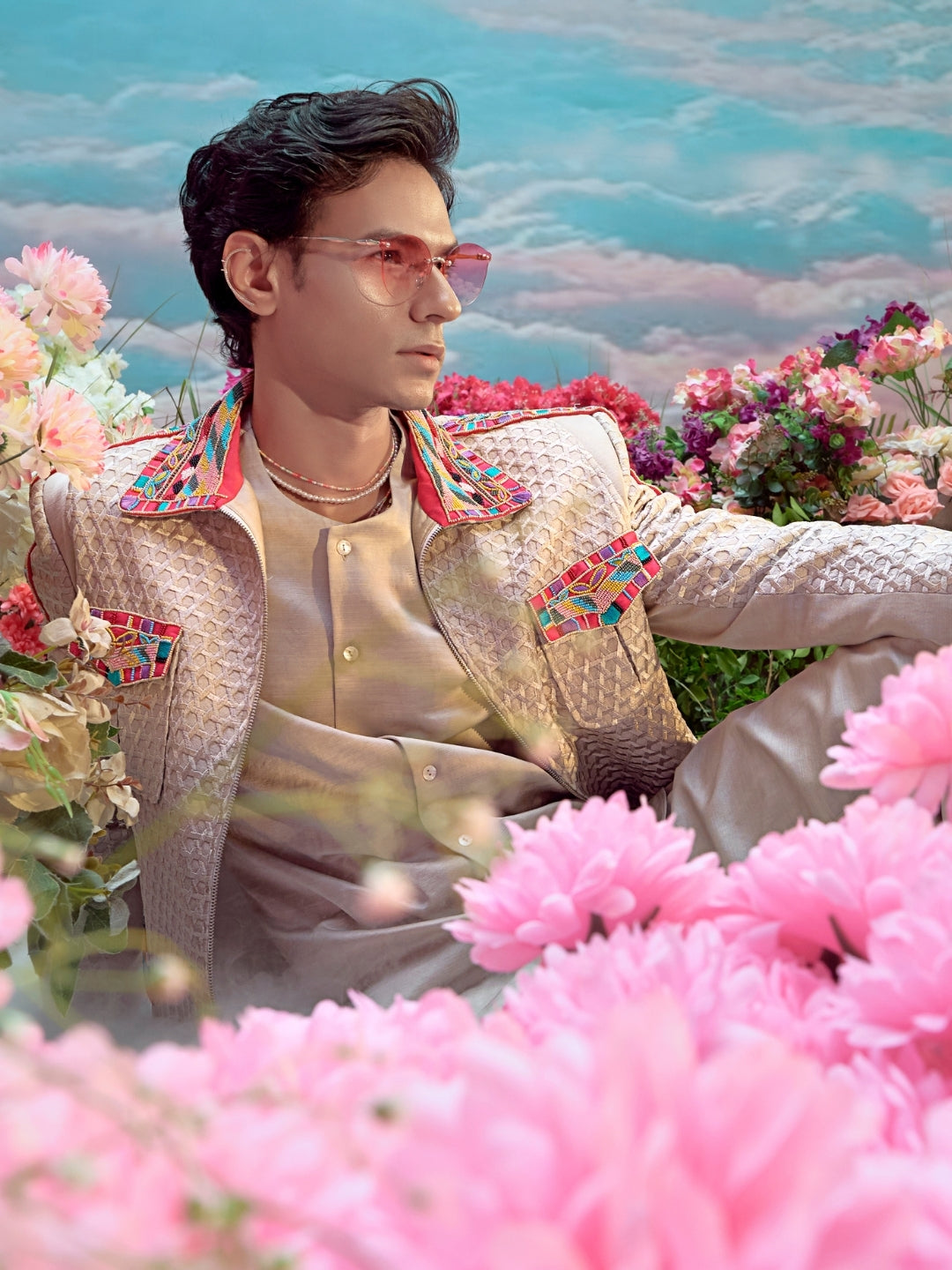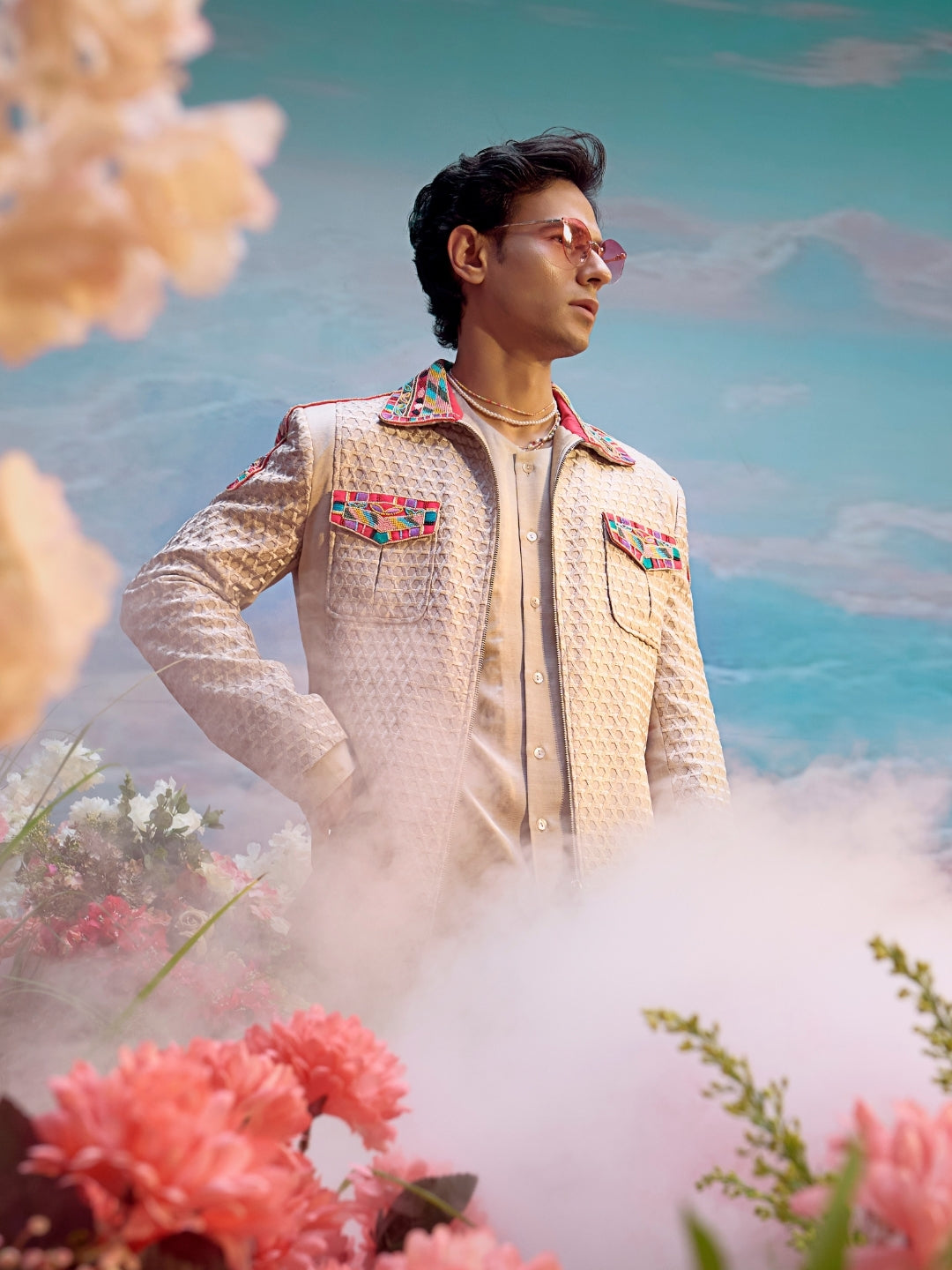 Disclaimer: Slight colour variations are possible due to photographic lighting or your monitor settings. Carnival Collection Description: A refined natural satin linen Jodhpuri set with elegant embroidery, designed to capture the essence of festive sophistication. A timeless Carnival essential."