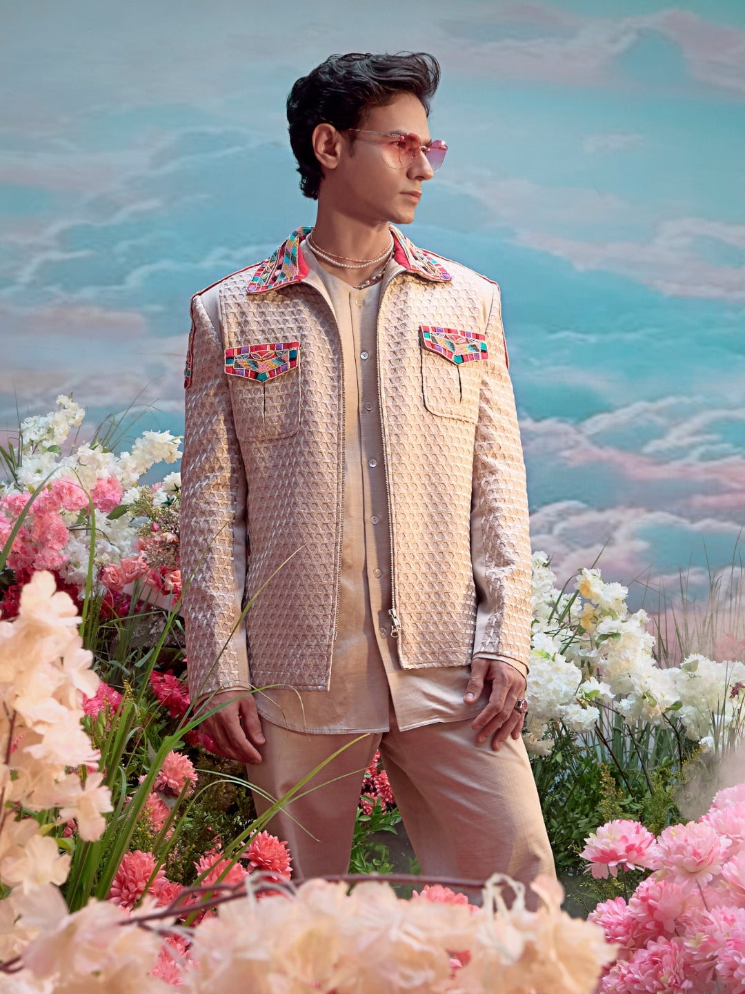 Natural Satin Linen Jodhpuri Set with Embroidery – Carnival Collection