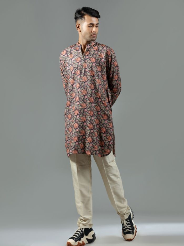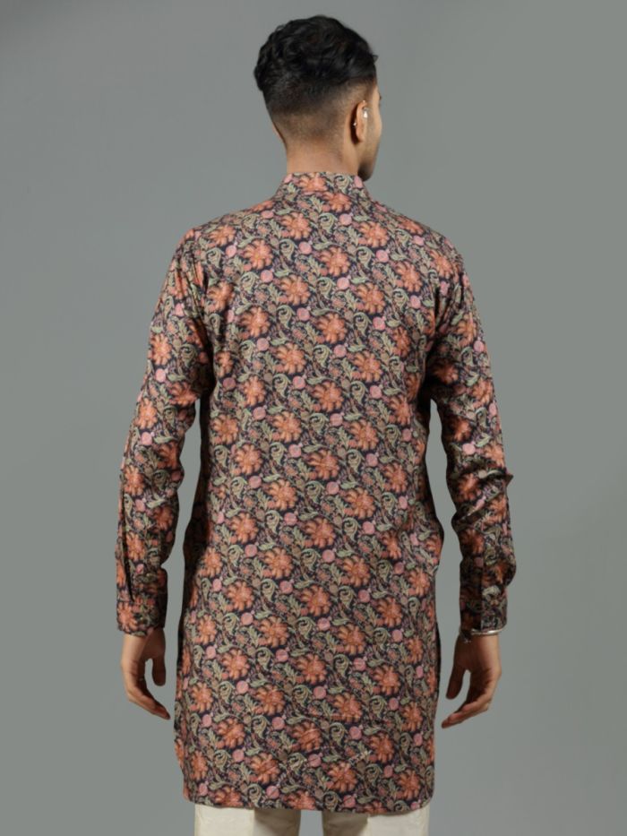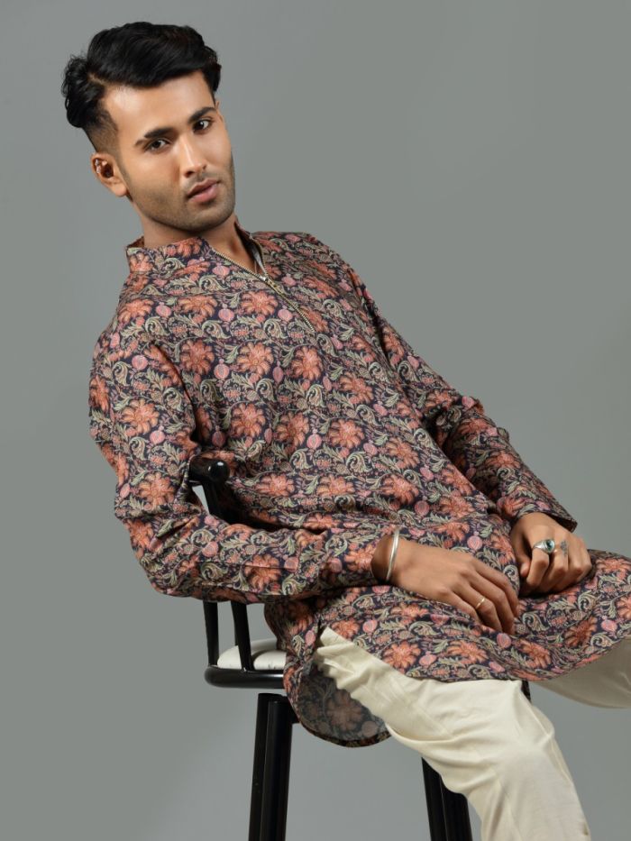 Navy Blue Floral Print Blended Silk Short Kurta Set