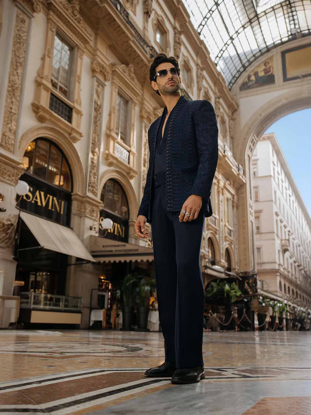The Indo-Western kurta features embroidery detailing, adding a refined touch while keeping the overall look clean and balanced. It is paired with matching navy pants, creating a coordinated and elegant ensemble.