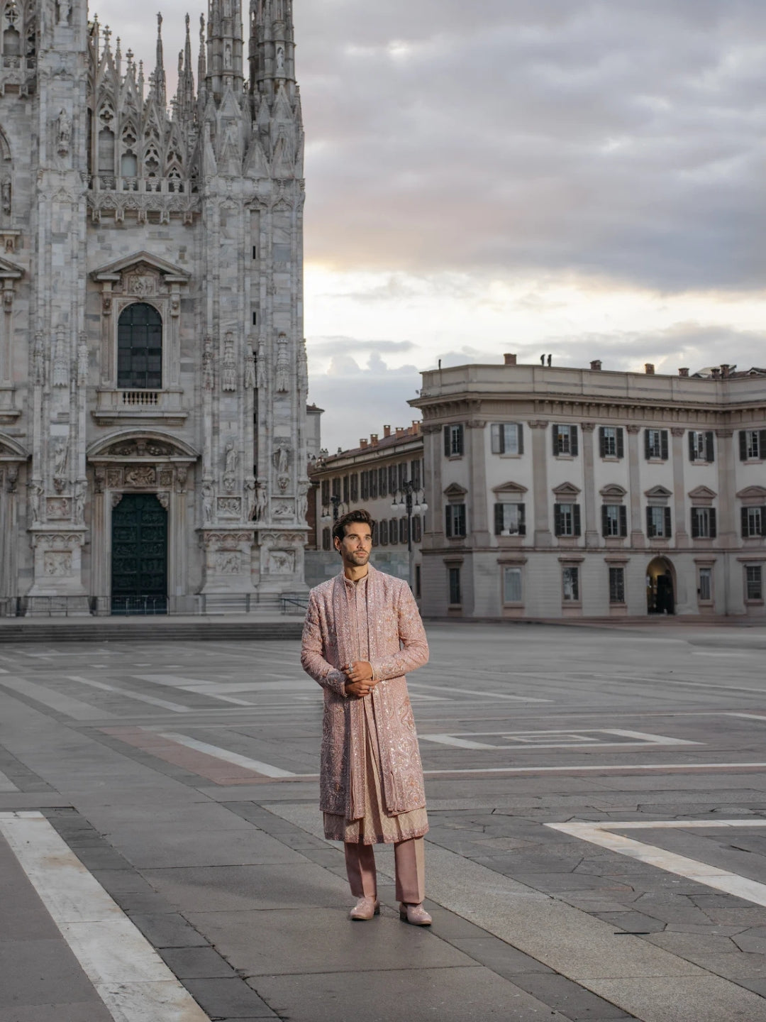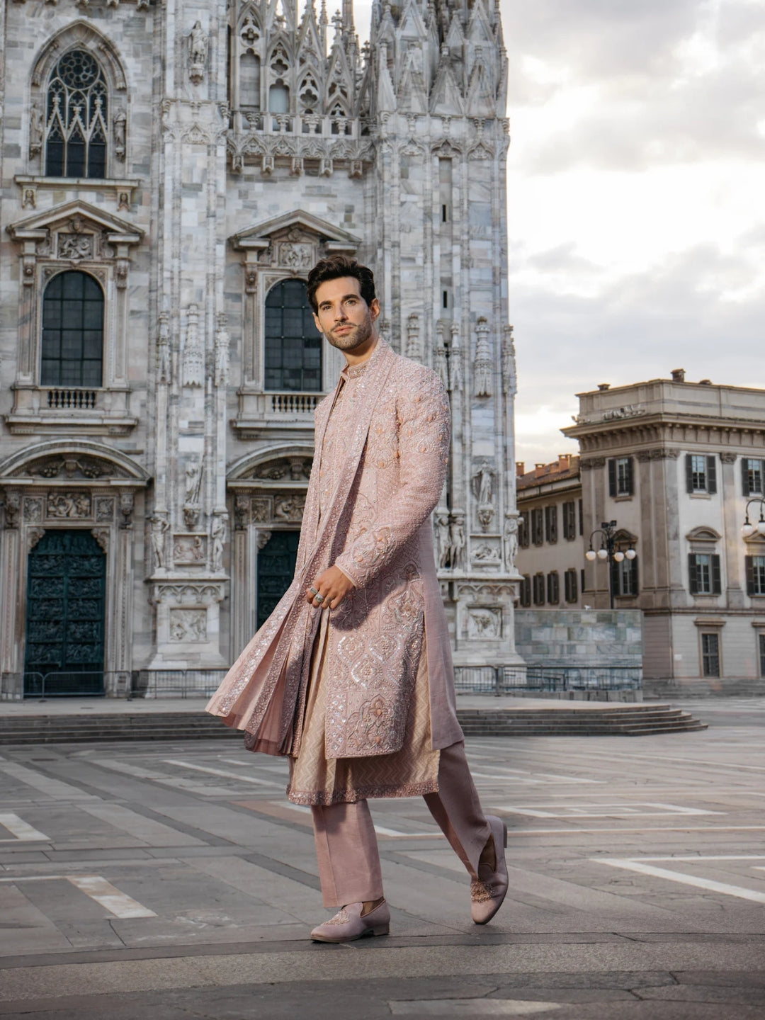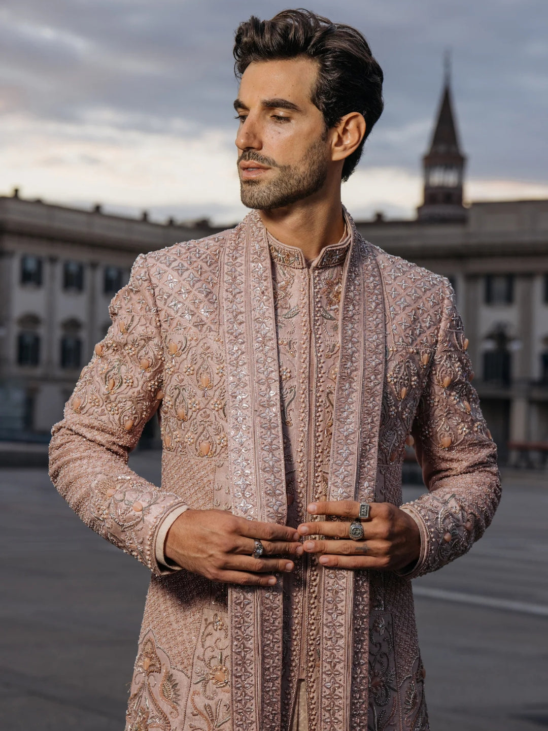 Step into regal elegance with this Dusty Mauve Sherwani Set, crafted from rich Raw Silk for a luxurious feel and royal sheen. The outfit features intricate hand work embroidery, adding exquisite detail and charm. Paired with a cream chudidar, it creates a balanced and refined look.