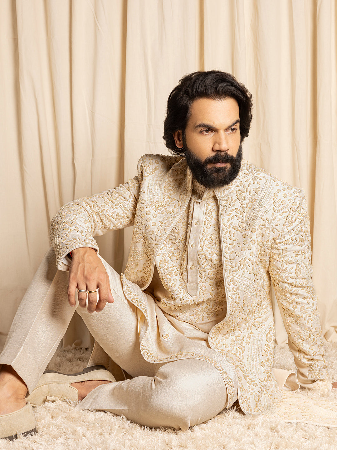Rajkummar Rao Biege Silk Heavy Embroidered Front-open Indowestern Kurta Set