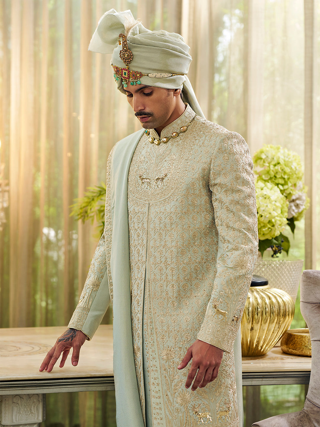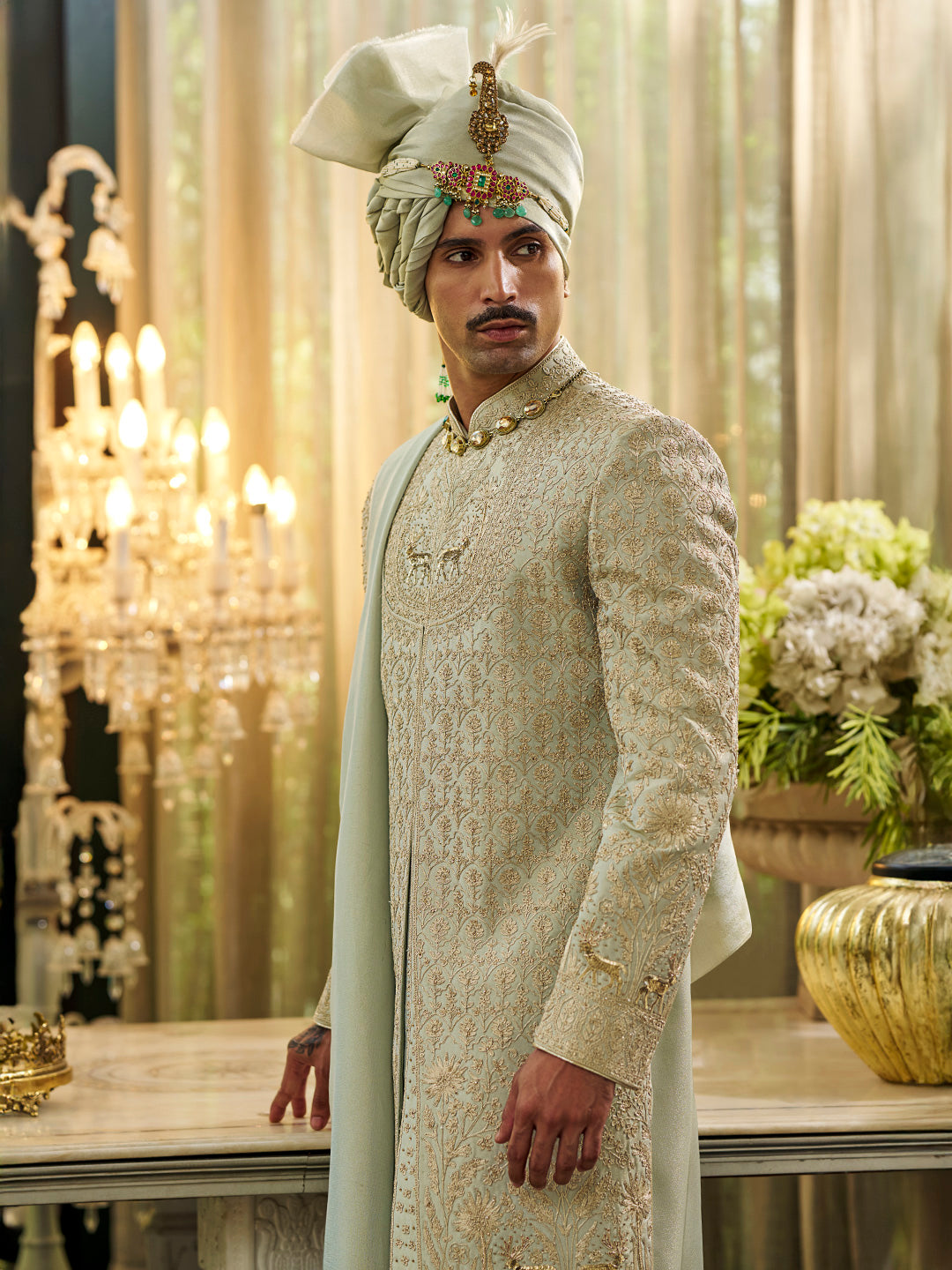 Regal Pista Sherwani in Soft Tissue Silk – Sheer Elegance for Grand Occasions