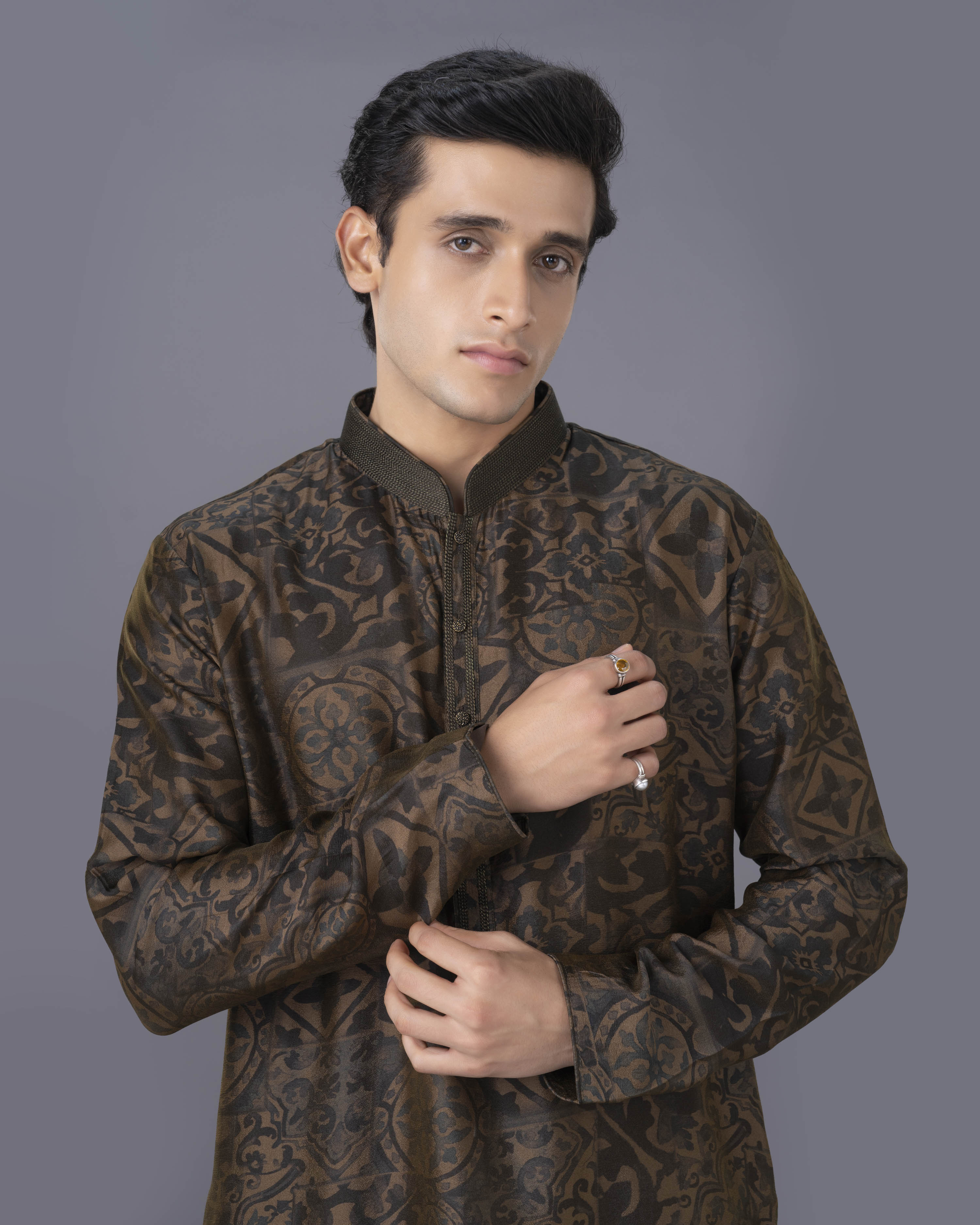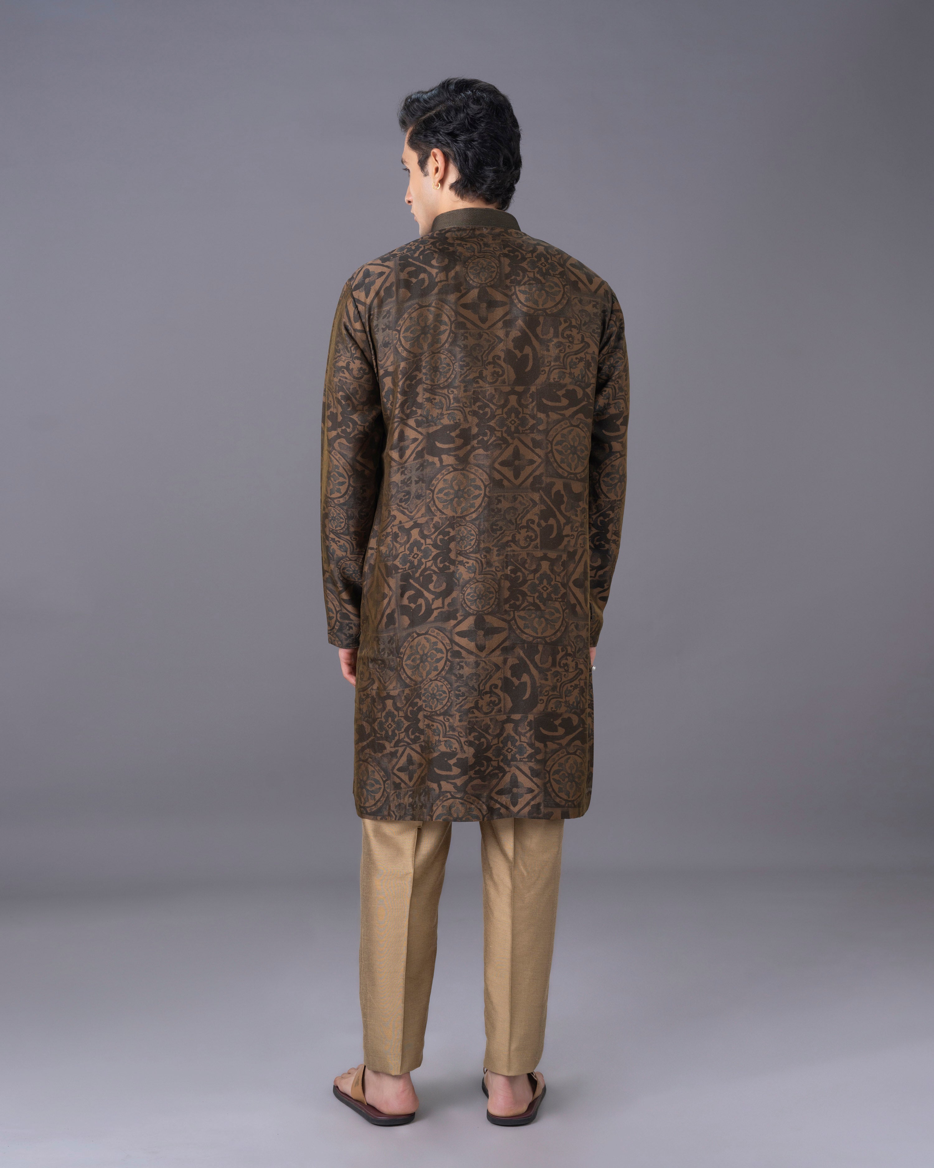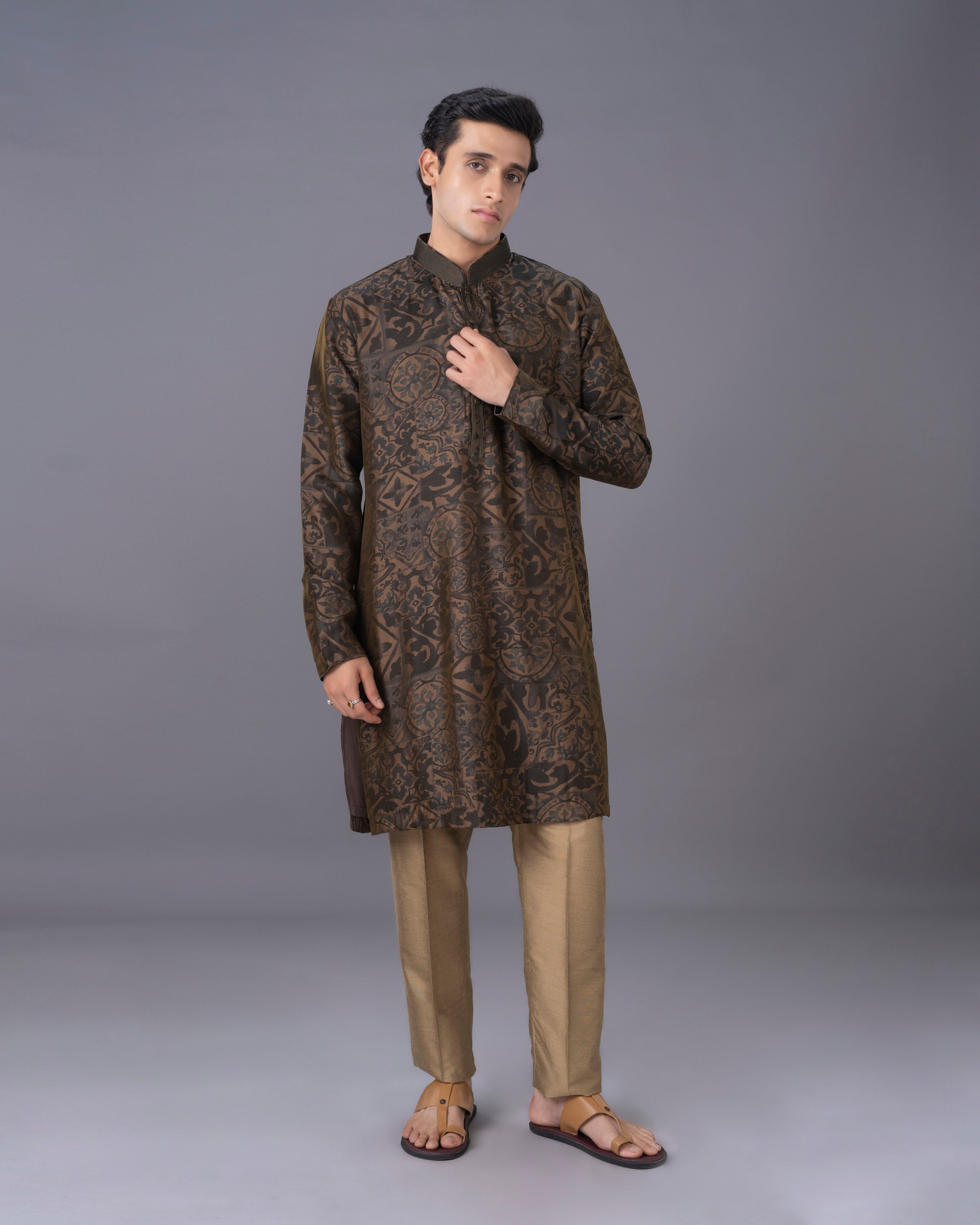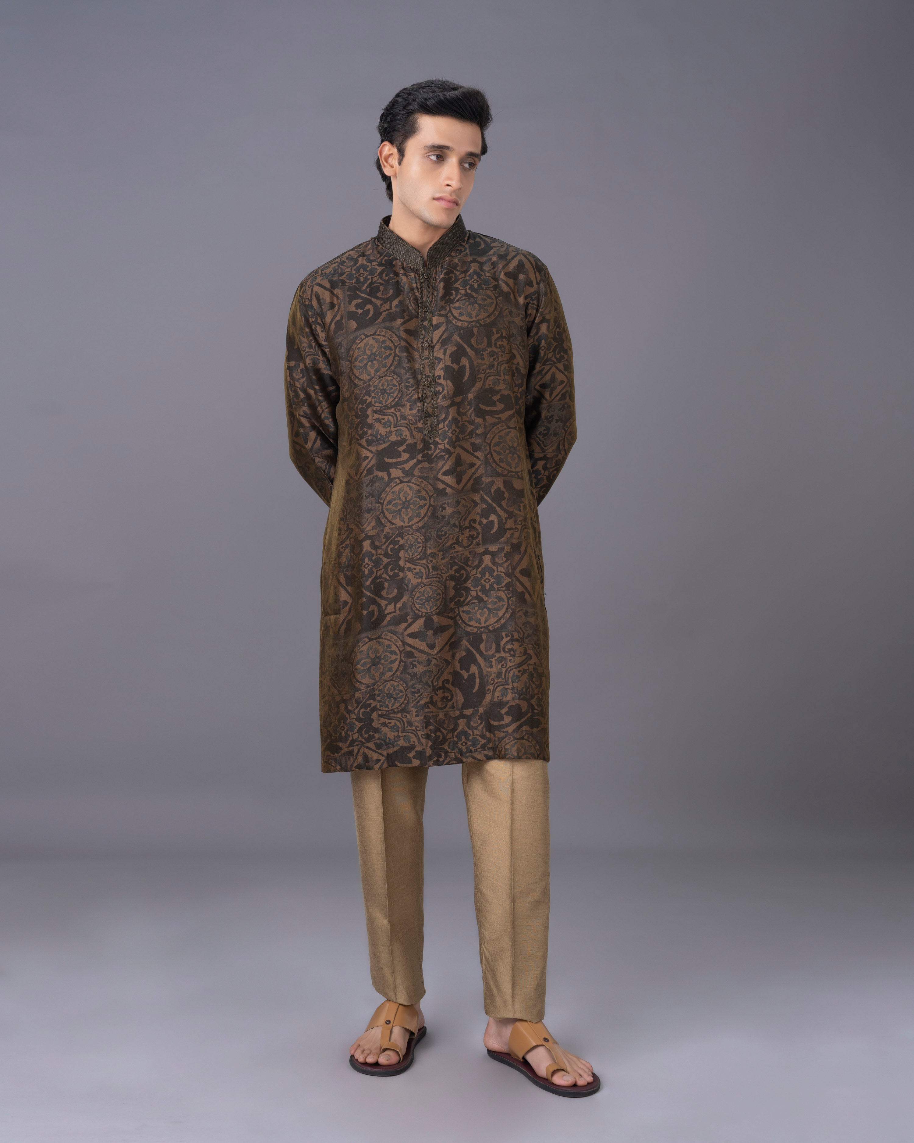 Discover refined comfort with our Olive Printed Munga Silk Kurta Set.This captivating ensemble features a beautifully printed kurta and a perfectly tailored alighari bottom, all in a rich, versatile olive hue.The premium Munga silk fabric provides a wonderfully soft feel against the skin, while the captivating print details infuse modern artistry. Versatile and effortlessly stylish, this set is designed to ensure you look and feel your best, whether it's a daytime event or an evening gathering.
